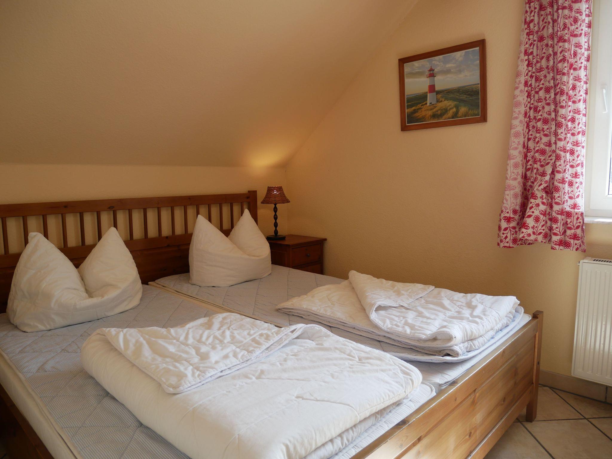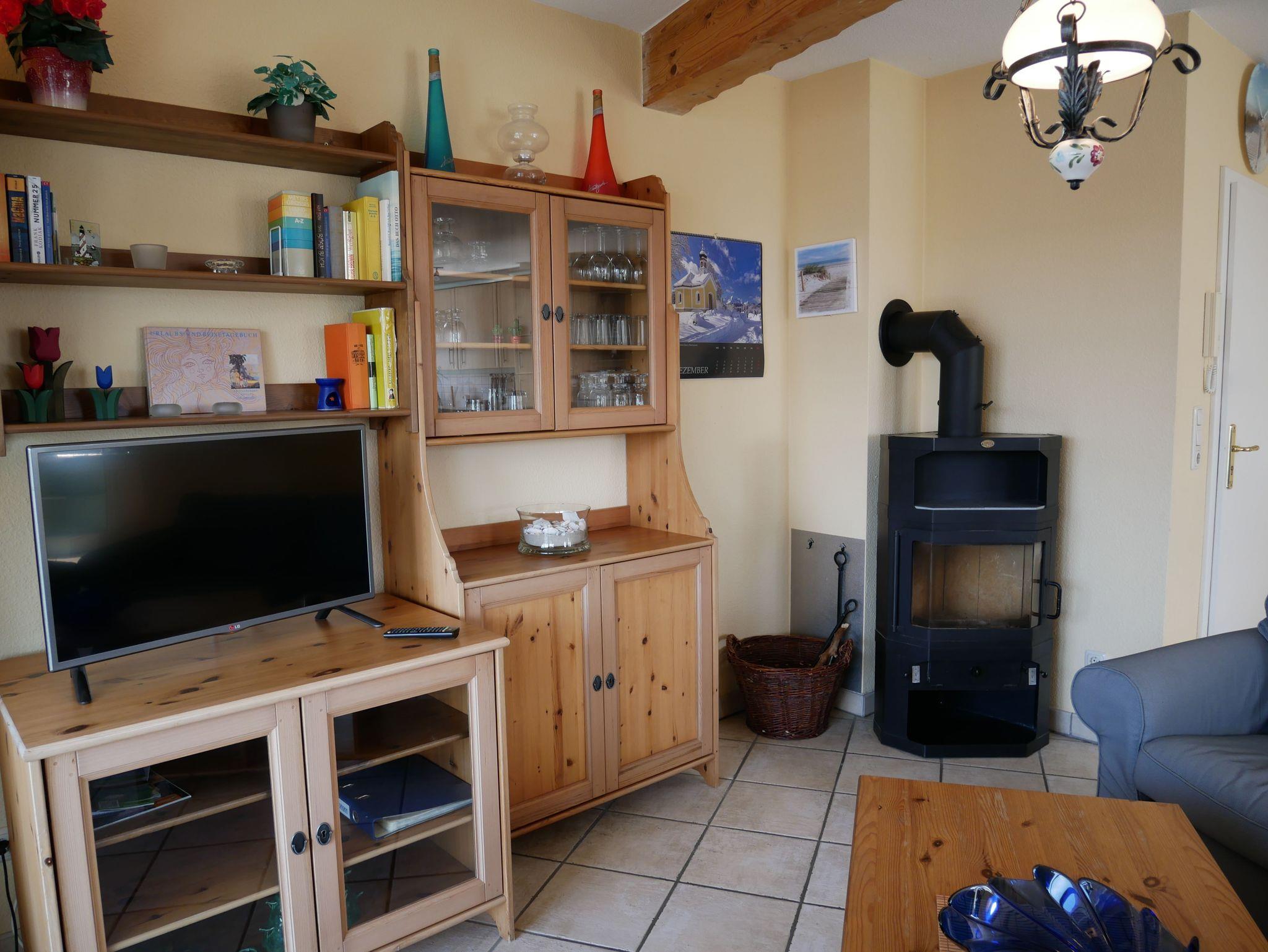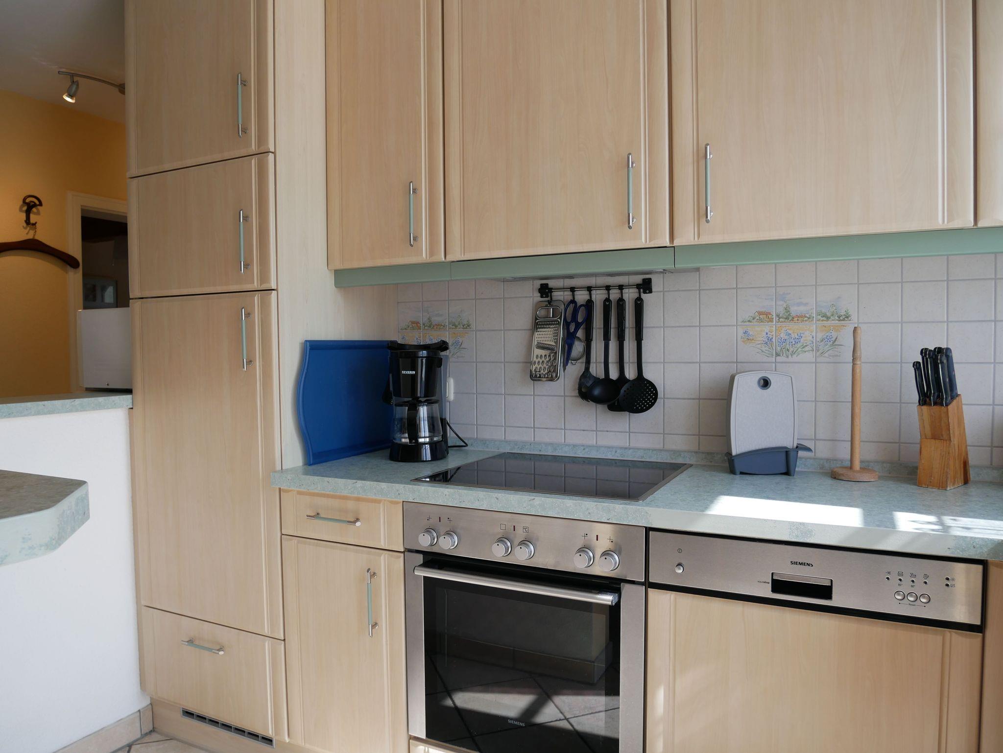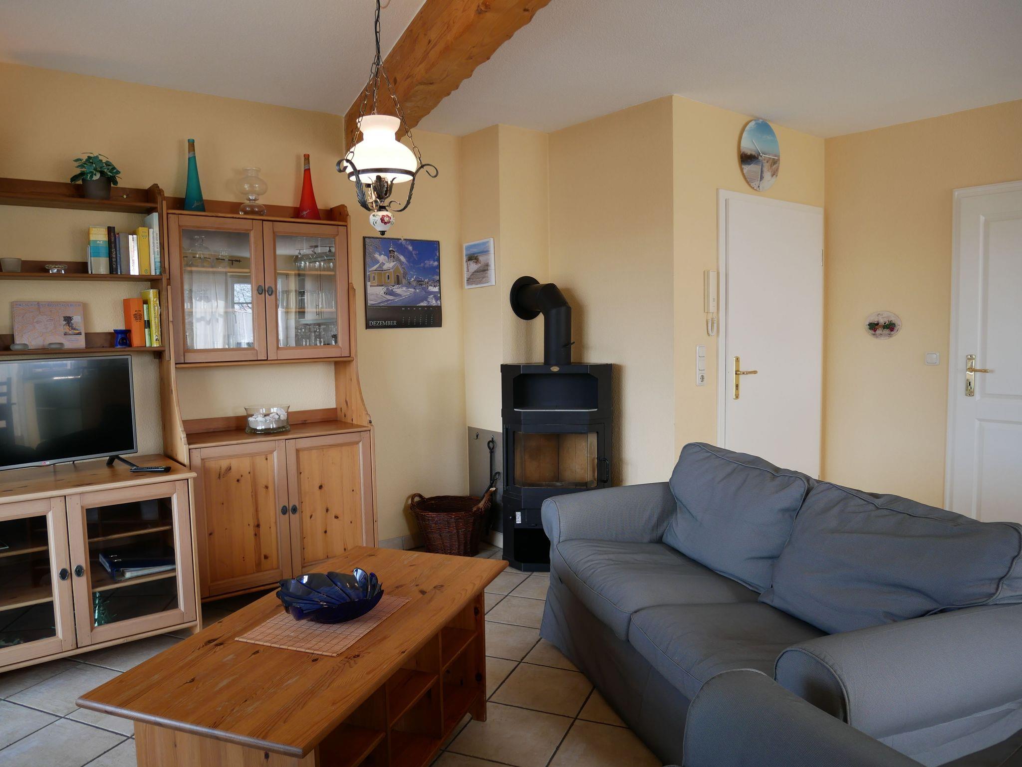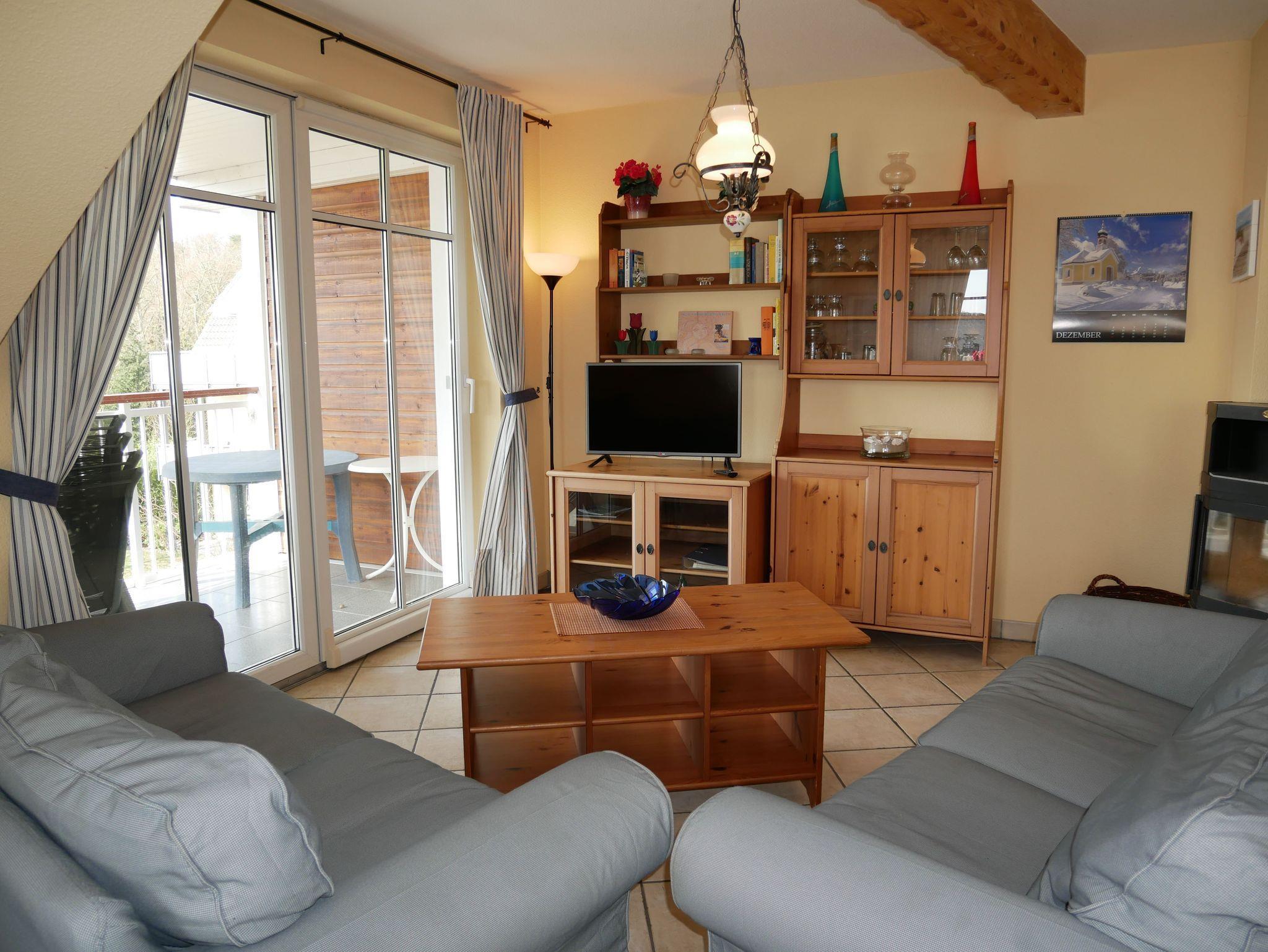Die 65 qm große Ferienwohnung befindet sich im 2. Obergeschoss eines Mehrfamilienhauses. Das Wohnzimmer ist mit zwei gemütlichen Sofas, Flachbildfernseher und CD-Player ausgestattet. Ein Kamin lädt besonders in der kalten Jahreszeit zu gemütlichen Stunden ein. Die voll ausgestattete offene Einbauküche verfügt über eine Kücheninsel, Kühlschrank mit Gefriermöglichkeit, Geschirrspülmaschine, Mikrowelle, Koch- und Backofen. Ein Schlafzimmer ist mit einen Doppelbett und das zweite Schlafzimmer mit 2 Einzelbetten ausgestattet. Das Tageslichtbadezimmer verfügt über Dusche und WC.