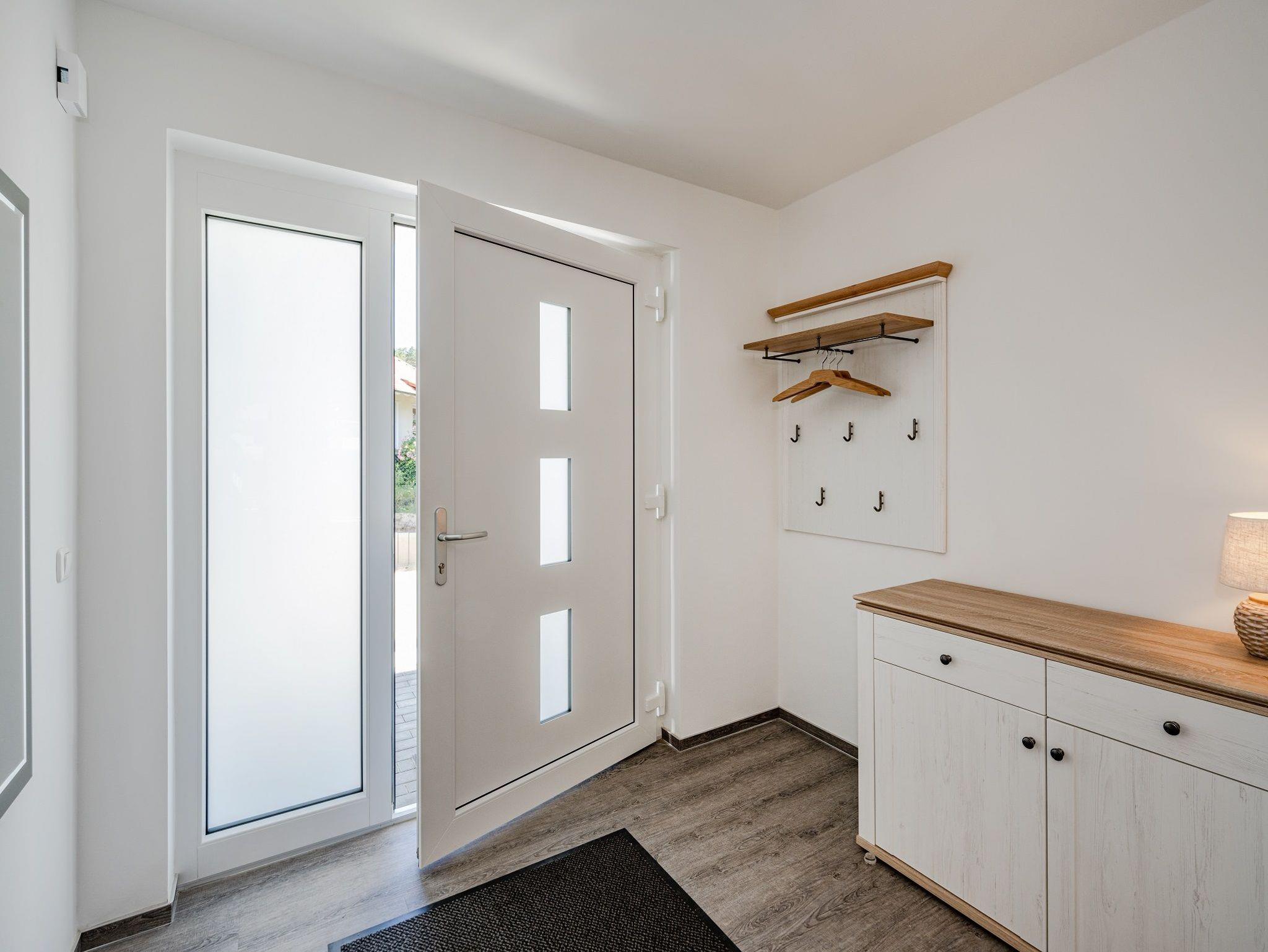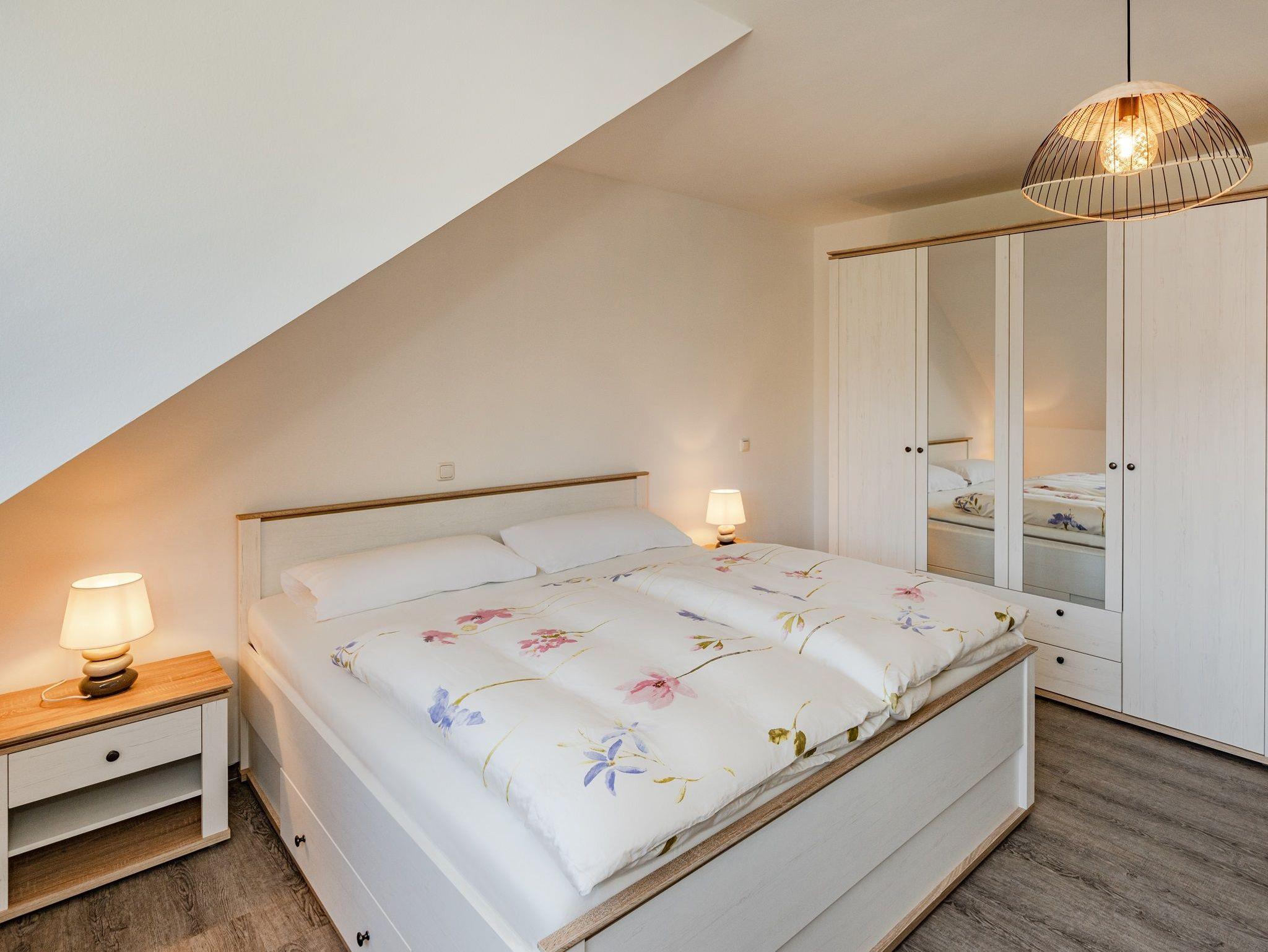 Im Obergeschoss befinden sich zwei separate Schlafräume, jeweils ausgestattet mit hochwertigem Doppelbett und Kleiderschrank. Ein weiteres Badezimmer mit ebenerdiger Dusche und WC sorgt für zusätzlichen Komfort. An den Fenstern sind Plissees montiert; einige Fenster verfügen zudem über Insektenschutz.