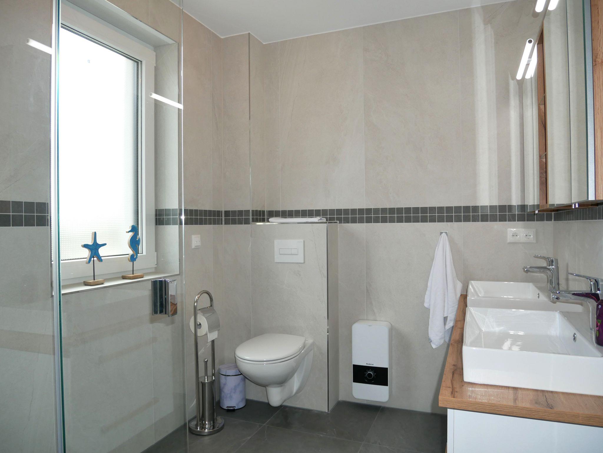 Das helle Tageslichtbad ist mit zwei Waschbecken, einem WC sowie einer ebenerdigen Dusche ausgestattet und verfügt über ein Fenster zur natürlichen Belüftung.
