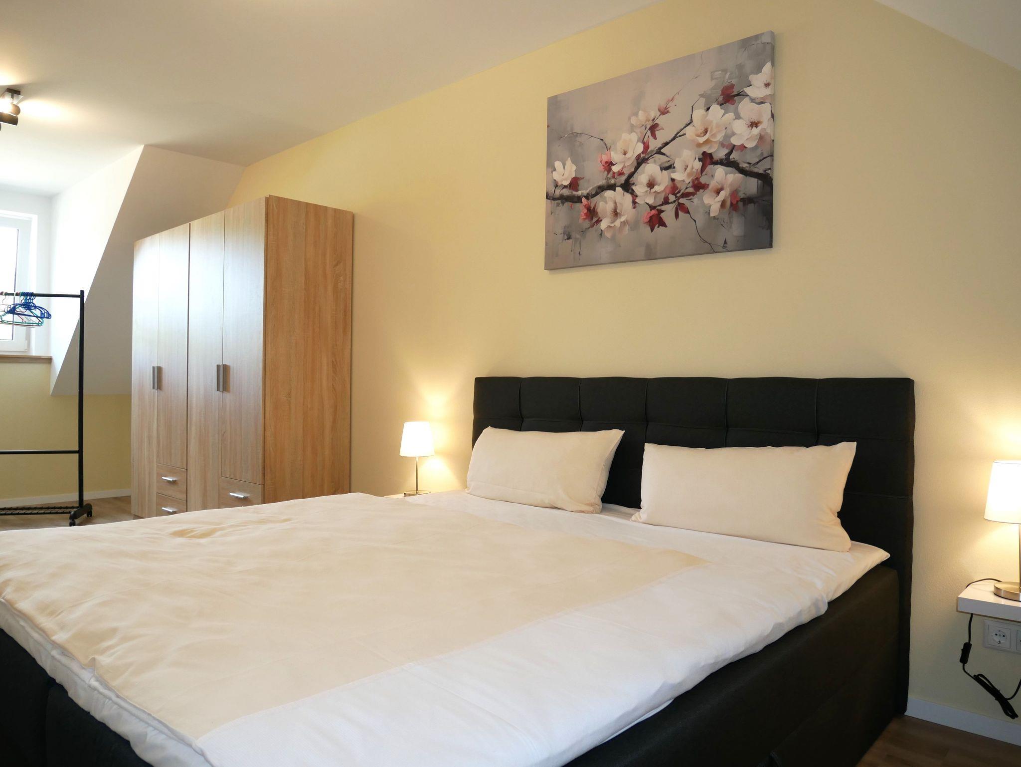 Über eine Treppe mit 15 Stufen gelangen Sie in das Obergeschoss, wo zwei separate Schlafzimmer auf Sie warten: Eines ist mit einem gemütlichen Doppelbett und einem geräumigen Kleiderschrank eingerichtet, das zweite verfügt über zwei Einzelbetten und ebenfalls einen Kleiderschrank. In beiden Schlafräumen sorgen Verdunklungsmöglichkeiten und Insektenschutz an den Fenstern für angenehme Ruhe und erholsamen Schlaf.