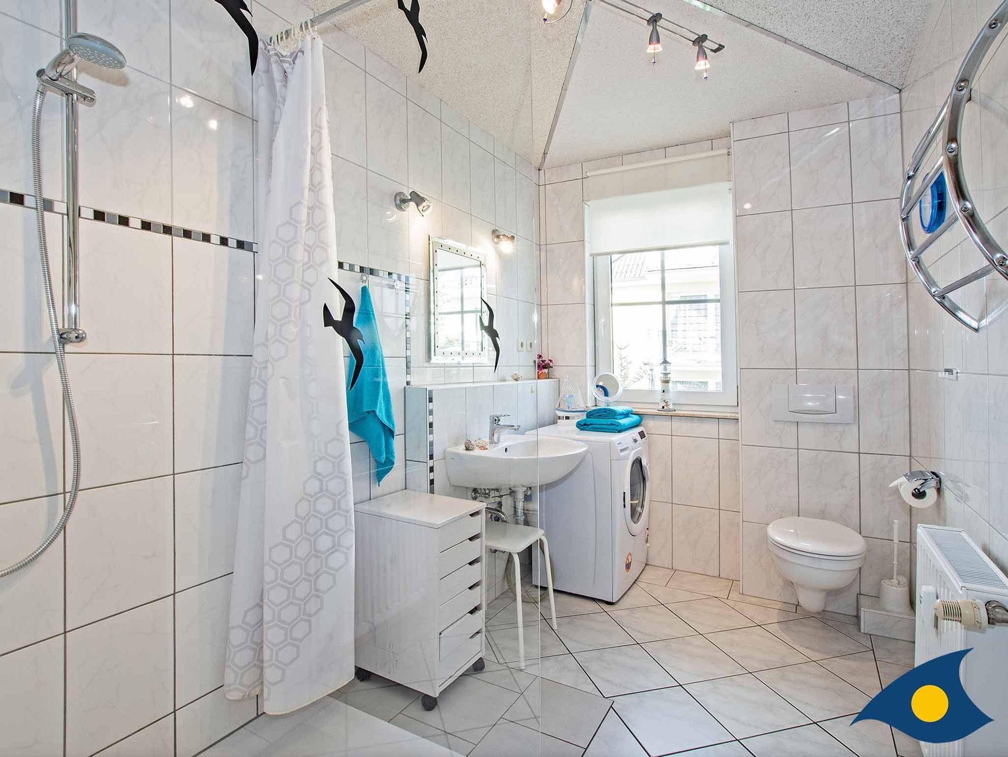 Das Bad mit Fenster ist mit einer ebenerdigen Dusche, WC und Waschmaschine ausgestattet.