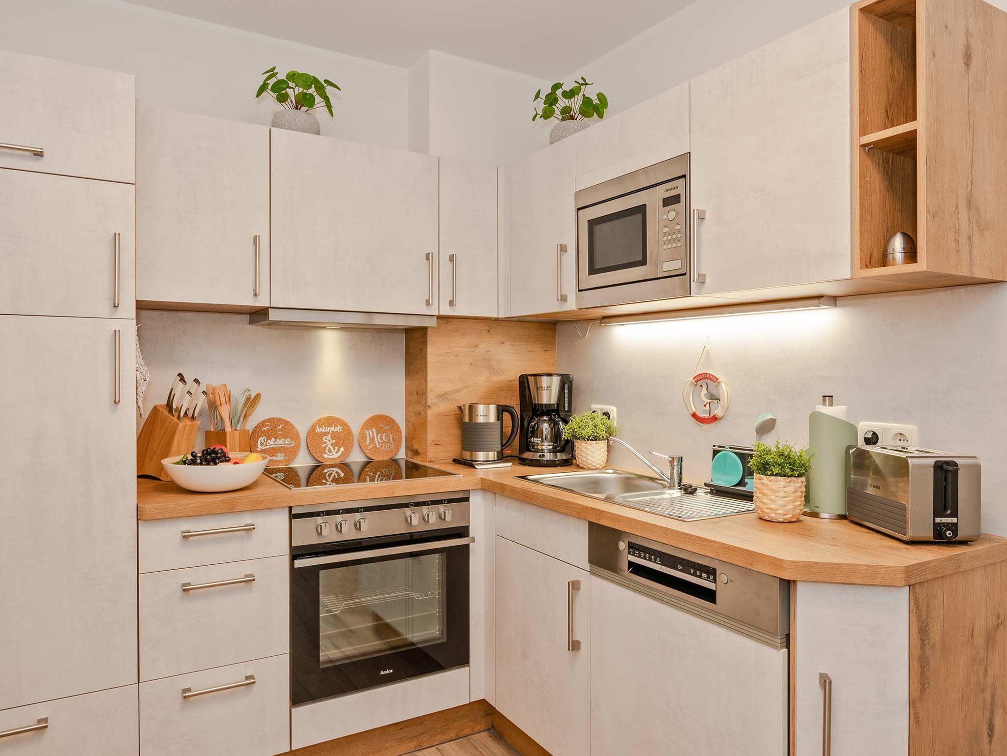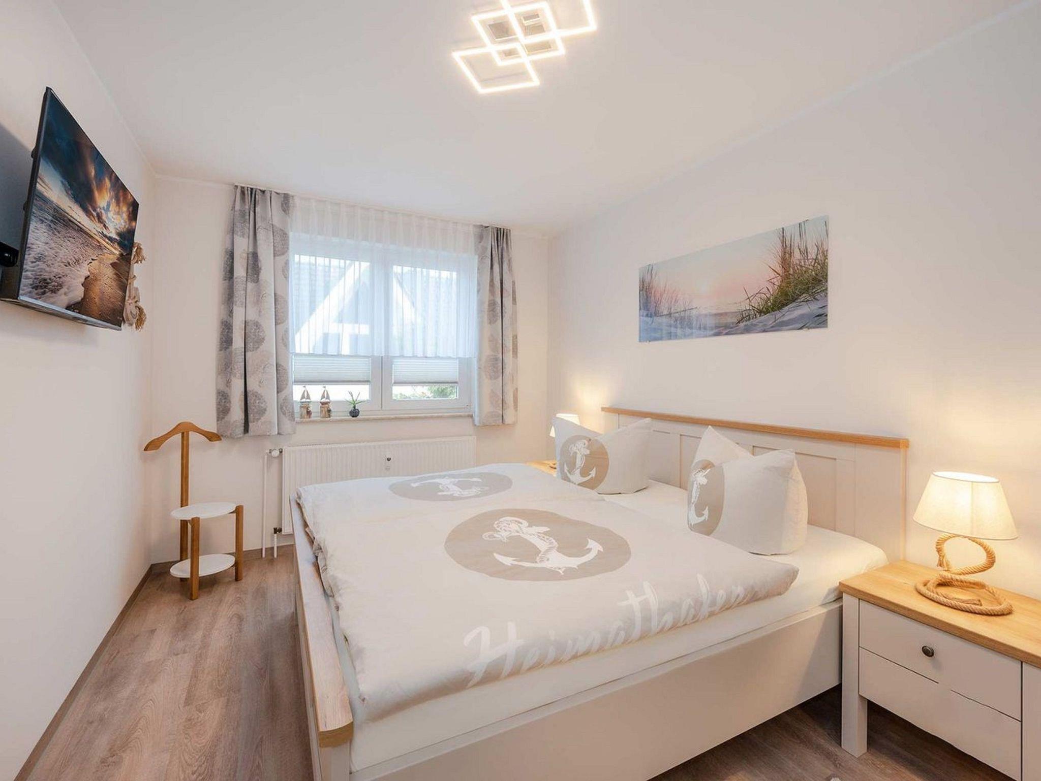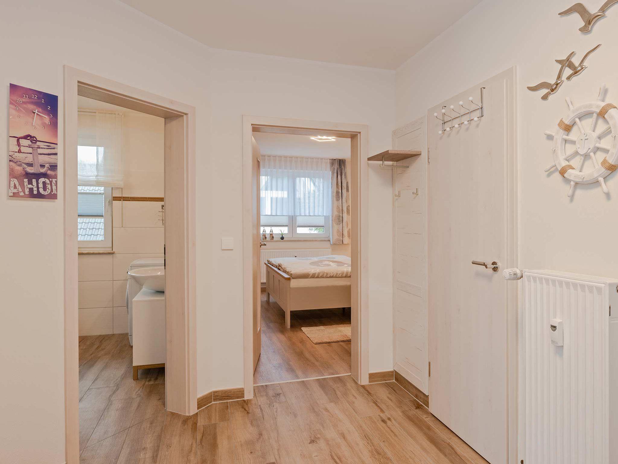 Die moderne 2- Raum Ferienwohnung befindet sich im 1. Obergeschoß der Villa Maria-Gabriele. Die Wohnung wurde im Jahr 2022 komplett modernisiert und mit viel Liebe zum Detail eingerichtet. Auf 44 qm erwartet sie ein gemütliches Wohnzimmer mit einer ausziehbaren Schlafcouch (Aufbettung für 3.+4. Pers. 1,80 x 2,00m), Smart- TV sowie einem Esstisch. Vom Wohnzimmer aus gelangen Sie auch auf den möblierten Balkon in Nord- West Lage. Die voll ausgestattete Küche ist mit Spülmaschine, Backofen, Ceran- Kochfeld, Mikrowelle, Kühlschrank mit Gefriermöglichkeit, Wasserkocher, Toaster und Kaffeemaschine ausgestattet und lässt keine Wünsche offen. Das Schlafzimmer verfügt über ein Doppelbett (1,80 m x 2,00 m), Smart-TV und einem Kleiderschrank. Das maritime Badezimmer ist mit Dusche, WC, Föhn und Waschmaschine ausgestattet. Ein Kinderbett, Kinderhochstuhl sowie Kindergeschirr stehen Ihnen kostenfrei zur Verfügung.