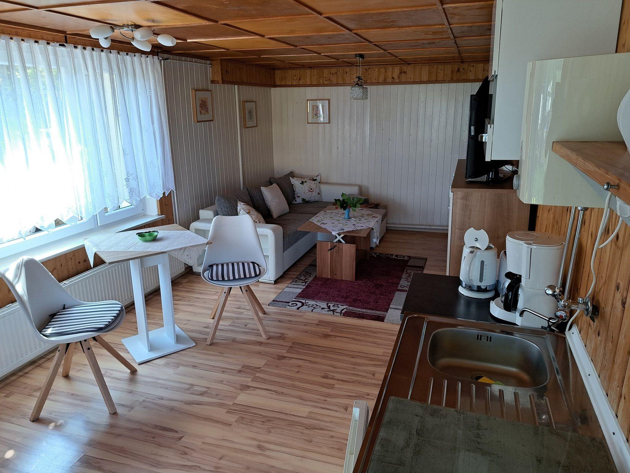 Die gemütlich eingerichtete Ferienwohnung befindet sich mit im Wohnhaus des Eigentümers. Sie verfügt über einen Wohnraum mit Couchecke und Flachbildfernseher, gemeinsam mit dem offenen Küchenbereich mit Essecke und Mini-Küche (Spülbecken, Kühlschrank und 2-Platten-Herd, Kaffeemaschine, Wasserkocher, Toaster, Geschirr, Besteck). Im Schlafzimmer steht ein gemütliches Bett (1,40 x 2,00 m) für eine Person. Das Bad ist mit Dusche und WC ausgestattet. Eine kleine Sitzecke befindet sich direkt am Eingang zur Ferienwohnung, genauso wie der PKW-Stellplatz.