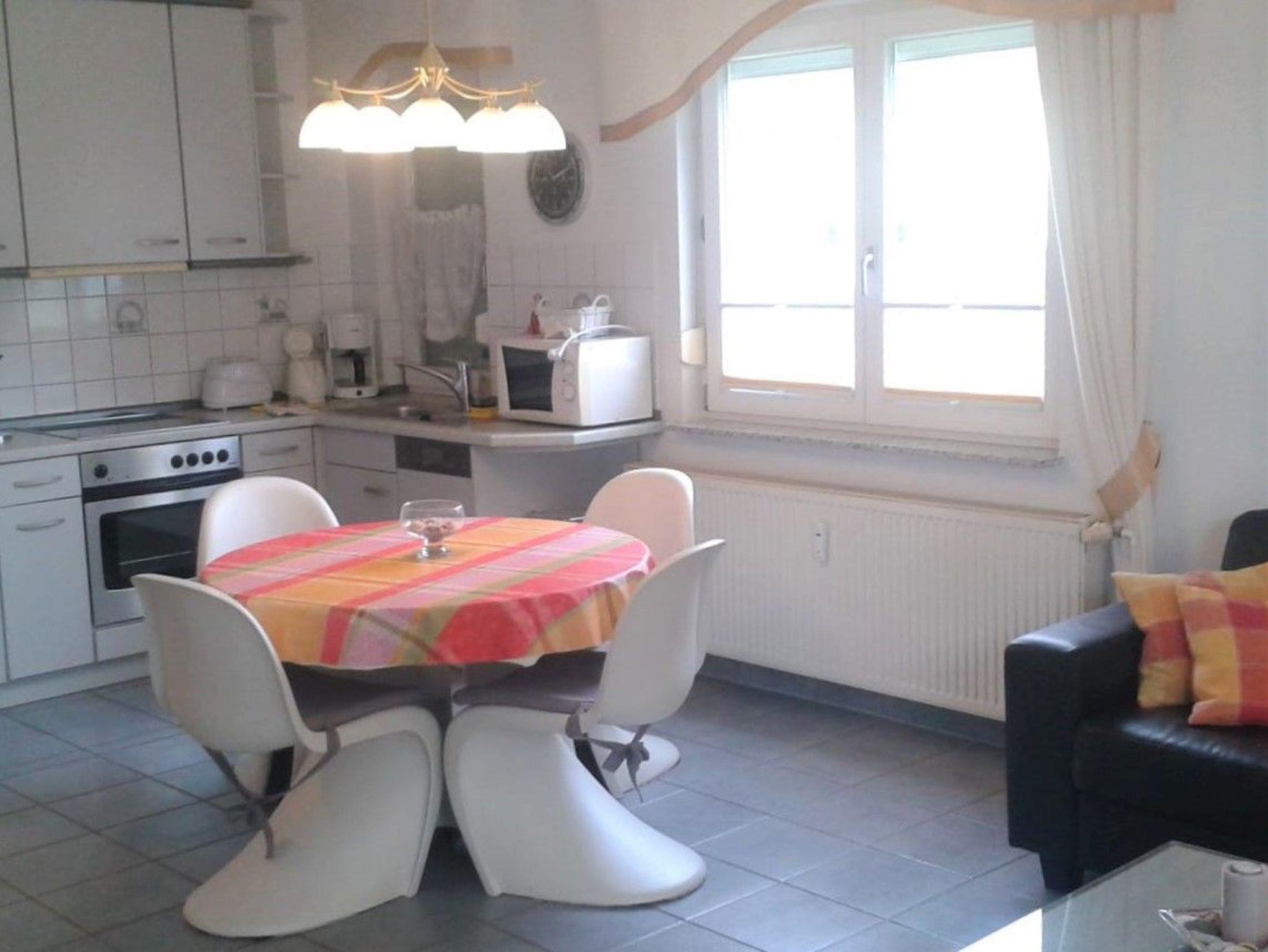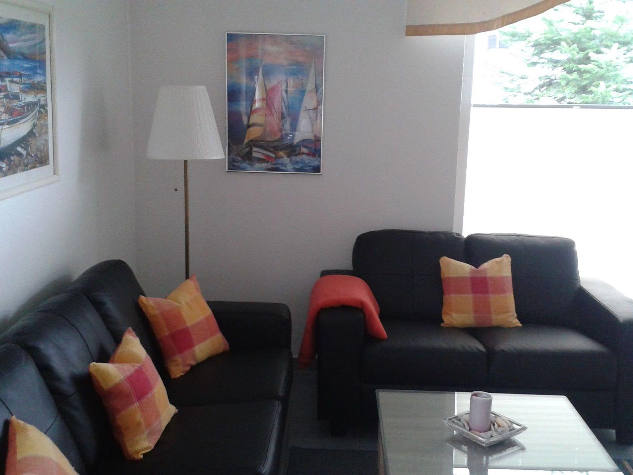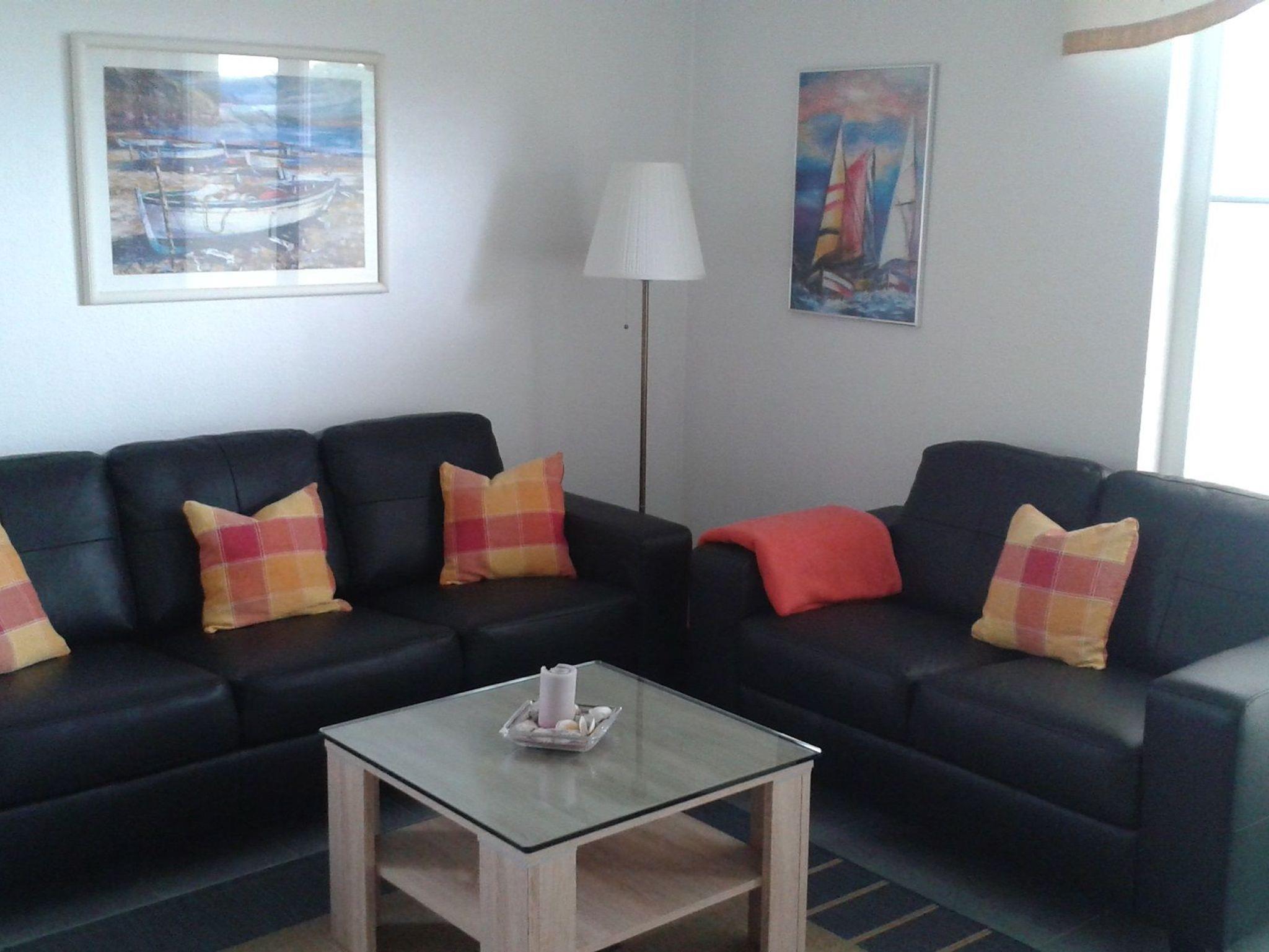 Im großzügigen Wohnzimmer befinden sich neben einer gemütlichen Sitzecke mit zwei Sofas auch ein großer Esstisch und die gut ausgestattete Einbauküche. Sie verfügt über Geschirrspüler, Kühl-/Gefrierkombination, Cerankochfeld, Backofen, Mikrowelle, Kaffeemaschine, Toaster und Wasserkocher. Flachbildfernseher und Stereoanlage sind zu Ihrer Kurzweil selbstverständlich ebenfalls vorhanden. Der Balkon liegt in südwestlicher Richtung und lädt zum Sonnenbaden und Frühstücken ein.