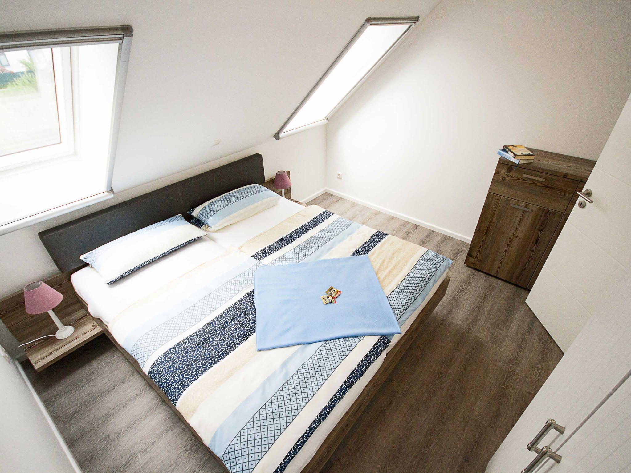 Im Oberschoß befinden sich die drei Schlafzimmer (zwei Schlafzimmer mit Doppelbett und ein Schlafzimmer mit zwei Einzelbetten) und das Badezimmer mit Dusche, Badewanne und WC. Bettwäsche und Handtücher bringen Sie bitte selber mit. Eine Waschmaschine steht für Sie kostenfrei zur Verfügung.