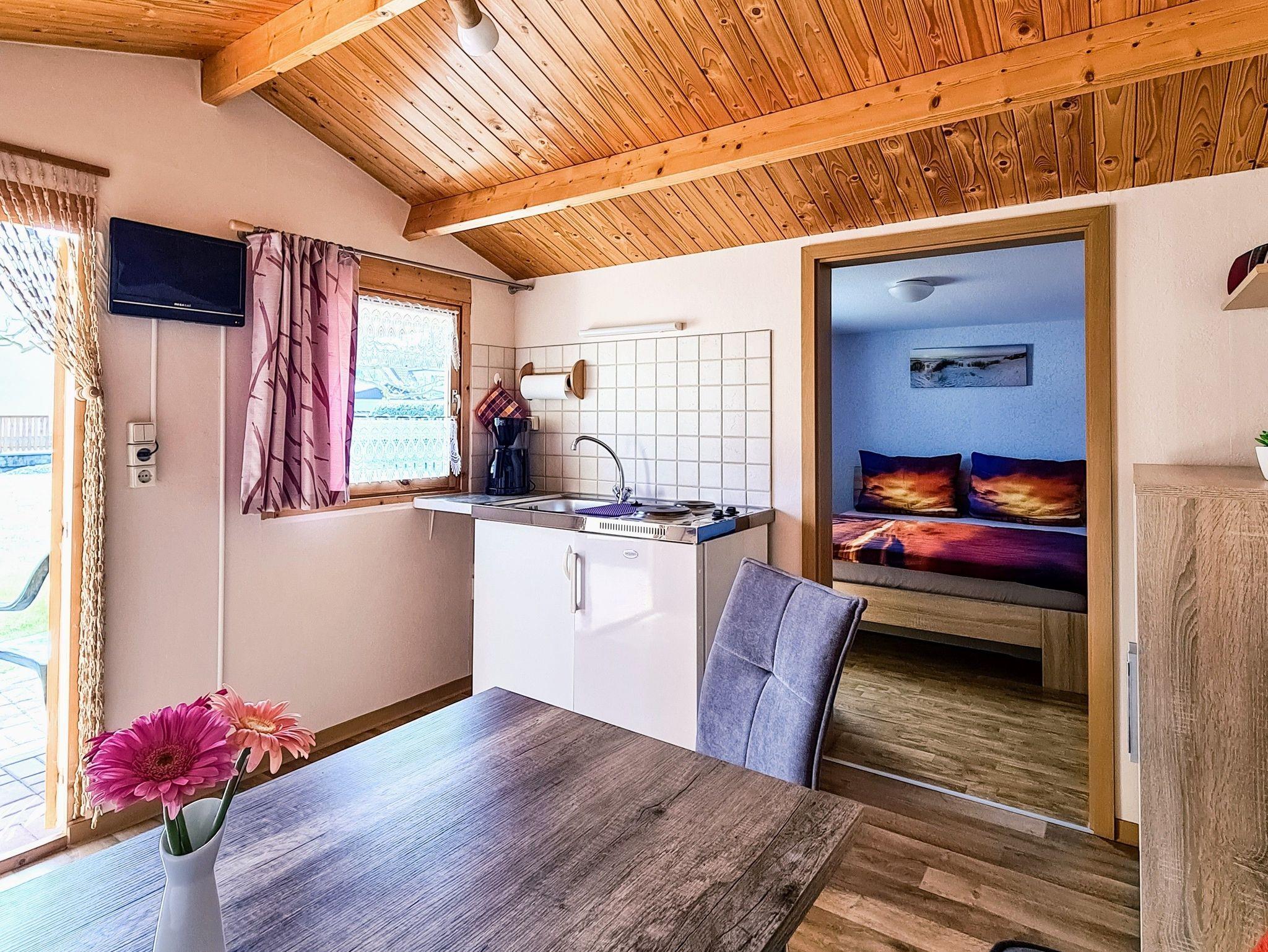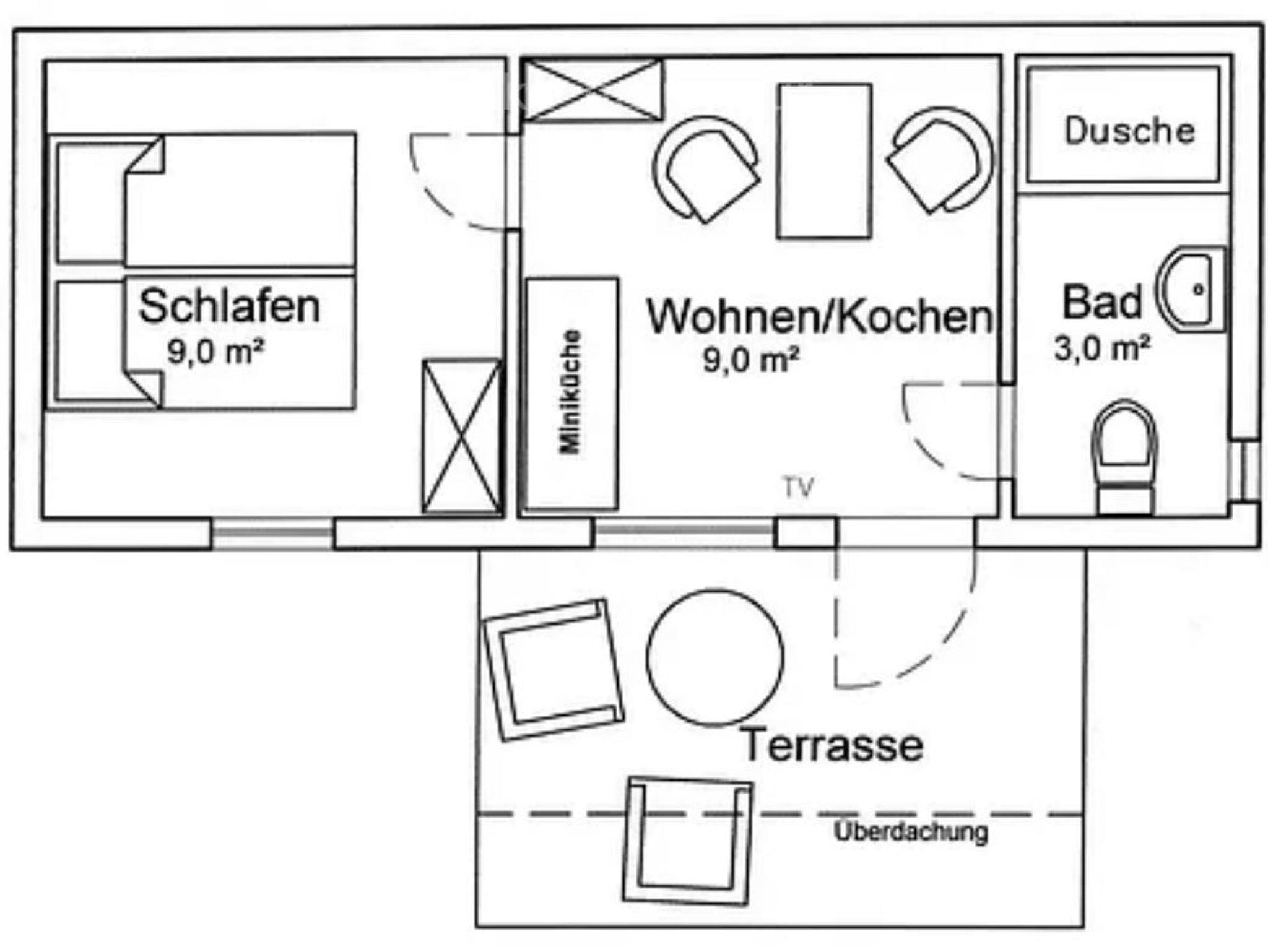 Der Bungalow ist 21qm groß und ist mit einem kombinierten Wohn- und Kochraum, Schlafzimmer und Duschbad ausgestattet.