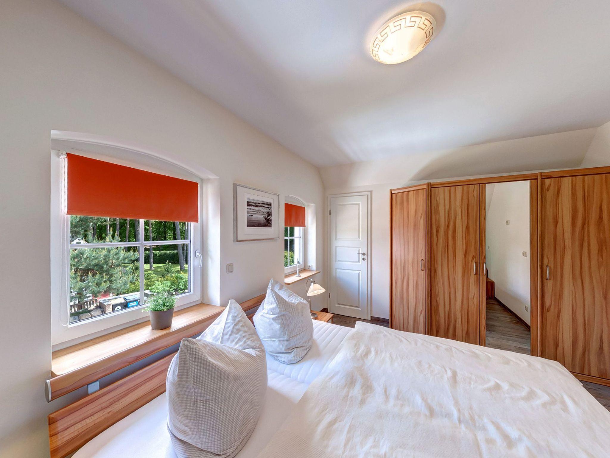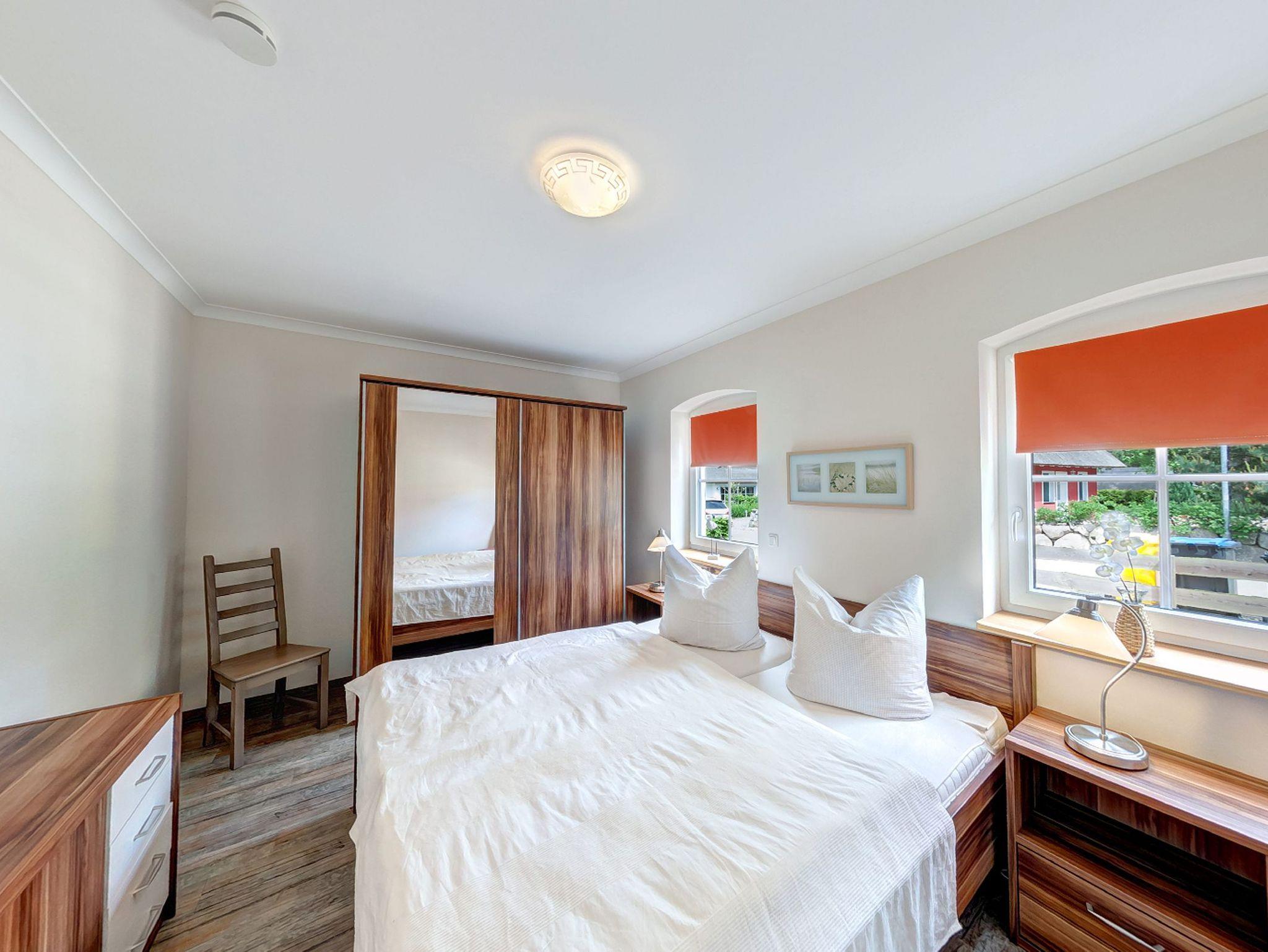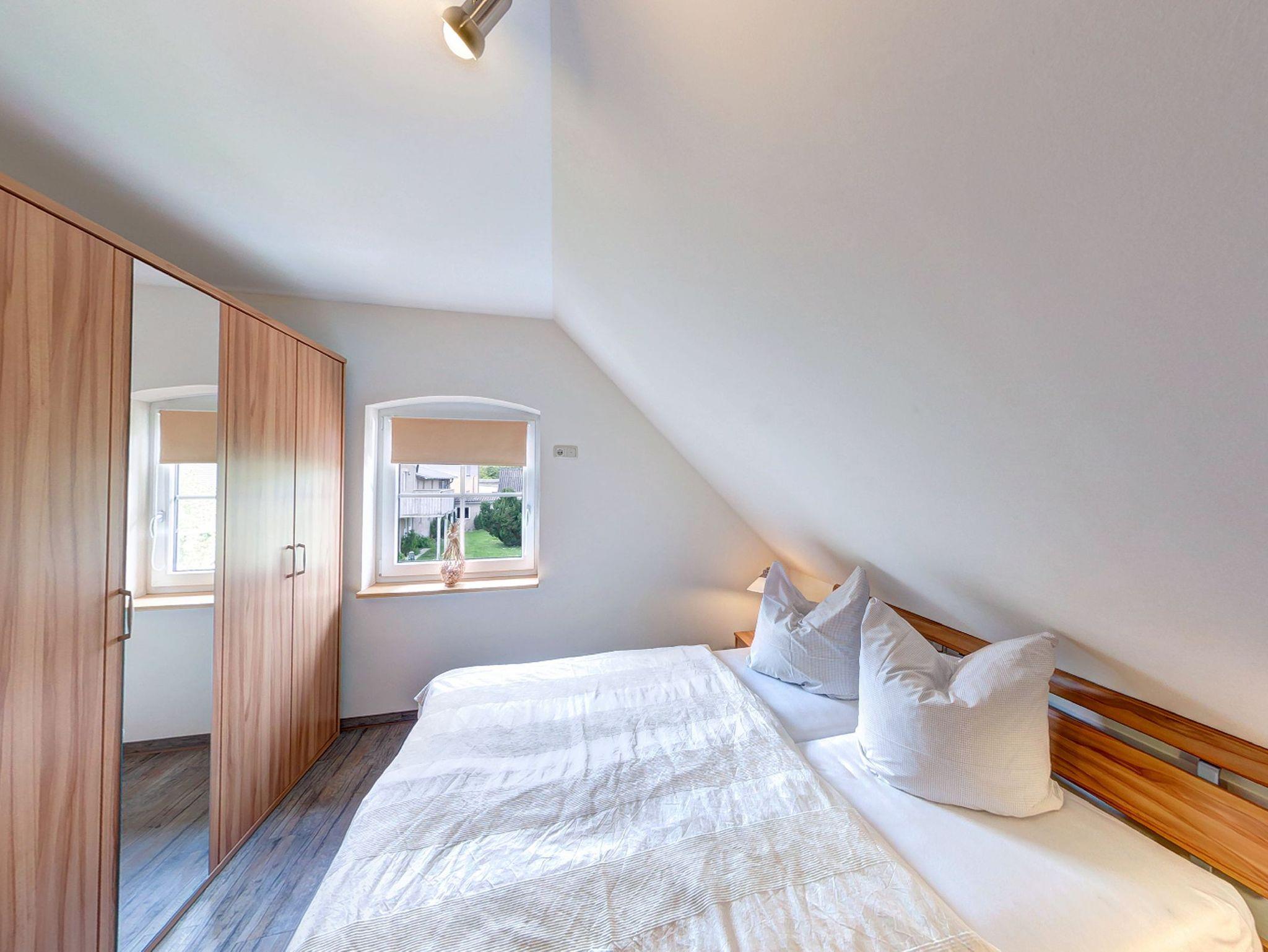 Ebenfalls im Erdgeschoss befindet sich ein Schlafzimmer mit einem komfortablen Doppelbett sowie ein behindertengerechtes Badezimmer mit Dusche und WC.