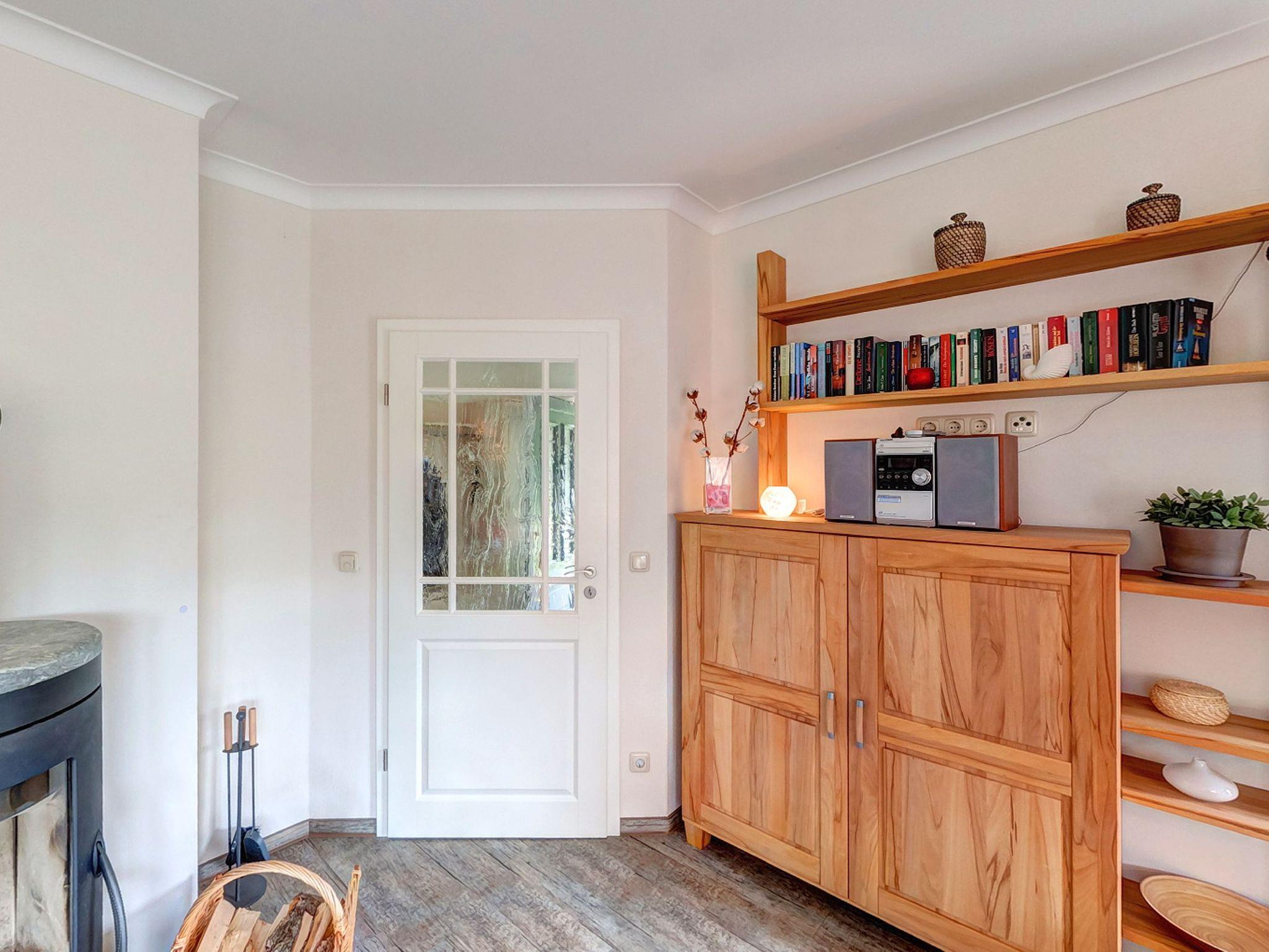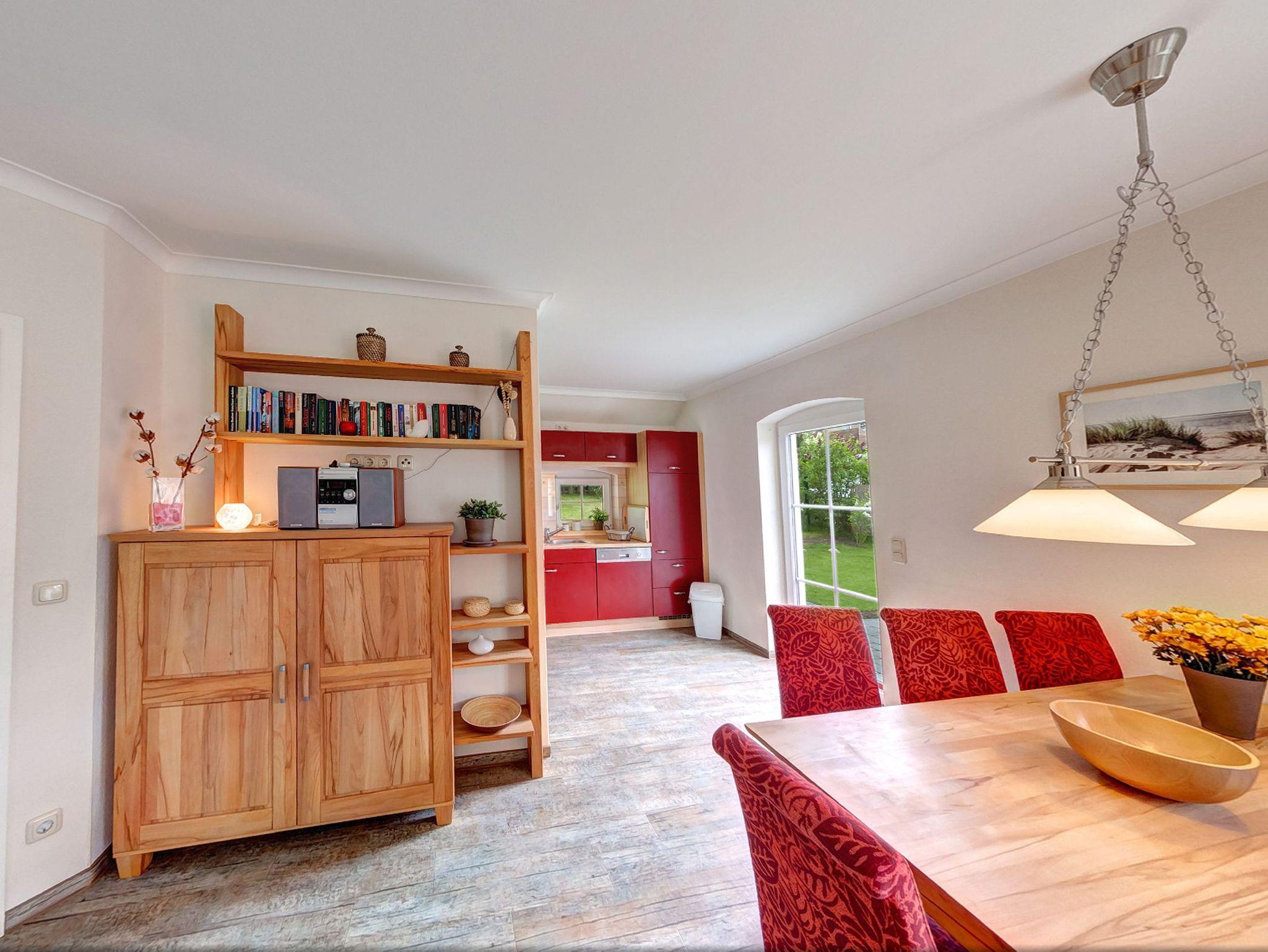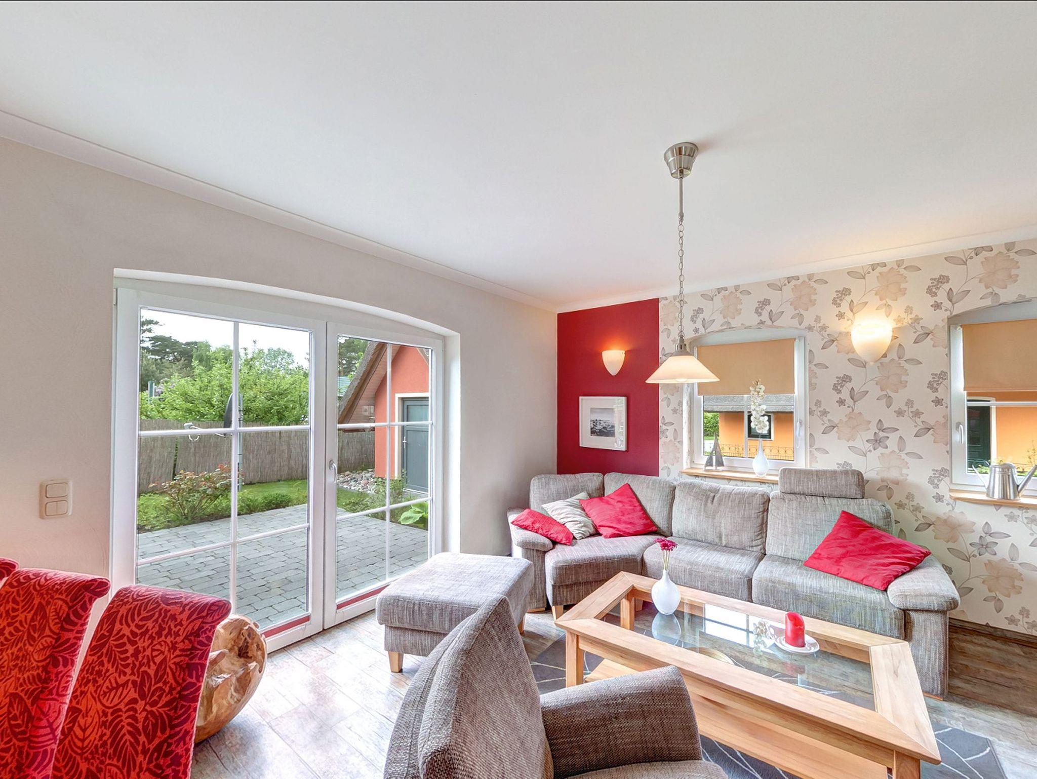Im Erdgeschoss dieses charmanten Hauses erwartet Sie ein großzügiger, lichtdurchfluteter Wohn- und Essbereich, der nahtlos an eine voll ausgestattete Küche angrenzt. Hier können Sie Ihre Lieblingsgerichte zubereiten und gemeinsam am großen, hölzernen Esstisch genießen. Der Wohnbereich ist mit einer bequemen Couch, einem gemütlichen Kaminofen und einem Flat-TV ausgestattet - perfekt für entspannte Stunden. Vom Wohnraum aus haben Sie direkten Zugang zu Ihrer möblierten Terrasse, auf der Sie das herrliche Ostseewetter in vollen Zügen genießen können.