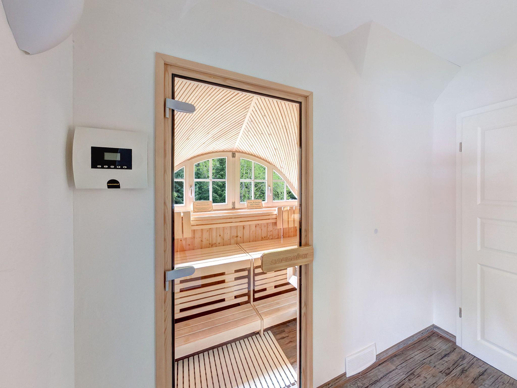 Über eine Treppe gelangen Sie ins Obergeschoss, wo zwei weitere Schlafzimmer mit je einem Doppelbett und einem Einzelbett auf Sie warten. In jedem dieser Zimmer kann auf Wunsch ein Babybett hinzugefügt werden. Hier finden Sie auch ein weiteres Badezimmer, das mit einer Dusche, einer Badewanne, WC und Waschbecken ausgestattet ist, sowie Ihre eigene private Sauna - der perfekte Ort, um nach einem langen Tag zu entspannen!