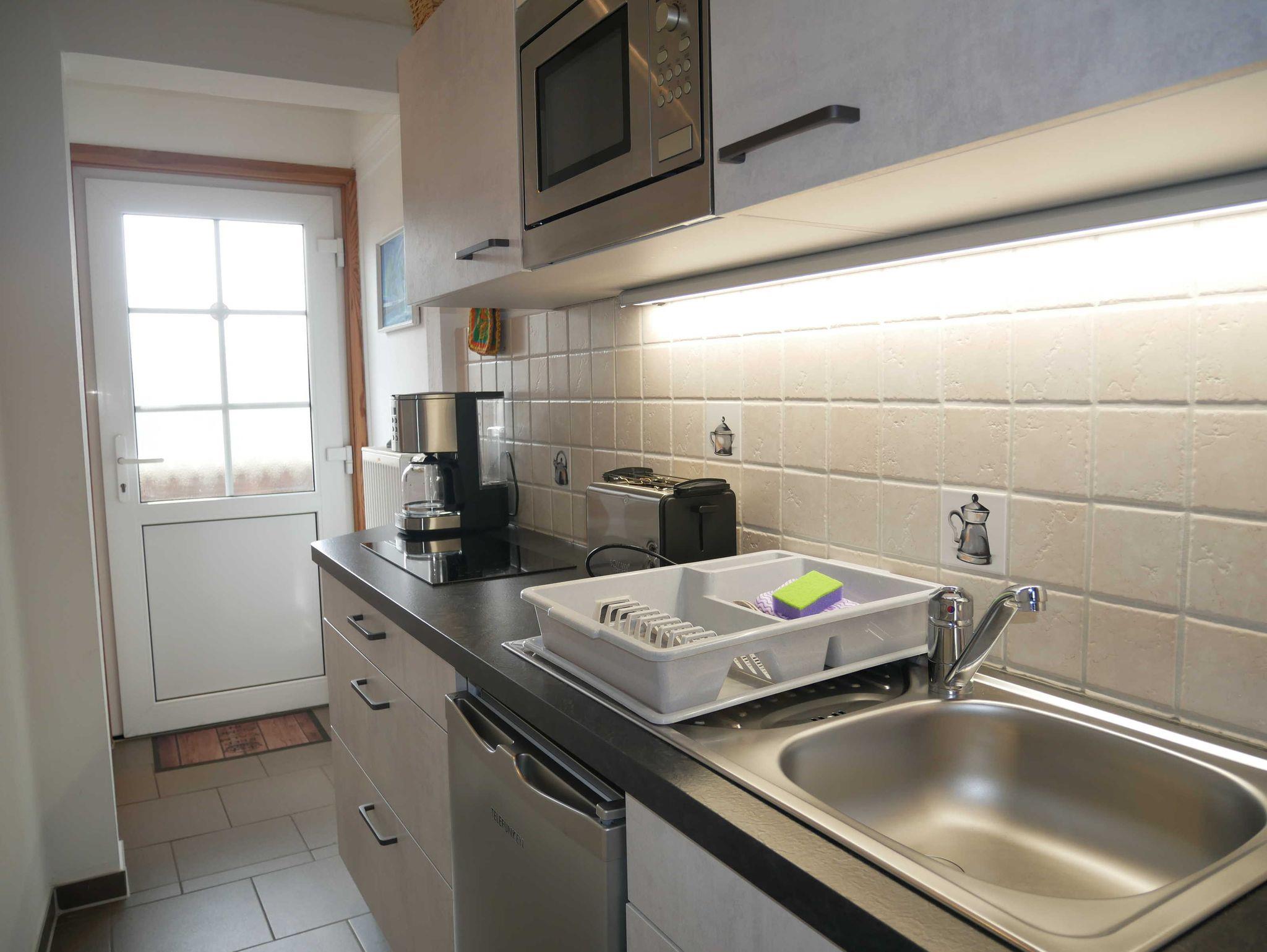 Die gemütliche, modern eingerichtete 1-Raum-Ferienwohnung liegt im Hochpaterre des Hauses Anneliese. Sie verfügt über einen separaten Eingang über die Hochterrasse. Der kombinierte Wohn-Schlafraum ist mit einem Doppelbett, zwei Sesseln, Flat-TV und Radio mit CD-Player ausgestattet. Im Flurbereich ist eine Pantry-Küche mit 2-Platten-Herd, Kühlschrank, Spüle, Kaffeemaschine, Wasserkocher und Toaster integriert, außerdem wird Ihnen Fit, Schwamm, Spültuch und Geschirrhandtuch zur Verfügung gestellt. Das große Badezimmer verfügt über Dusche/WC und Haartrockner. Die sonnige, möblierte Terrasse zur Südseite verspricht einen tollen, seitlichen Meerblick.