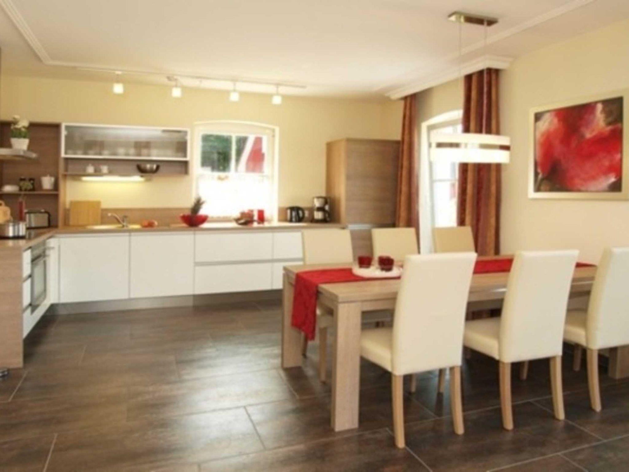 Der lichtdurchflutete Wohnbereich bildet das Herzstück des Hauses. Hier erwartet Sie eine moderne, großzügig ausgestattete Küche, die nahtlos in den Essbereich für sechs Personen übergeht. Perfekt für gemeinsame Mahlzeiten und gesellige Abende. Der anschließende Wohnbereich mit großem TV lädt zum Entspannen, Filme schauen oder gemütlichen Beisammensein ein.