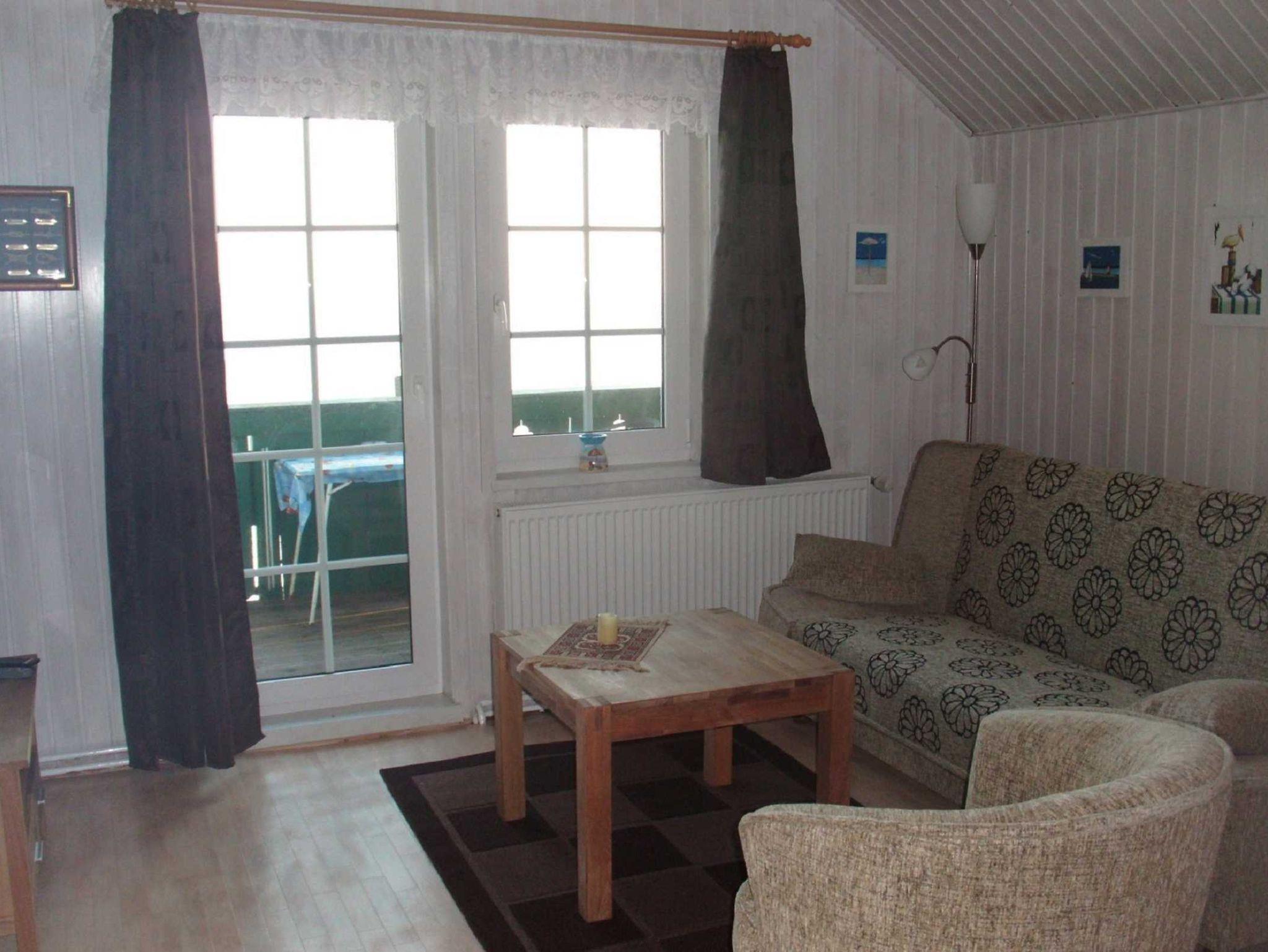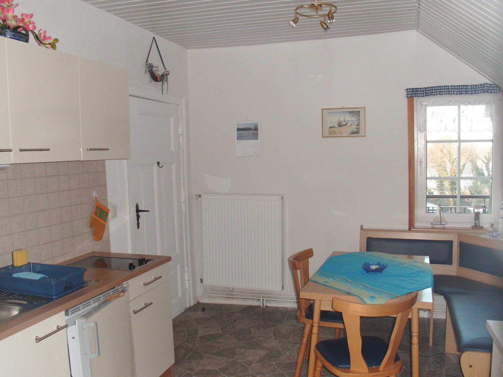 Die gemütliche 3-Raum-Ferienwohnung liegt im Dachgeschoss des Hauses Anneliese und hat einen separaten Eingang, der über eine Außentreppe erreichbar ist. Sie verfügt über zwei Schlafkammern mit Dachschrägen mit je einem Doppelbett (180x200cm). Im Wohnzimmer steht eine gemütliche Couch, sowie ein Flat-TV mit Radio mit CD-Player zur Verfügung. Von hier aus gelangt man auf den möblierten Balkon mit wunderschönem Blick auf die Ostsee. Im Eingangsbereich befindet sich ein zweiter Balkon, von dort aus blickt man auf den ca. 100 m entfernten Kölpinsee. Im großzügigen Küchenbereich finden Sie eine Sitzecke mit Esstisch und eine Küchenzeile mit 2 Platten-Herd, Kühlschrank, Spüle, Kaffeemaschine, Wasserkocher und Toaster außerdem wird Ihnen Fit, Schwamm, Spültuch und Geschirrhandtuch zur Verfügung gestellt. Das Badezimmer ist mit Dusche/WC und Haartrockner ausgestattet.