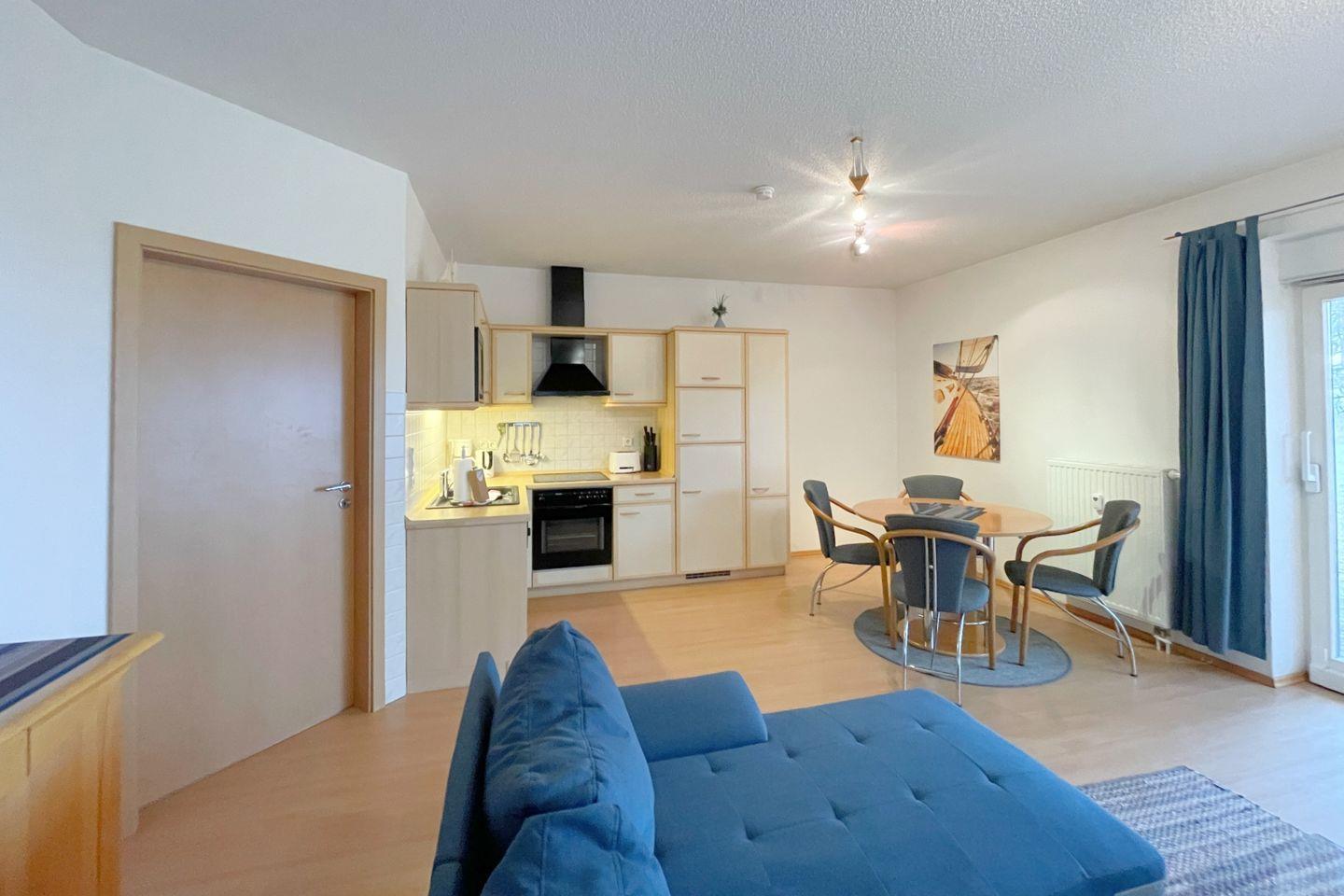Die offene Küche öffnet sich zum Wohnzimmer und ist mit modernen Annehmlichkeiten wie einem Backofen, einer Mikrowelle, einem Cerankochfeld und einer Geschirrspülmaschine ausgestattet. So wird das Zubereiten von köstlichen Mahlzeiten zum Vergnügen. Für gesellige Essensmomente steht Ihnen ein gemütlicher Esstisch zur Verfügung. Das Wohnzimmer ist geschmackvoll eingerichtet und bietet eine Sofaecke, in der Sie entspannen und den Abend bei einem guten Film auf dem digitalen Fernseher ausklingen lassen können.