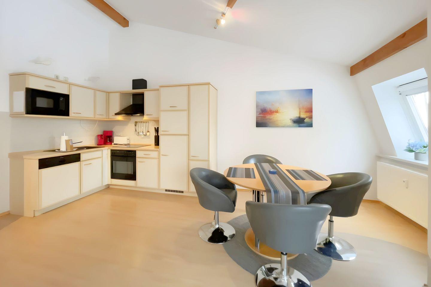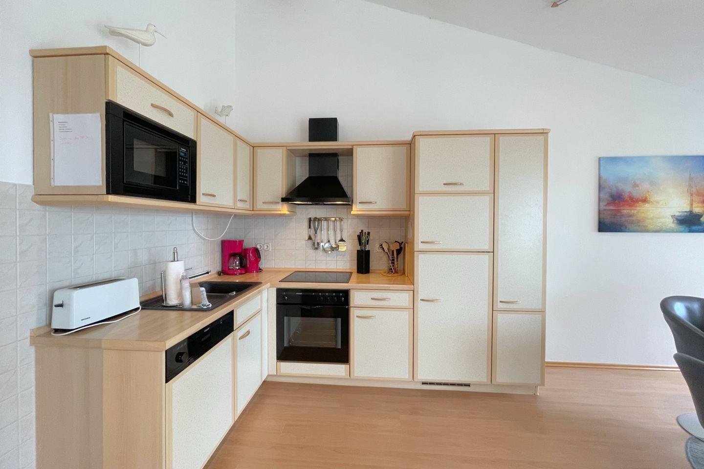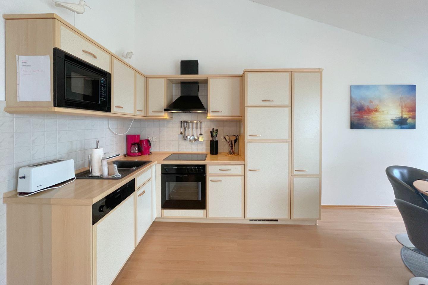 Die offene Küche ist komplett ausgestattet mit hochwertigen Küchenutensilien, einem Cerankochfeld, Backofen, Mikrowelle, Kühlschrank mit Gefrierfach, Geschirrspüler und einer Kaffeemaschine – hier können Sie im Handumdrehen köstliche Gerichte zubereiten. Von der Küche aus gelangen Sie direkt auf den Balkon, auf dem Sie bei einem Glas Wein den herrlichen Blick auf die umliegende Natur und das Achterwasser genießen können.