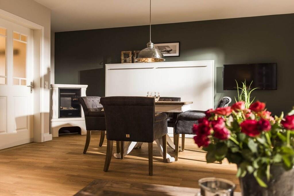 Die Ferienwohnung des Kamphofs ist stilvoll eingerichtet, mit Terrasse und Teil-Wasserblick, die Platz für 2 Personen plus zusätzlich 2 Personen im Wohnbereich bietet. Nun mit 5 Sternen vom DTV ausgezeichnet (für 2 Personen)! Der gesamte Wohnbereich ist hochwertig, mit Liebe zum Detail geplantem Mobiliar versehen, das eine luxuriöse, aber dennoch heimelige Urlaubsatmosphäre schafft, die keine Wünsche übrig lässt. Ein kuscheliger Kamin verspricht romantische Abende, das Bad ist eine Wellnessoase. Besonderheiten: Genießen Sie Ihre Urlaubszeit und erholen Sie sich! Das Reinigen übernehmen wir. Ein täglicher Service kümmert sich um die Sauberkeit in Ihrer Ferienwohnung