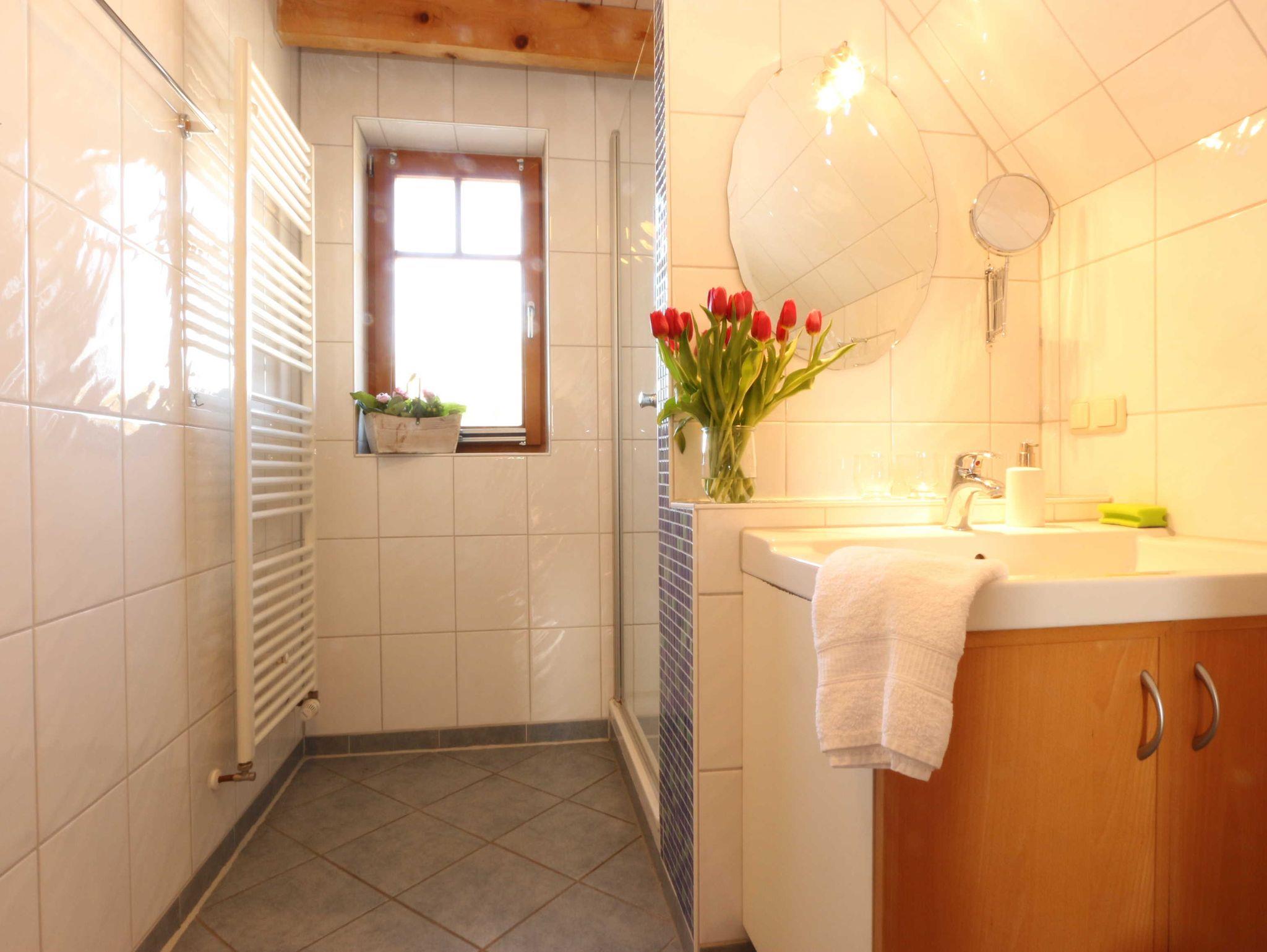 • Das Badezimmer hat Dusche, WC und Waschtisch.