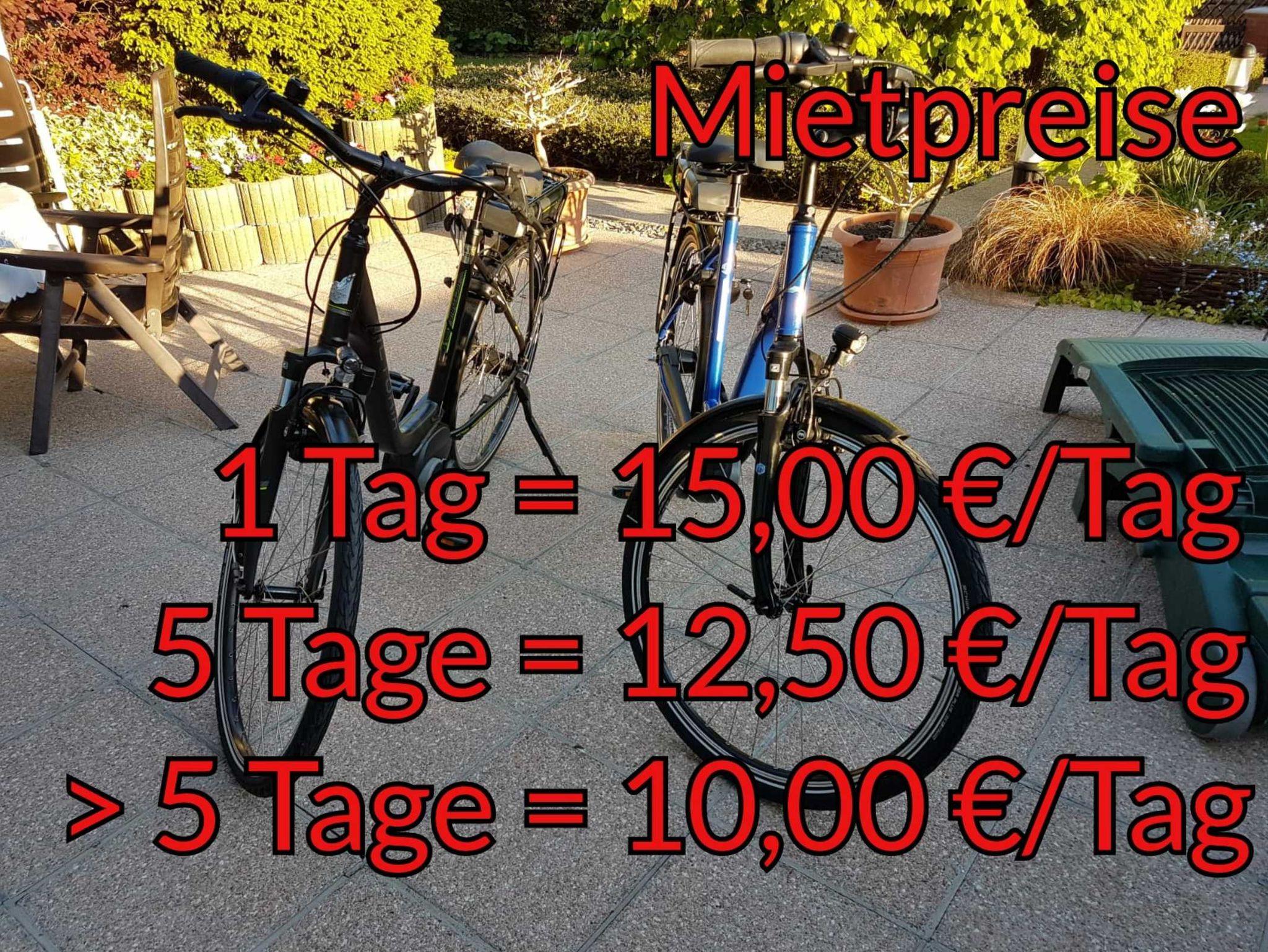 • Für das Objekt stehen drei E-Bikes für die Gäste zur Anmietung zur Verfügung. Der Mietpreis beträgt pro Fahrrad bei Nutzung von einem Tag = 15,00 €/Tag, bei 5 zusammenhängenden Tagen = 12,50 €/Tag und bei mehr als 5 zusammenhängenden Tagen = 10,00 €/Tag.