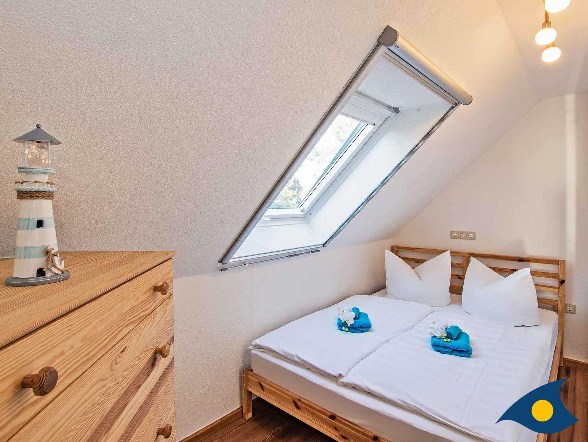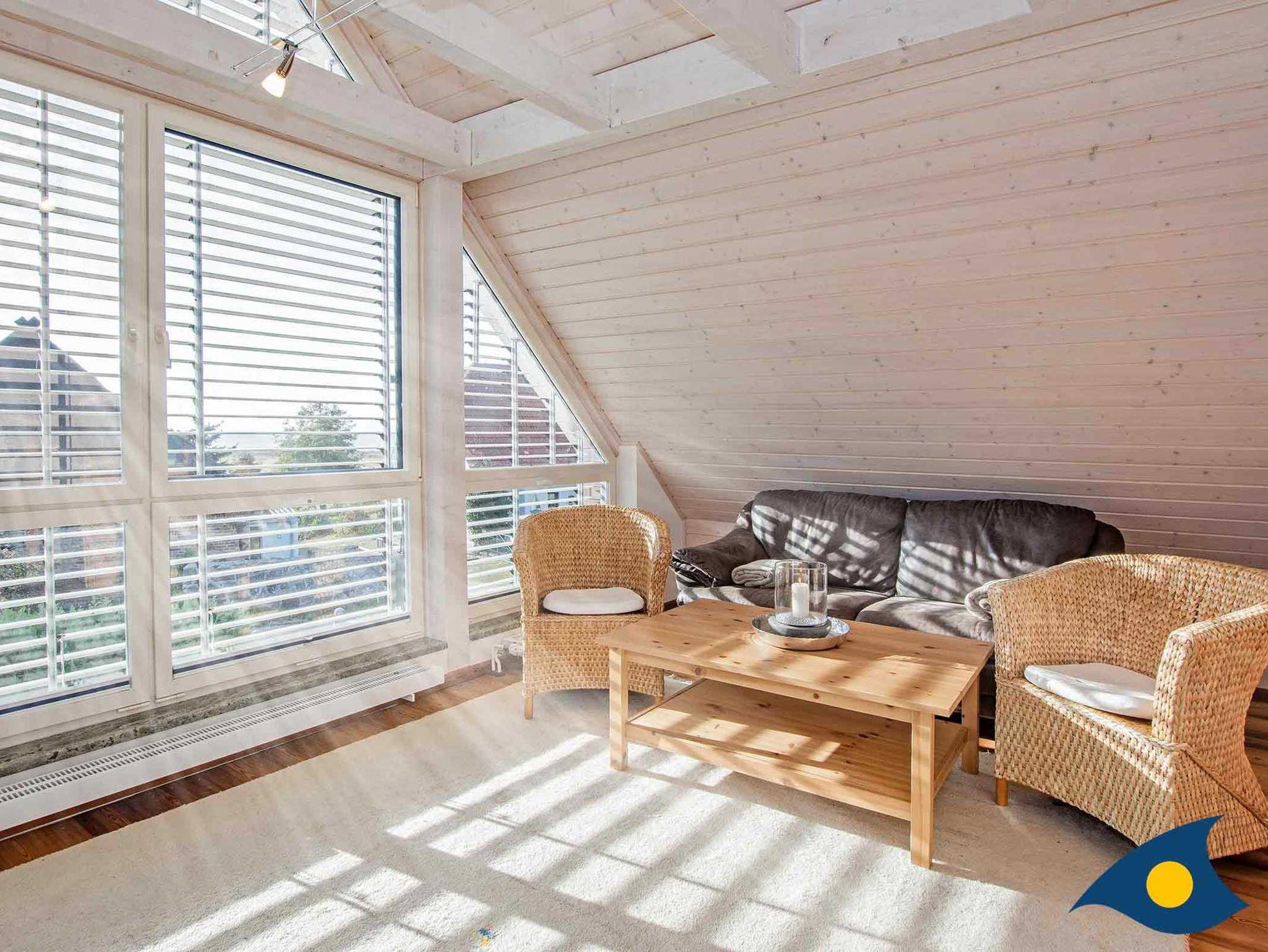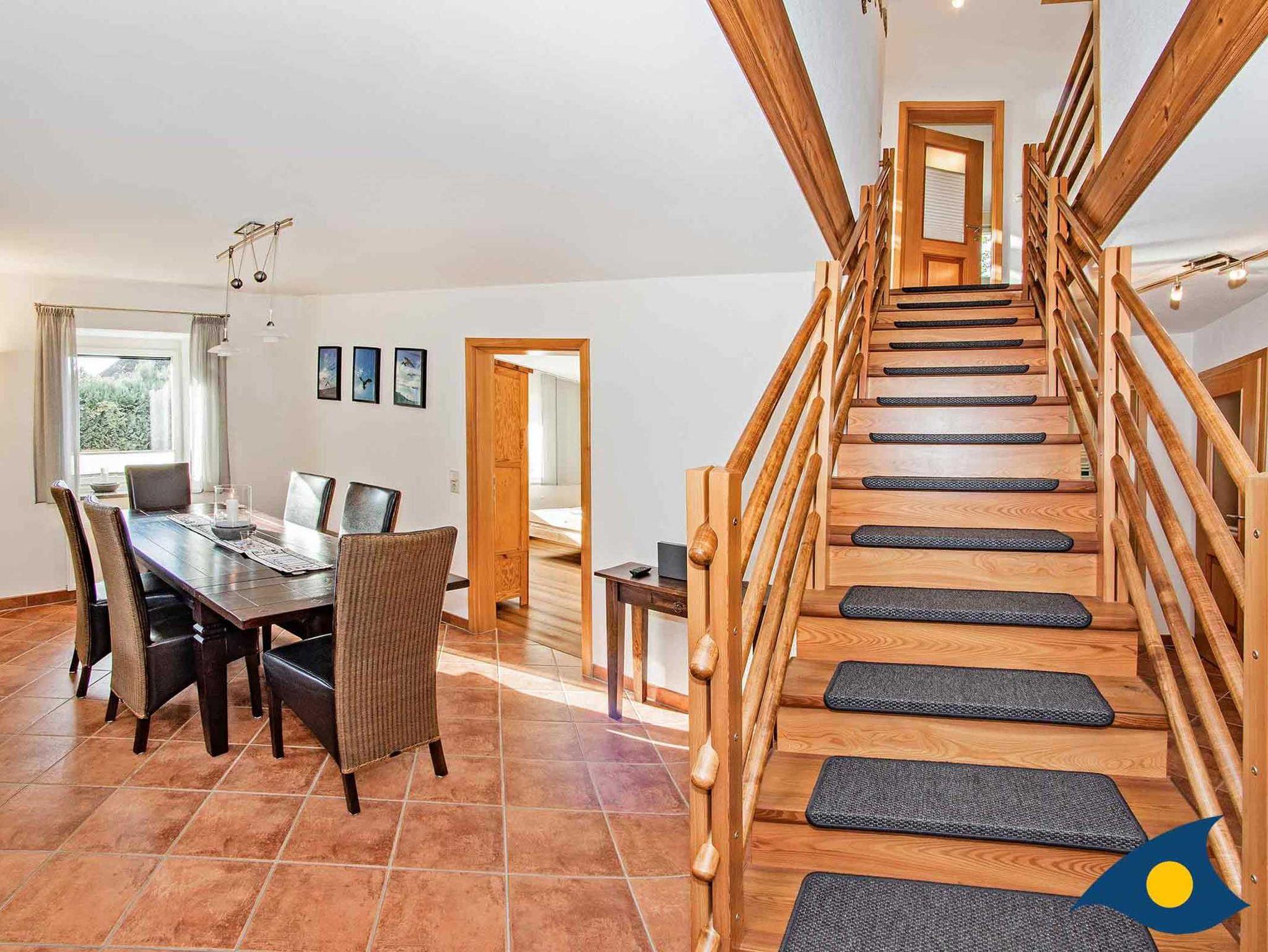 Das Haus ist ausgestattet für 8 Personen zzgl. 1-2 Kleinkinder. Sitzerhöhungen für Kinder und ein Treppengitter sind vorhanden. Im Obergeschoß haben Sie einen grandiosen Blick auf das Achterwasser aus dem komplett verglasten Giebel des gemütlichen Wohnzimmers.