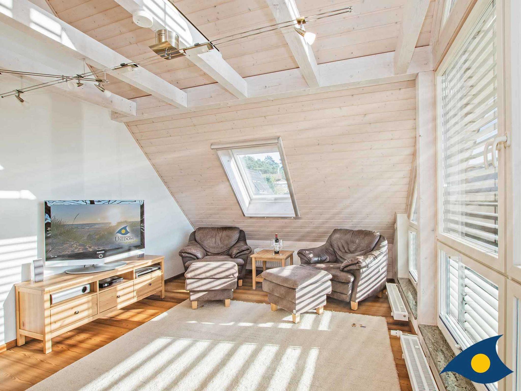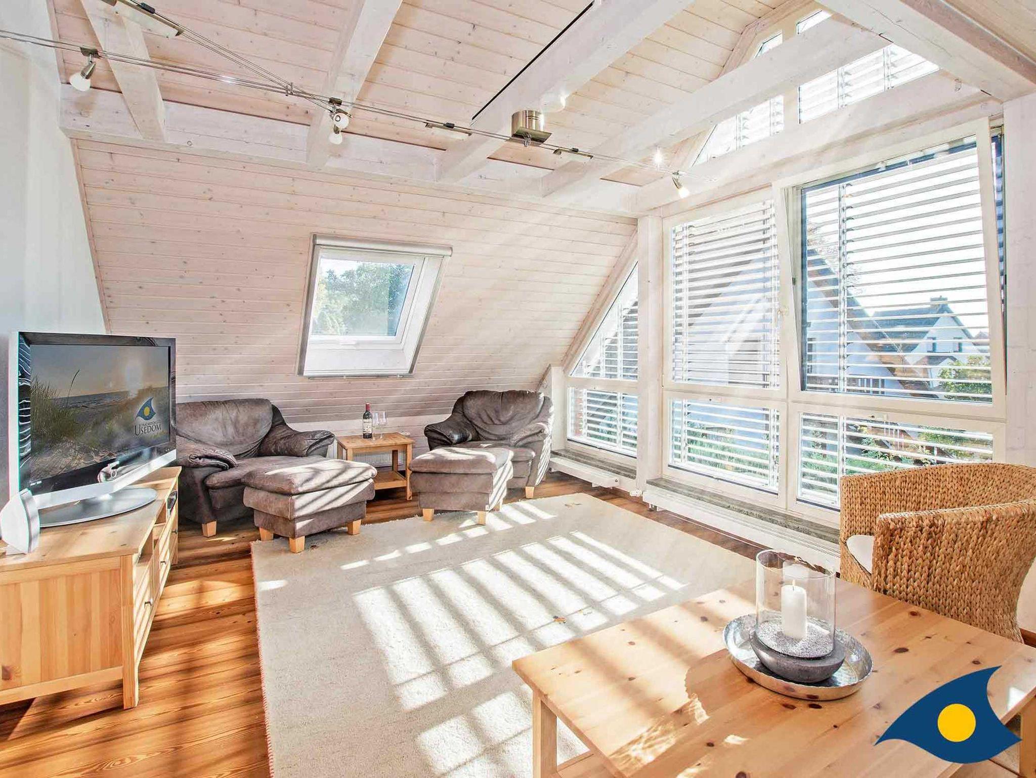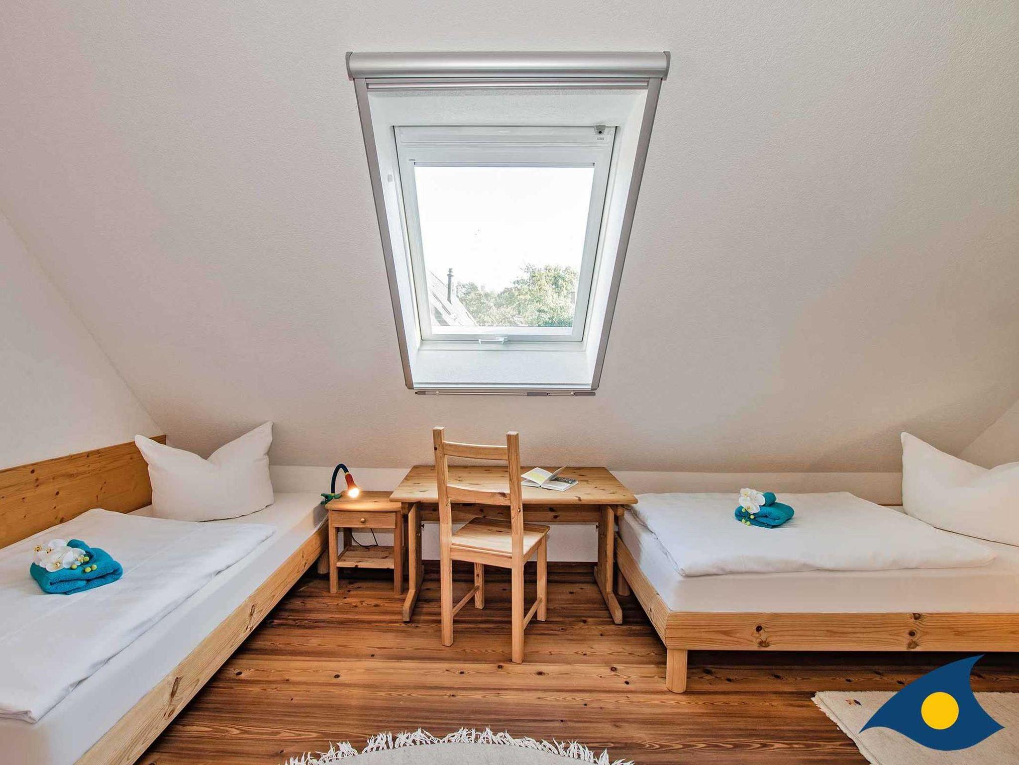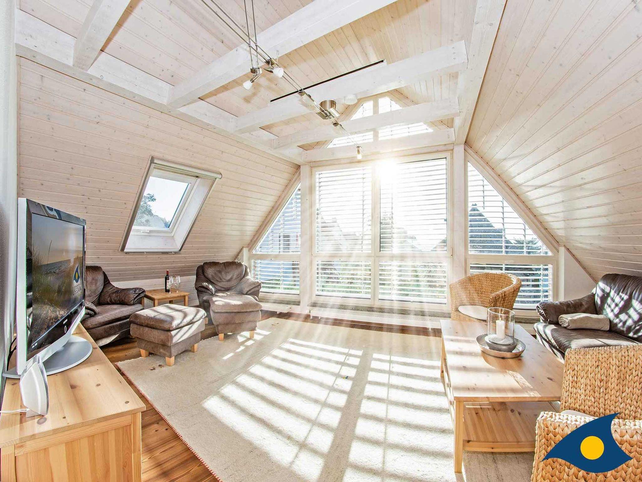 Das Haus ist ausgestattet für 8 Personen zzgl. 1-2 Kleinkinder. Sitzerhöhungen für Kinder und ein Treppengitter sind vorhanden. Im Obergeschoß haben Sie einen grandiosen Blick auf das Achterwasser aus dem komplett verglasten Giebel des gemütlichen Wohnzimmers.