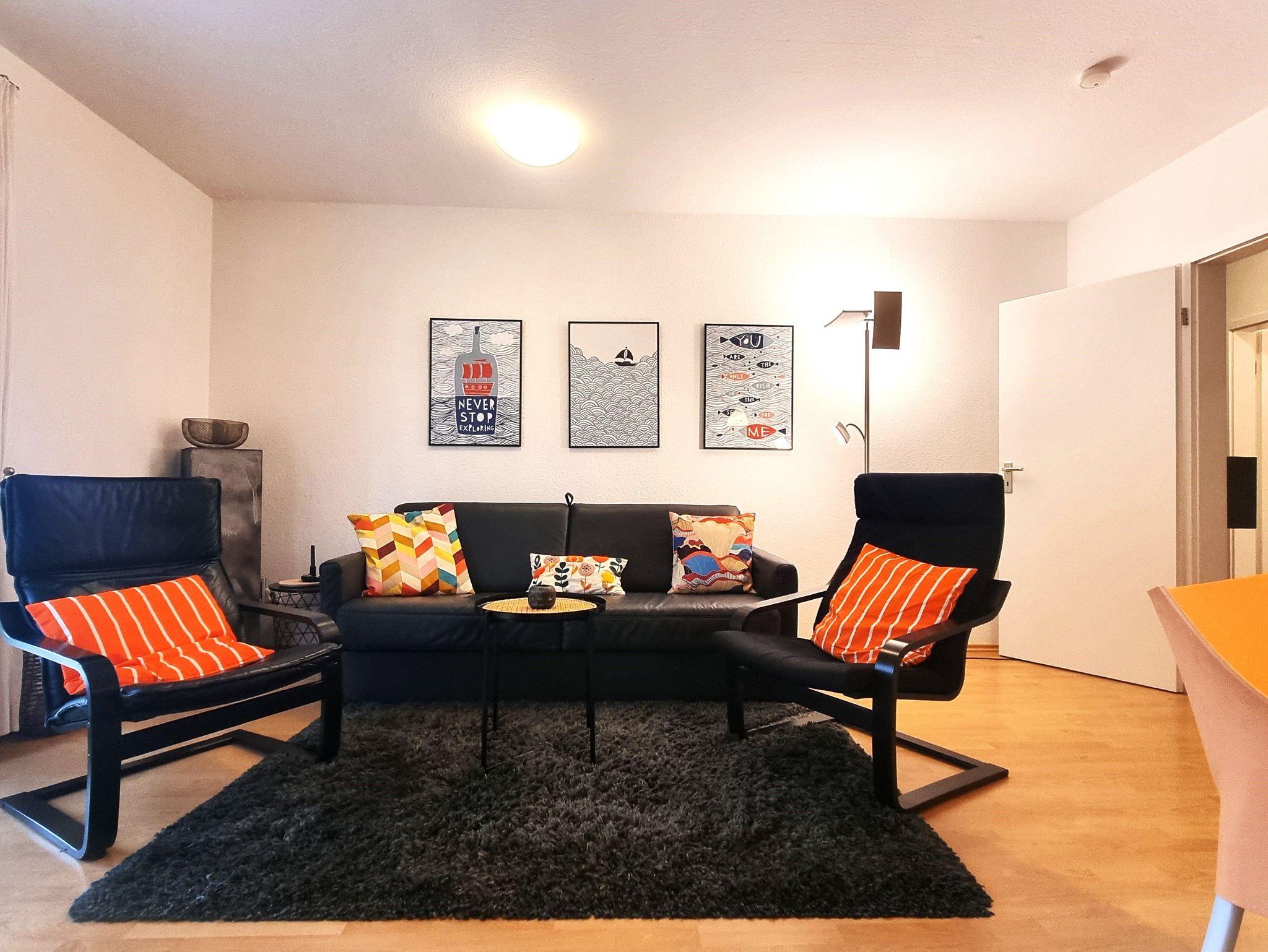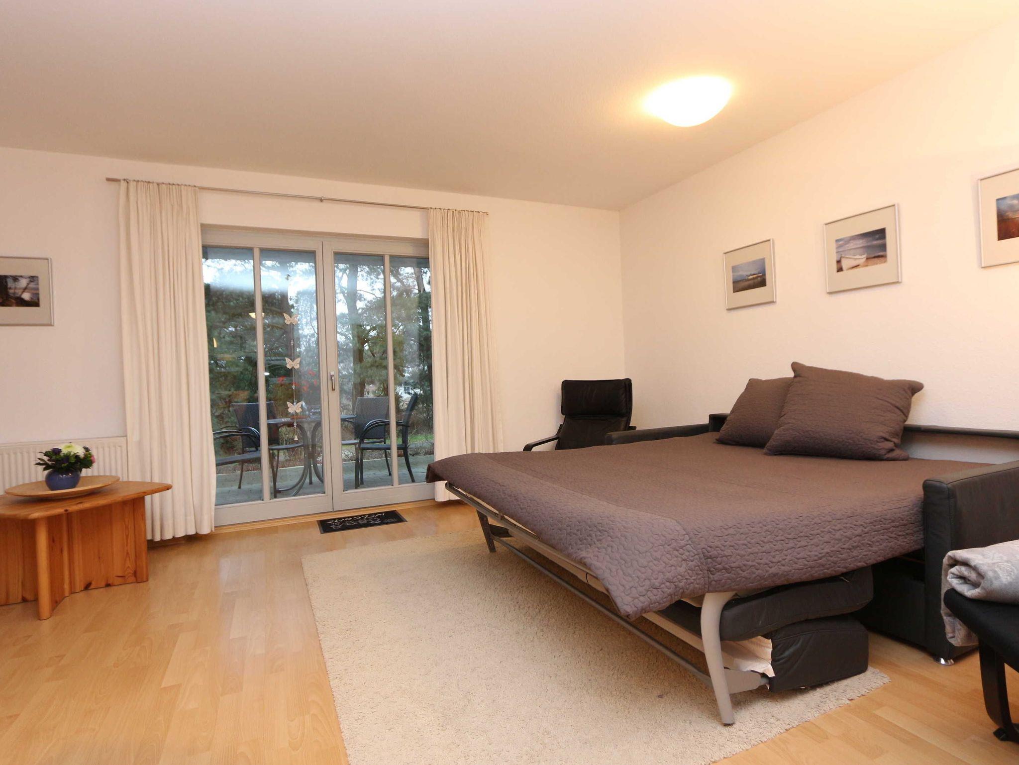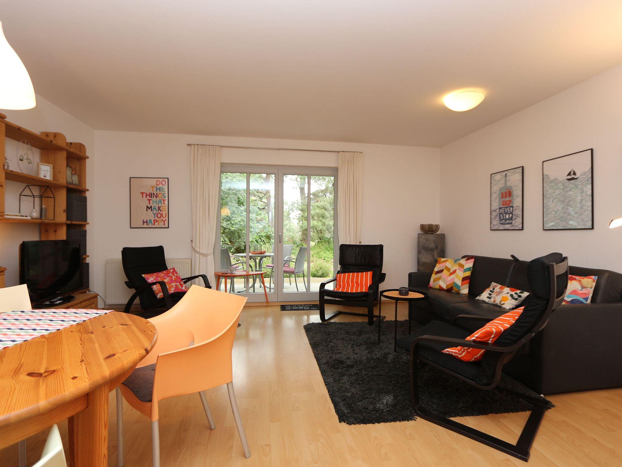 • Das helle Wohnzimmer ist mit einer Essecke, einem Schlafsofa und zwei Sessel ausgestattet. Ein Flachbild-Fernseher ist vorhanden.