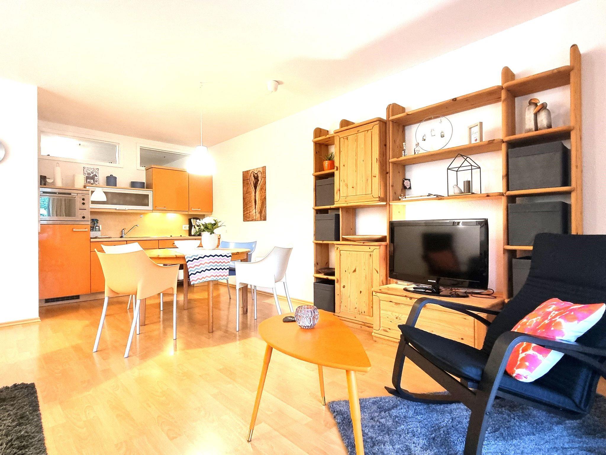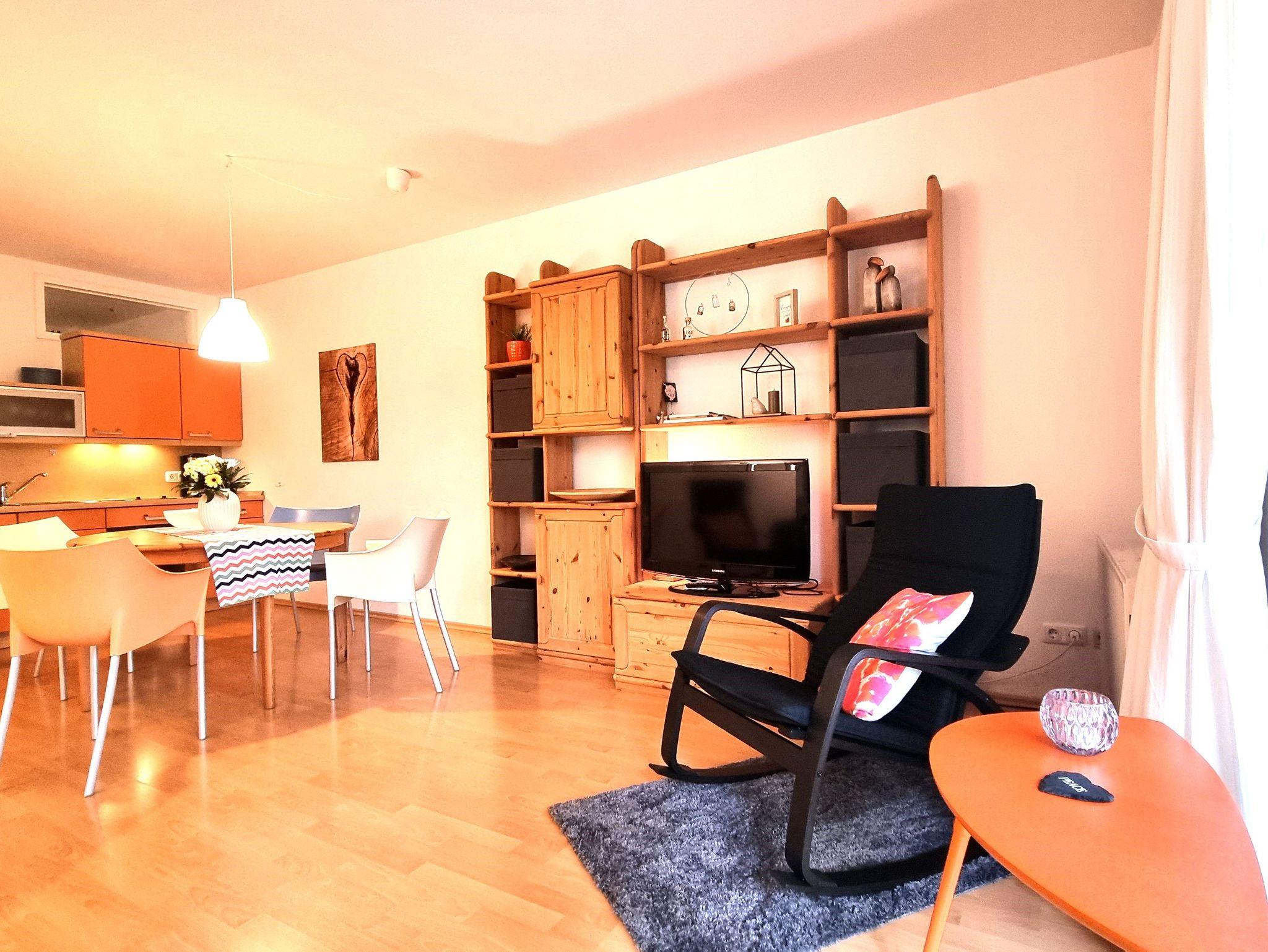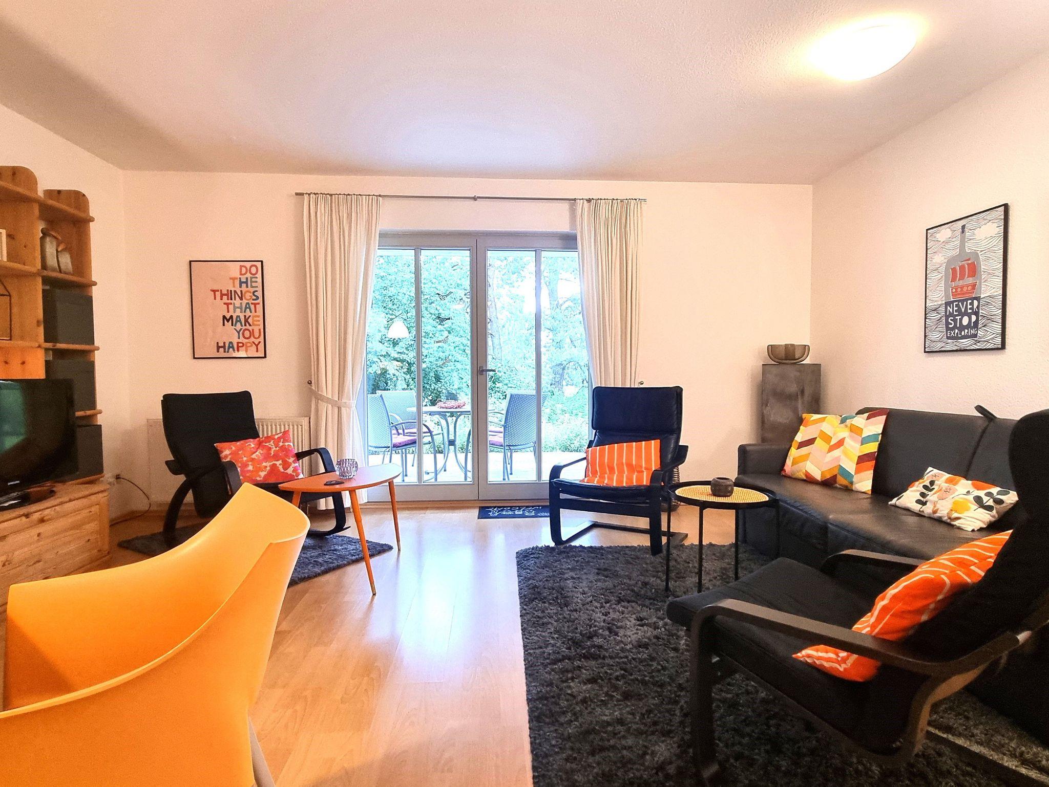 • Das helle Wohnzimmer ist mit einer Essecke, einem Schlafsofa und zwei Sessel ausgestattet. Ein Flachbild-Fernseher ist vorhanden.