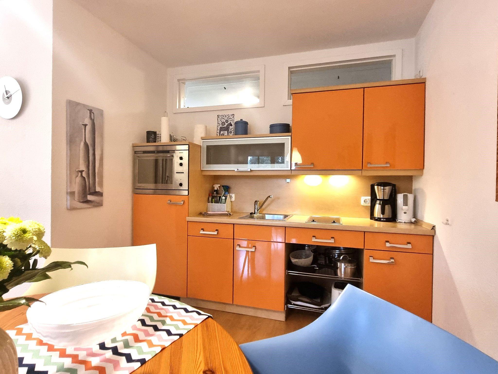 • Die modern eingerichtete Küchenzeile verfügt über ein 2-Platten-Glaskeramikkochfeld, ein Spülbecken, eine Mikrowelle nebst Backfunktion, eine Geschirrspülmaschine, einen Kühlschrank inkl. einem Tiefkühlfach, Kaffeemaschine, Toaster, Wasserkocher und Geschirr.