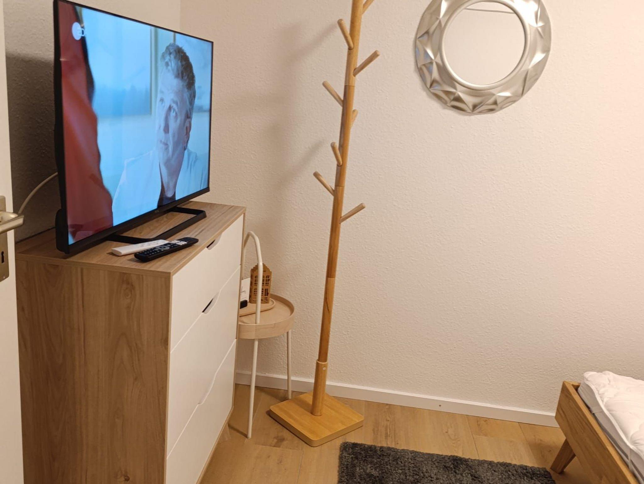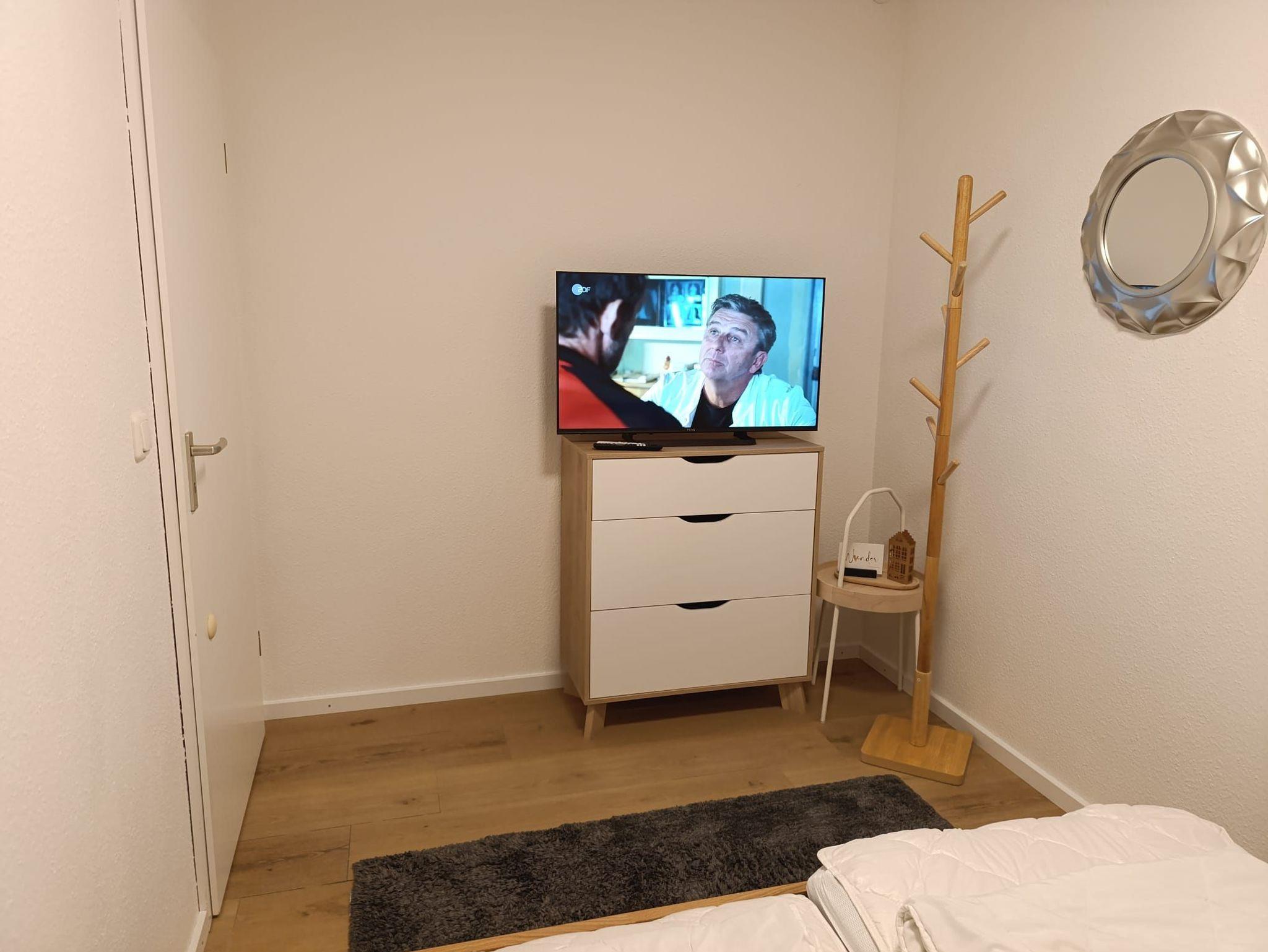 • Das renovierte (2026) Schlafzimmer ist ein innenliegender Raum mit Oberlichtfenstern zur Ess - Ecke hin (ohne Aussenfenster). Es verfügt über ein neues Doppelbett (1,60 x 2,00 m), eine Kommode und ein Smart - TV. Der Fußboden ist mit Vinyl in Eiche - Optik ausgelegt.