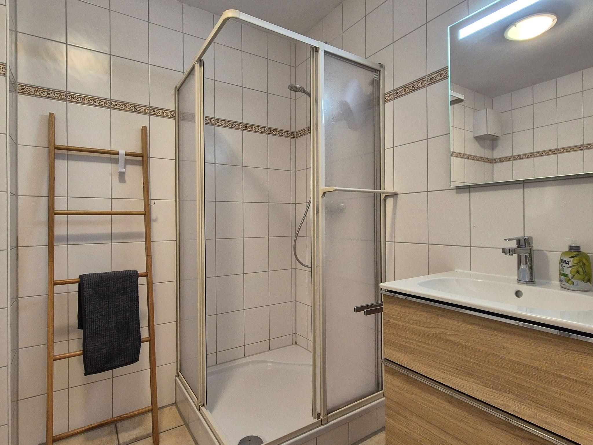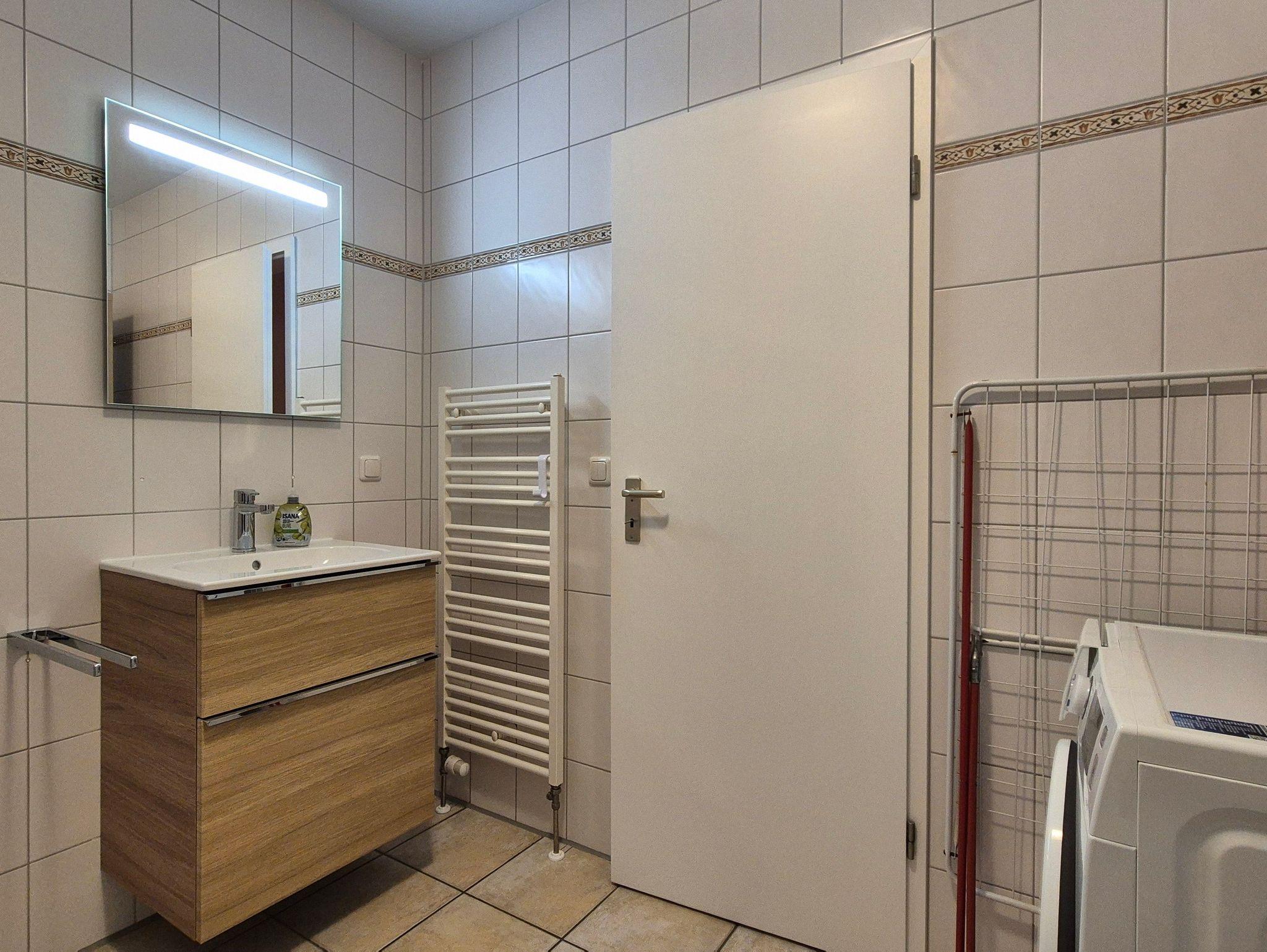 • Das weiß geflieste Bad ist mit WC, Waschbecken, Dusche und Waschmaschine ausgestattet.