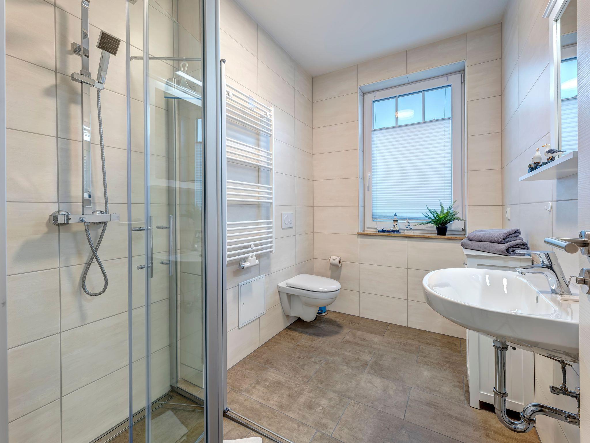 Im Badezimmer finden Sie eine Dusche, ein WC sowie einen Waschtisch vor. Ein Handtuchheizkörper ermöglicht die effektive Trocknung der Handtücher.