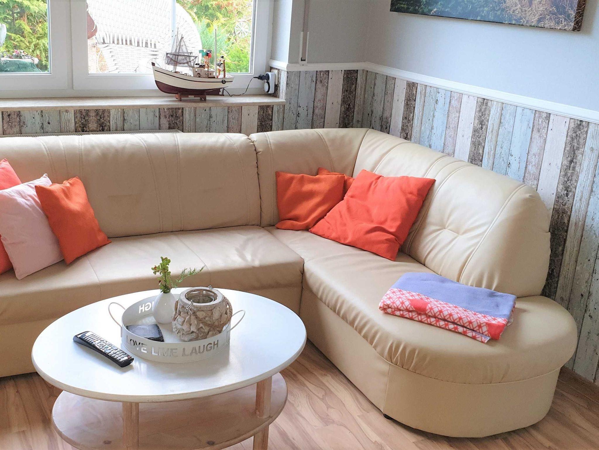 Die Ferienwohnung in der Doppelhaushälfte erstreckt sich über zwei Etagen. Im Erdgeschoss befinden sich das Wohnzimmer mit integrierter Küche (Zwei-Platten-E-Kocher, Kühlschrank, Kaffeemaschine, Toaster, Geschirr etc.), das Bad mit Dusche und WC sowie ein Schlafzimmer mit Etagenbett. Im Frühjahr 2024 wurde die Wohnung noch einmal renoviert.