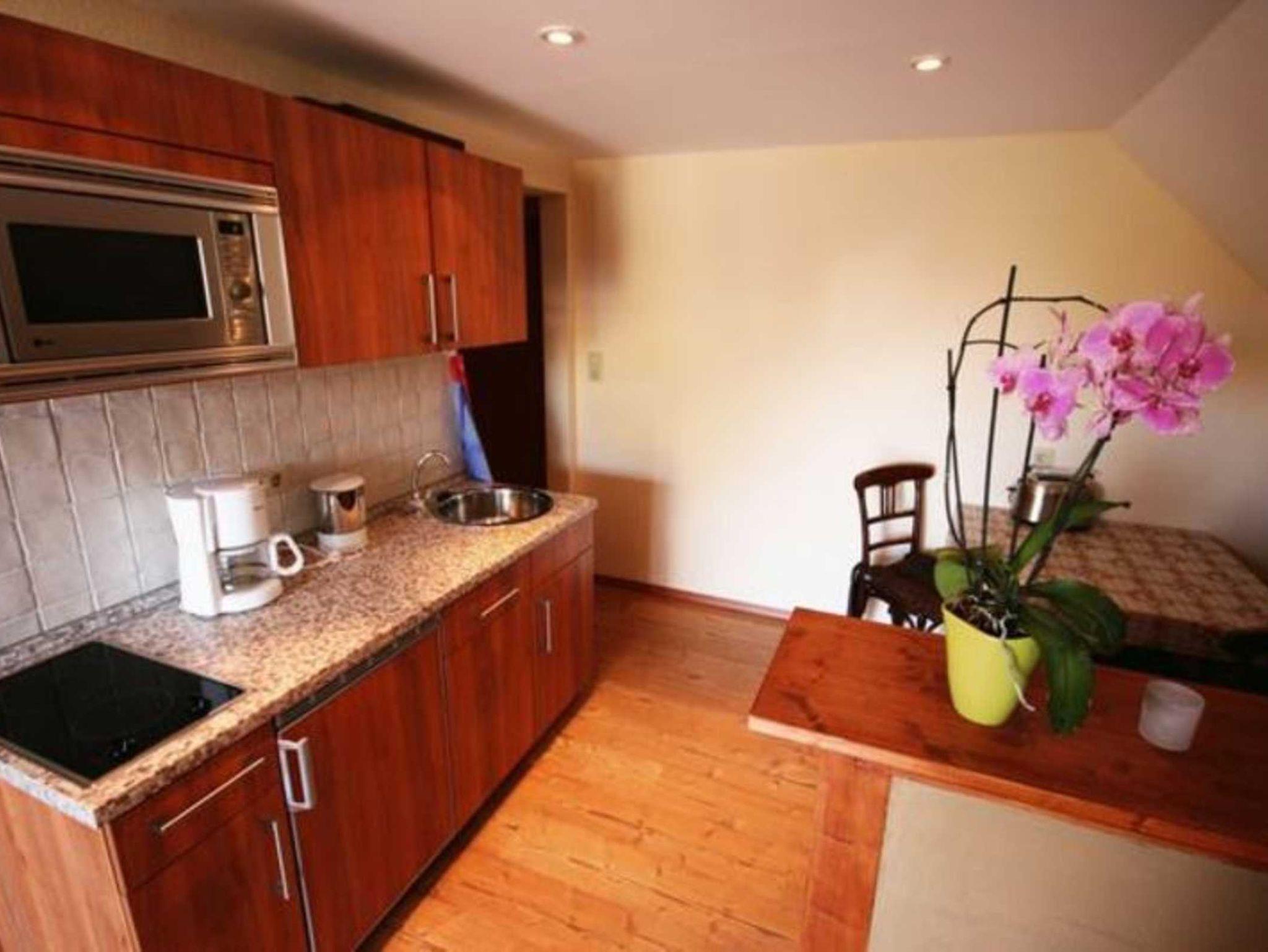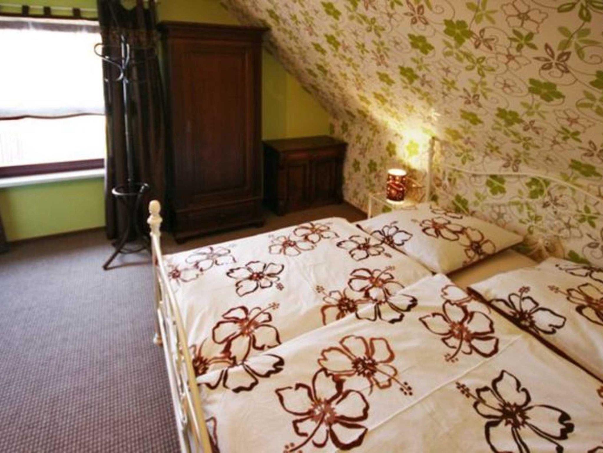 Sie erreichen die 40 qm große Ferienwohnung über eine Treppe und einen Balkon. (separater Eingang) Die Wohnung besteht aus Wohnzimmer mit Küchenzeile (Einbauküche mit Mikrowelle und Grill, Cerankochfeld, Geschirrspüler und div. Ausstattung) Essgruppe, Couch auch als Schlafmöglichkeit zu nutzen, Flachbildfernsehgerät, 1 Schlafraum mit Doppelbett, Dusche und WC, Parkmöglichkeit auf dem Grundstück, Das Rauchen in der Wohnung ist nicht erwünscht. Kinderbett und Hochstuhl werden bei Bedarf ( für die Zeit des Aufenthaltes ) vom Vermieter zur Verfügung gestellt.