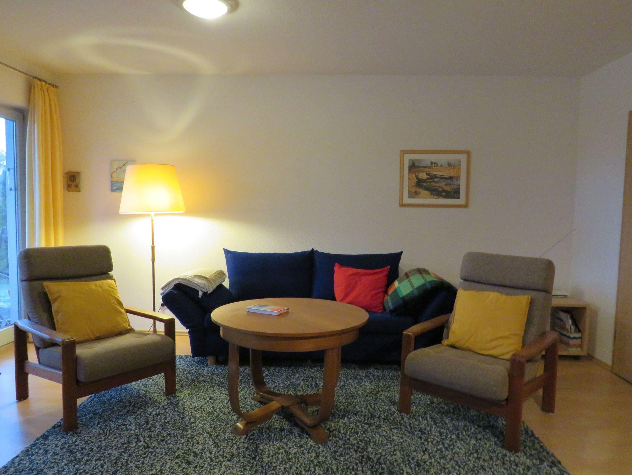 Die gemütliche Ferienwohnung besteht aus einem großen hellen Wohn-Essraum mit einer offenen Küchenzeile (insgesamt ca. 30 m²) und zwei Schlafzimmern. Das größere der Schlafzimmer (ca. 14 m²) ist mit einem Doppelbett und großzügiger Schrankfläche ausgestattet, im 2. Schlafzimmer (ca. 10 m²) stehen zwei Einzelbetten sowie ein Kleiderschrank zur Verfügung. Das 2. Schlafzimmer wird belichtet und belüftet durch Oberlichter über der Küchenzeile im Wohnzimmer. Das Wohnzimmer ist möbliert mit einem Schlafsofa, zwei Sesseln, einer Schrankwand mit Fernseher, in dem sich Bücher, Spiele, Geschirr sowie Karten über die Insel befinden, und einem Esstisch mit 4 Stühlen. Außerdem gibt es ein E-Piano zum Musizieren. Im Duschbad (ca. 6 m²) befindet sich ein Wäscheständer zum Trocknen, außerdem im Badezimmerschrank ein Fön für die Gäste. Die Küchenzeile ist mit Ceranfeld, Backofen mit Mikrowellenfunktion, Kaffeemaschine, Heißwasserkocher, Toaster, Kühlschrank mit Gefrierfach und Spülmaschine ausgestattet.