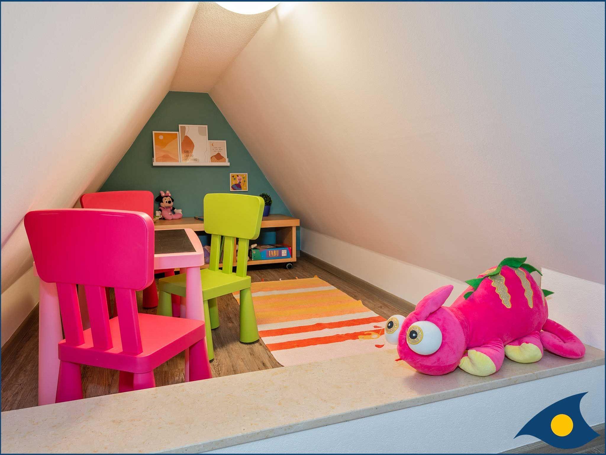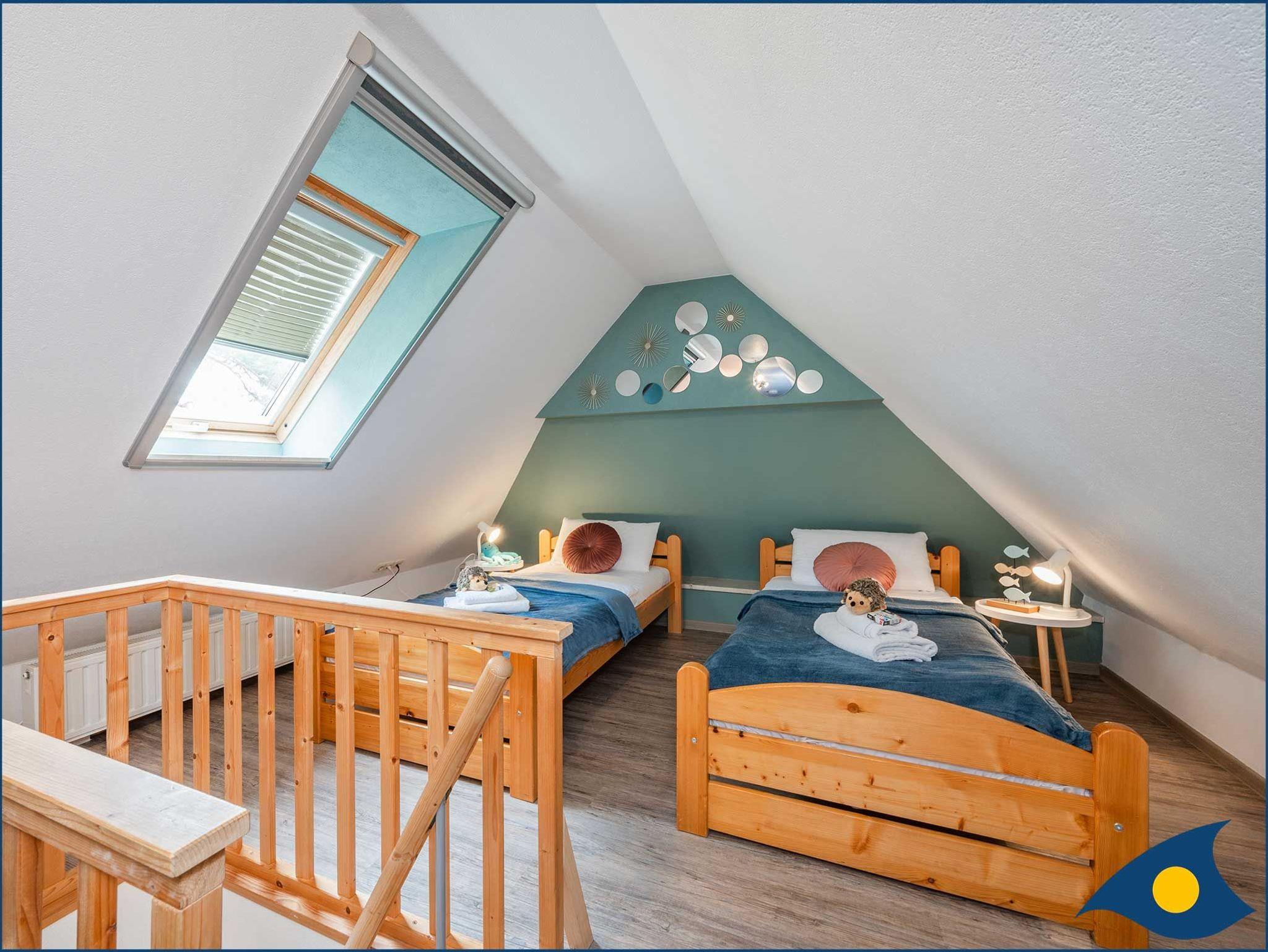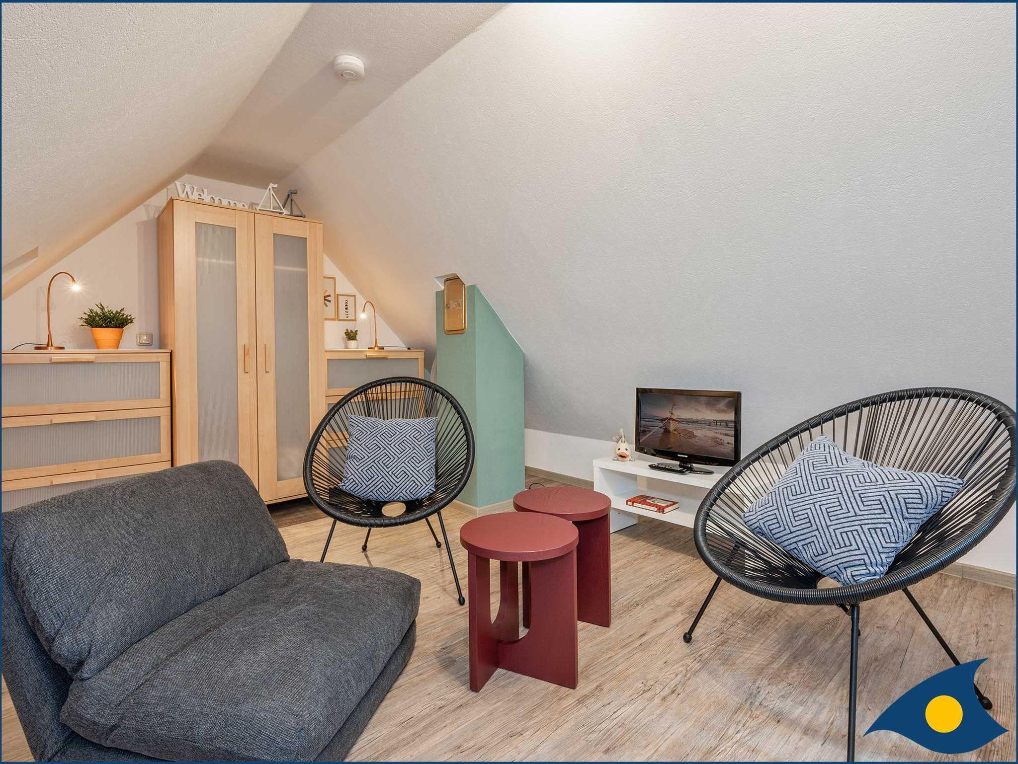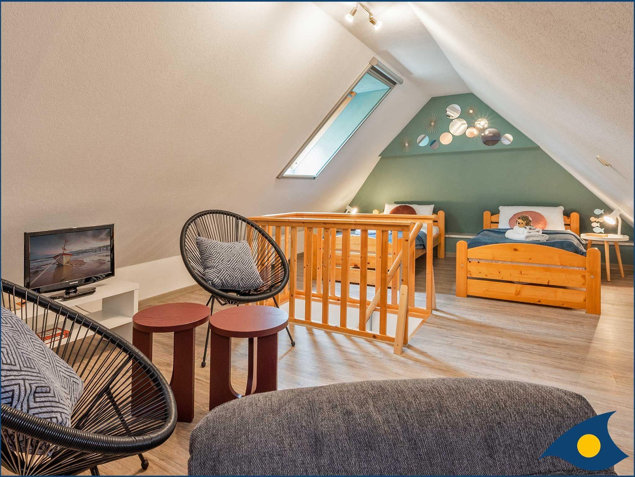 Die Ferienwohnung HUGO bietet mit ihren ca. 65 qm Platz für 2 ? 4 Personen im Obergeschoss rechts des FRÄULEIN LODDIN. Zwei Personen finden ihren Schlafplatz im gemütlichen, ausgebauten Spitzboden mit separater Sitzecke und Spielzimmer. Die Erstausstattung Bettwäsche und Handtücher sind inklusive.