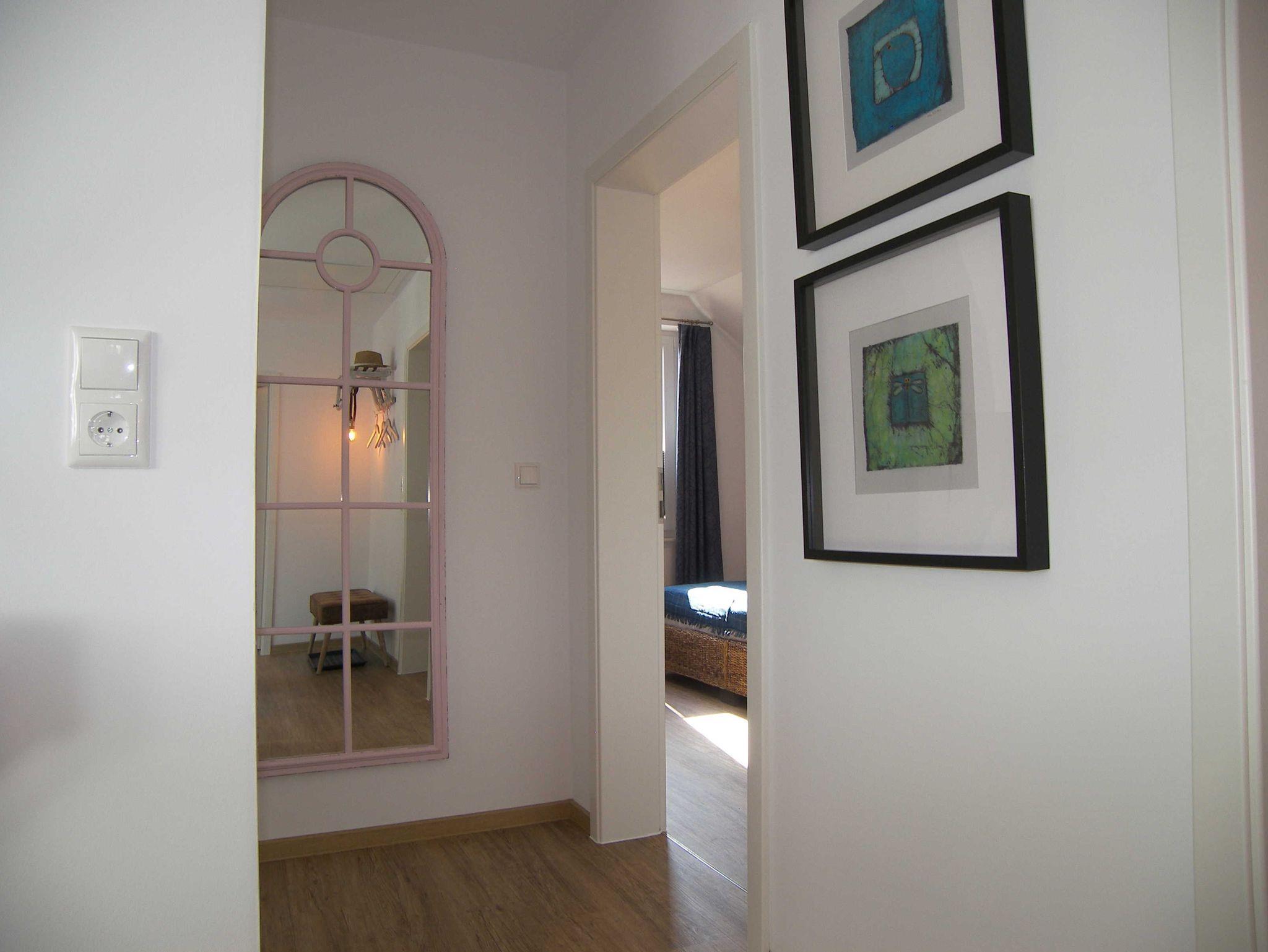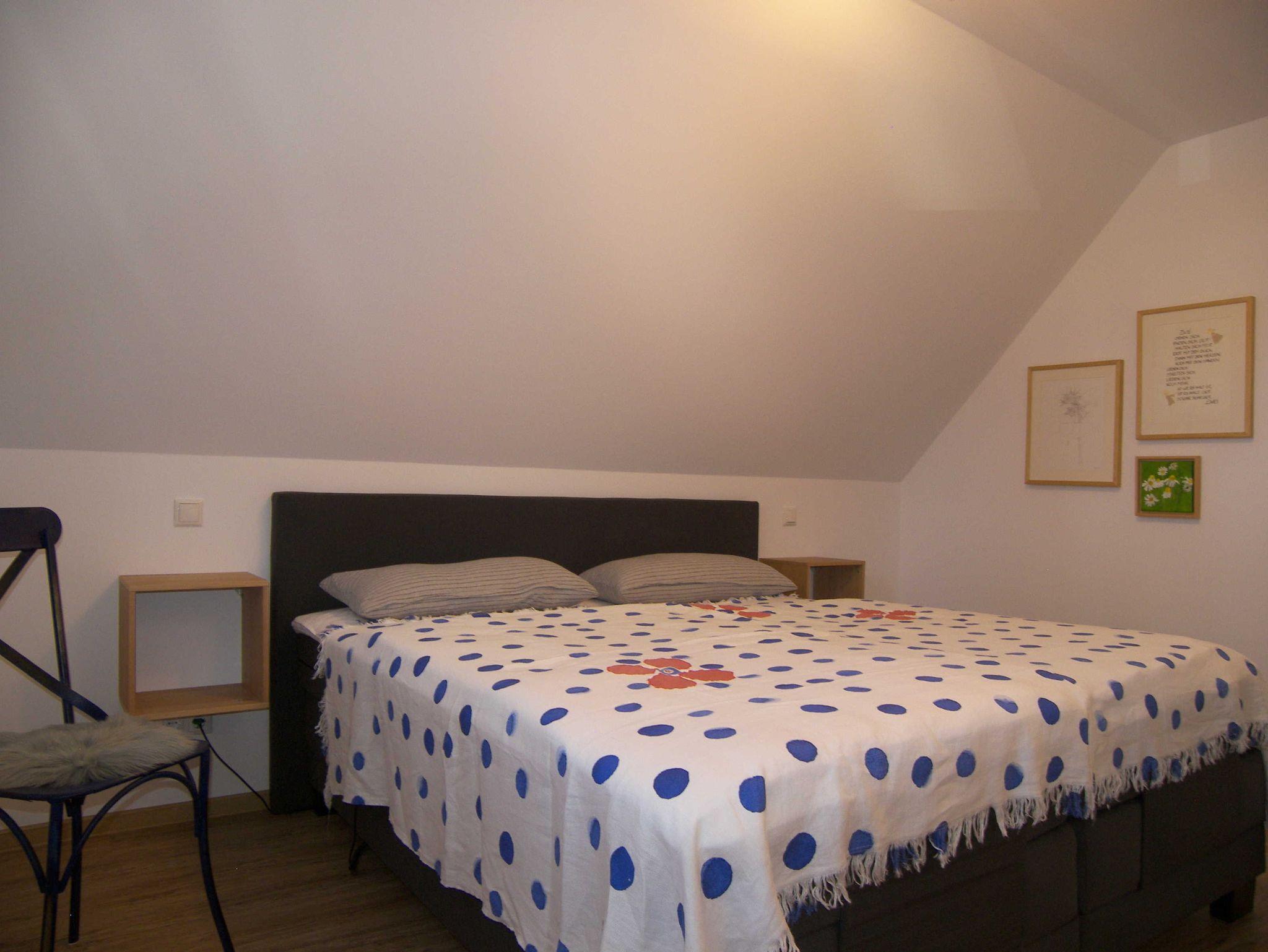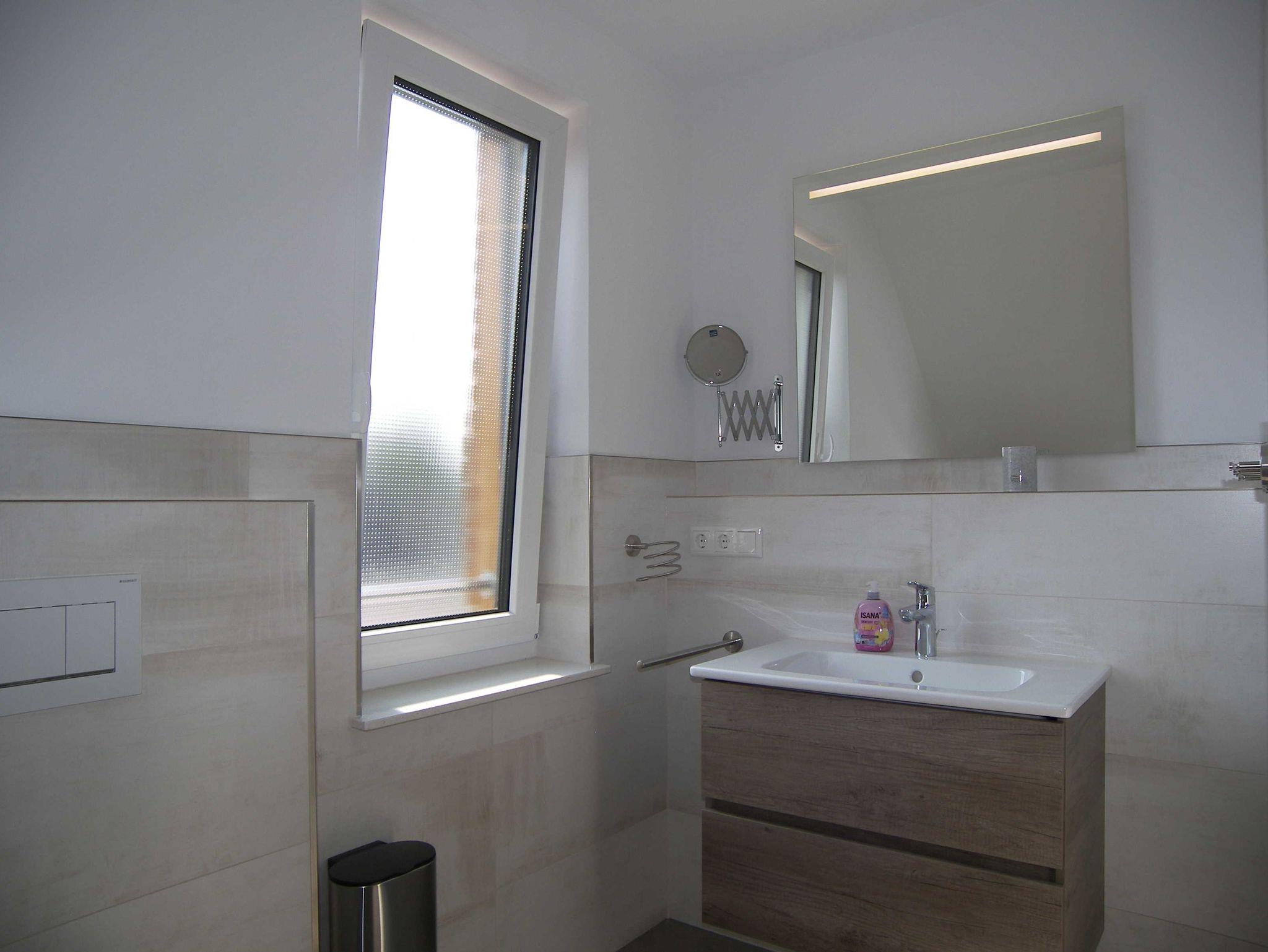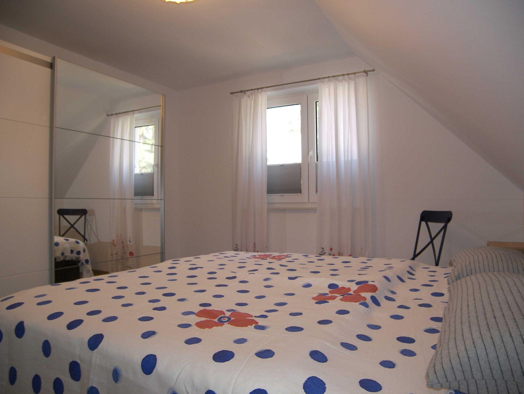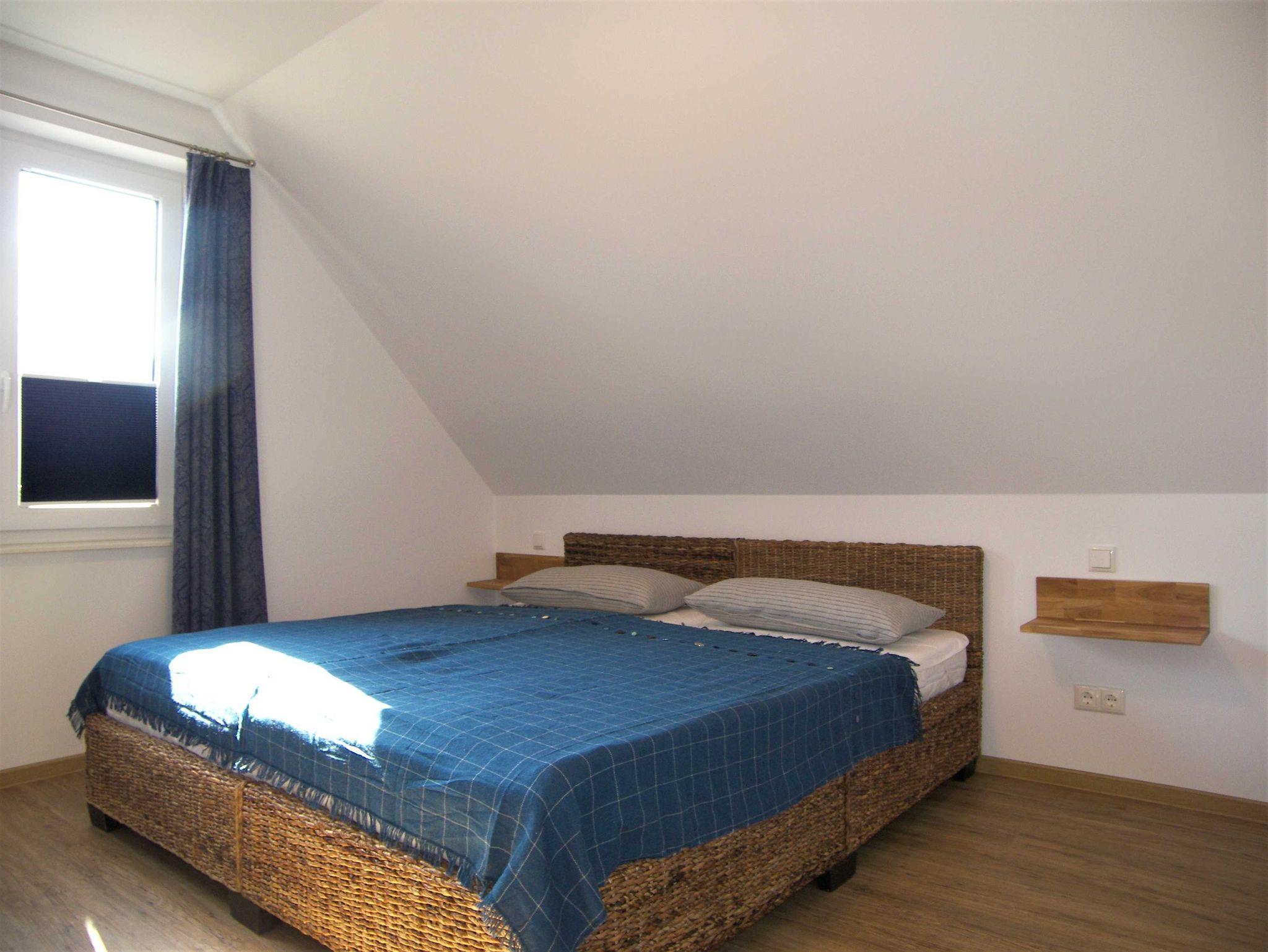 Die Ferienwohnung mit W-Lan und Fußbodenheizung befindet sich im Obergeschoß des Hauses. Über den gemeinsamen Eingang gelangen Sie über die Treppe direkt in Ihre Wohnung die mit einem Wohnzimmer und offener Einbauküche, 2 Schlafzimmern und Bad, sowie einem Flur ausgestattet ist. Das Wohnzimmer bietet ein gemütliches Sofa, einen Flachbild-Smart TV und Stauraum. In der Küche finden Sie einen Backofen, einen Kühlschrank mit separatem Tiefkühlfache, Spülmaschine, Kaffeemaschine, Toaster und Wasserkocher und vieles mehr. Im ersten Schlafzimmer befindet sich ein erhöhtes Boxspringbett mit elektrisch verstellbaren Matratzen und im zweiten Schlafzimmer ist ein ebenfalls hochwertiges Doppelbett mit Lattenrosten. Beide Schlafzimmer sind mit Kleiderschränken, Insektenschutz und Verdunklungsmöglichkeiten ausgestattet. Im Badezimmer mit WC ist eine ebenerdige Dusche inkl. Regendusche. Zusätzlich gibt einen Fön und einen Kosmetikspiegel.