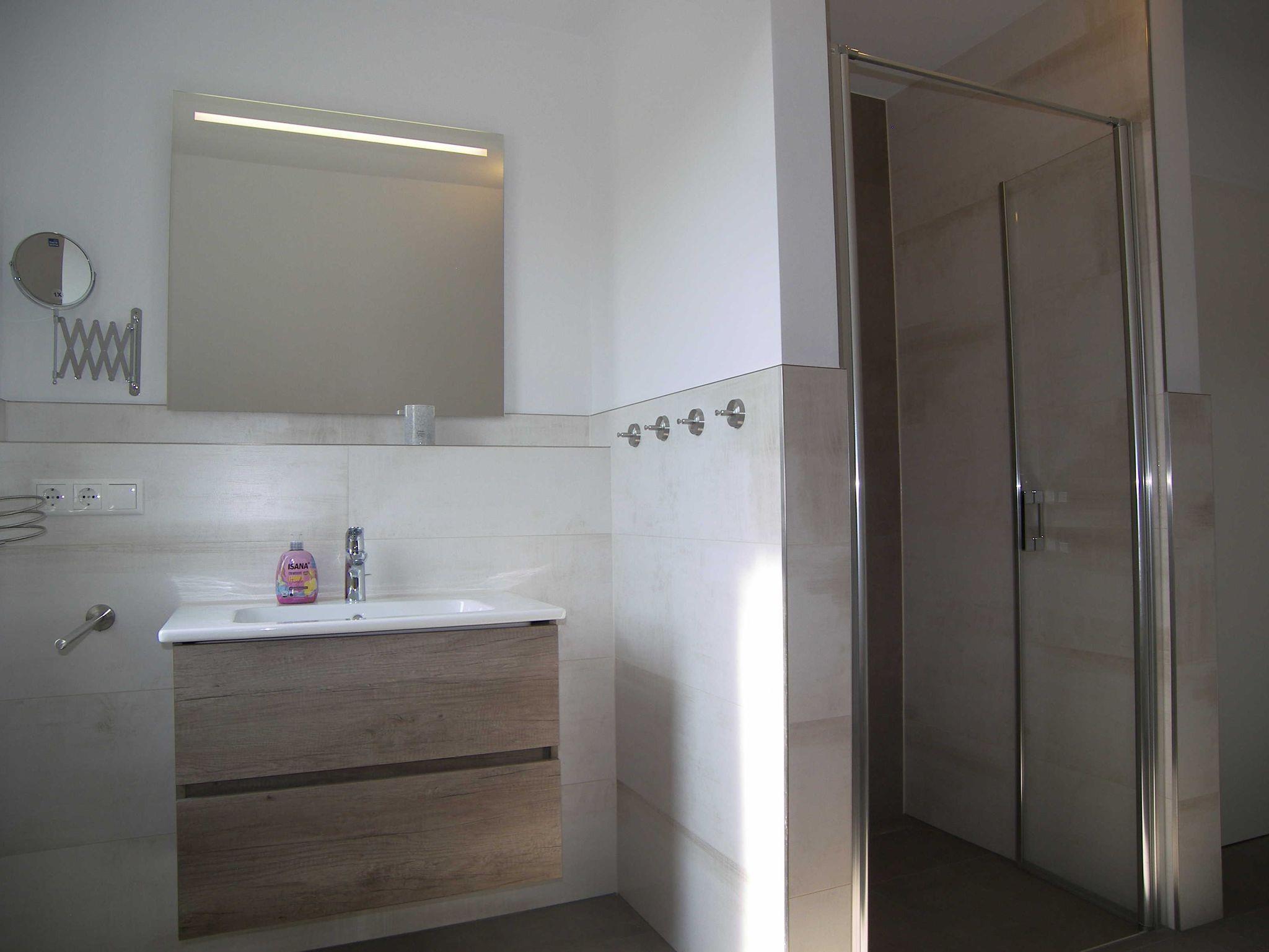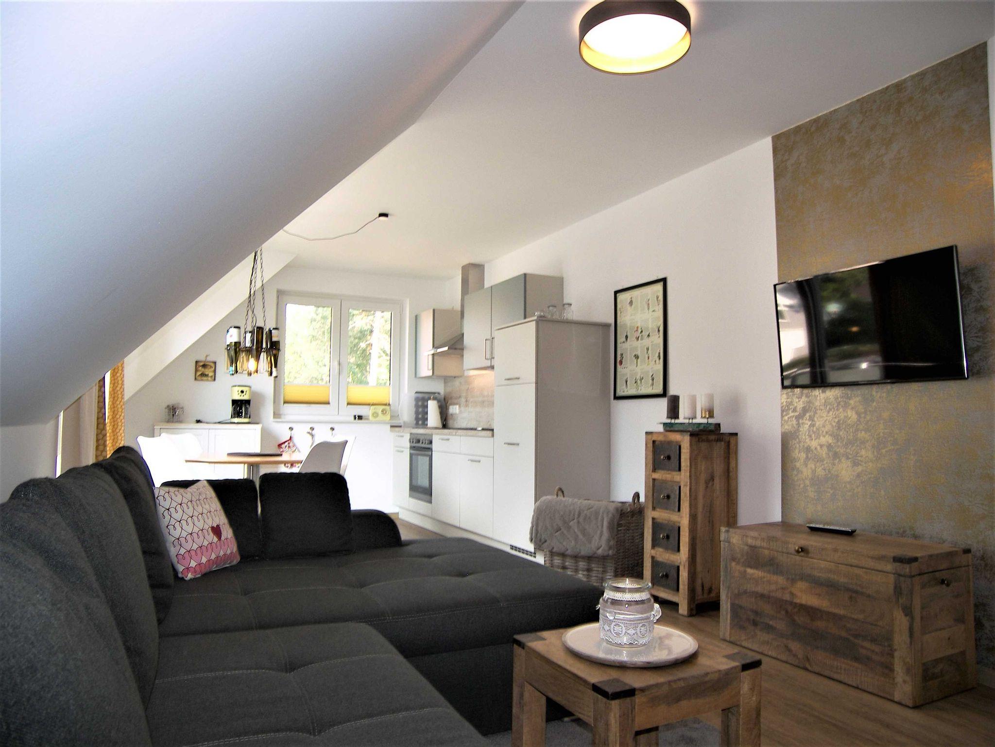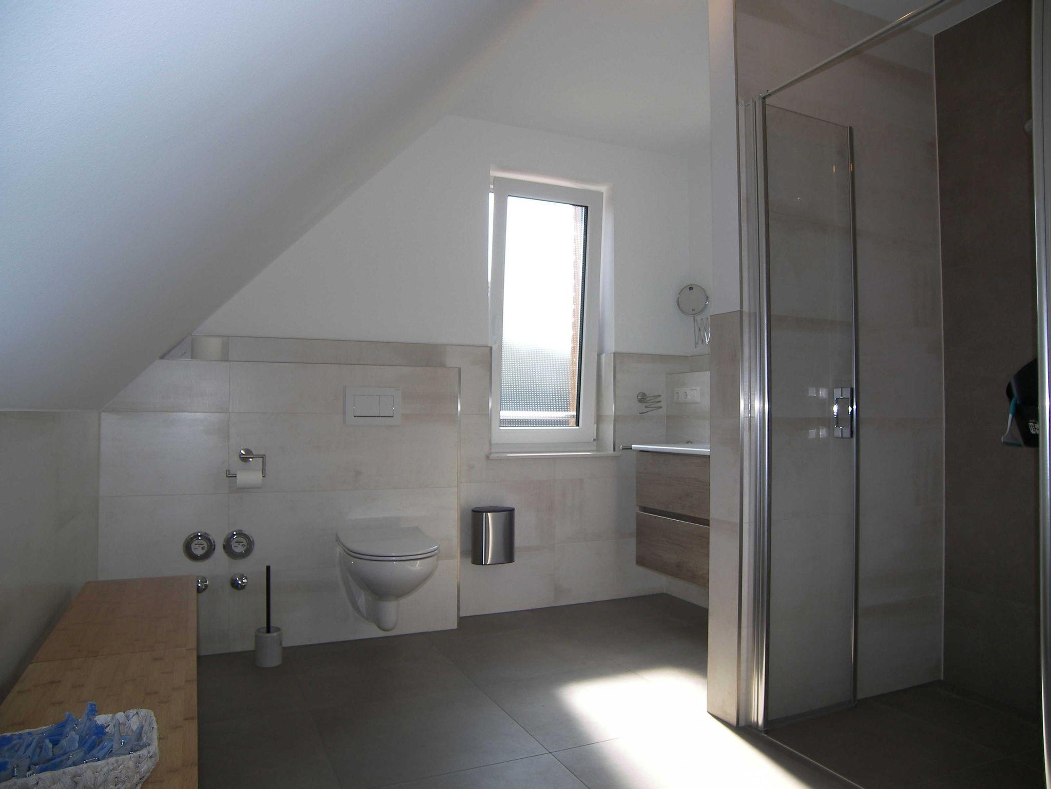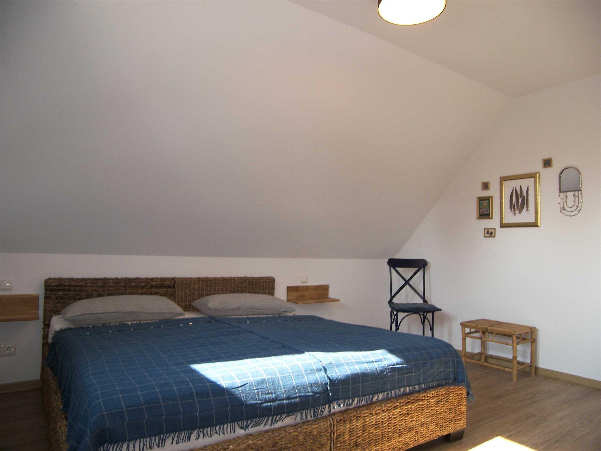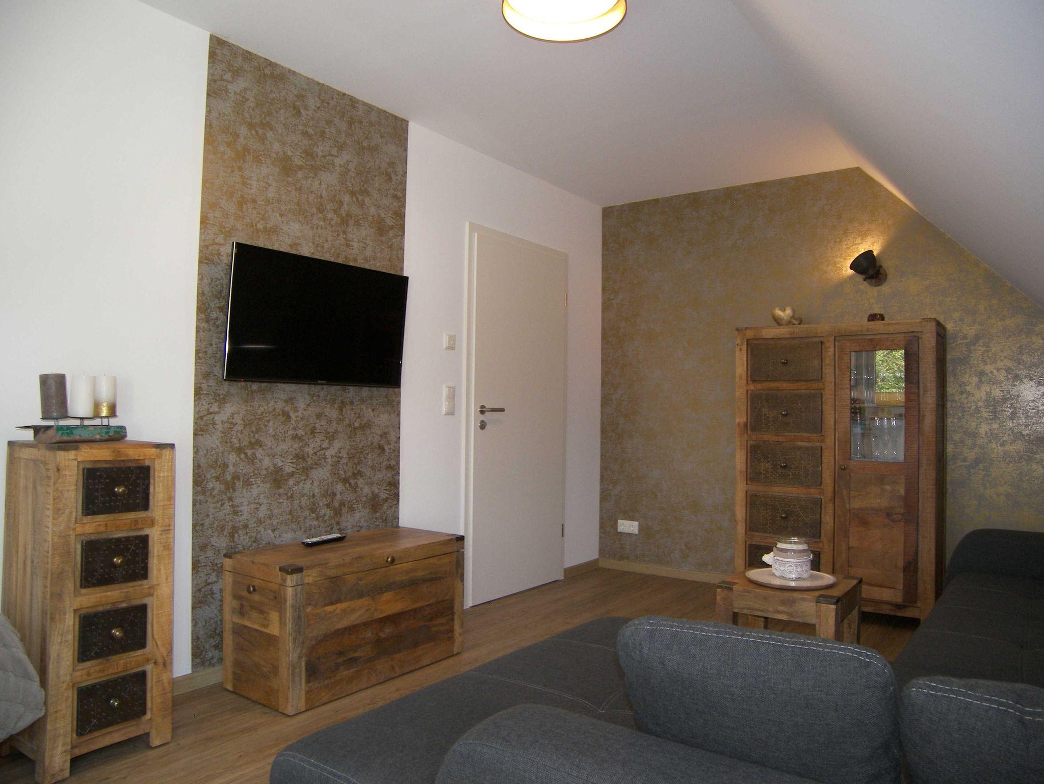 Die Ferienwohnung mit W-Lan und Fußbodenheizung befindet sich im Obergeschoß des Hauses. Über den gemeinsamen Eingang gelangen Sie über die Treppe direkt in Ihre Wohnung die mit einem Wohnzimmer und offener Einbauküche, 2 Schlafzimmern und Bad, sowie einem Flur ausgestattet ist. Das Wohnzimmer bietet ein gemütliches Sofa, einen Flachbild-Smart TV und Stauraum. In der Küche finden Sie einen Backofen, einen Kühlschrank mit separatem Tiefkühlfache, Spülmaschine, Kaffeemaschine, Toaster und Wasserkocher und vieles mehr. Im ersten Schlafzimmer befindet sich ein erhöhtes Boxspringbett mit elektrisch verstellbaren Matratzen und im zweiten Schlafzimmer ist ein ebenfalls hochwertiges Doppelbett mit Lattenrosten. Beide Schlafzimmer sind mit Kleiderschränken, Insektenschutz und Verdunklungsmöglichkeiten ausgestattet. Im Badezimmer mit WC ist eine ebenerdige Dusche inkl. Regendusche. Zusätzlich gibt einen Fön und einen Kosmetikspiegel.