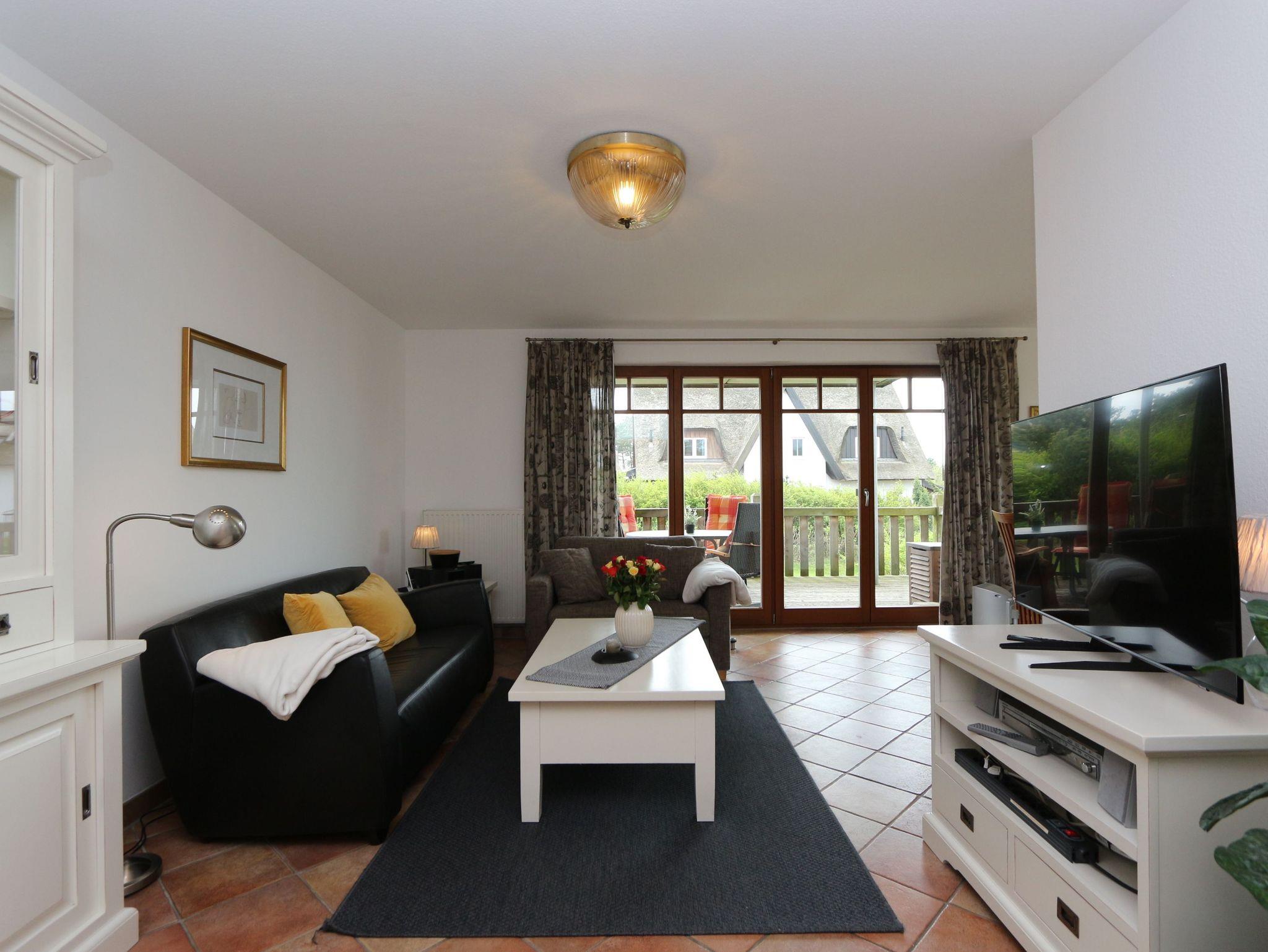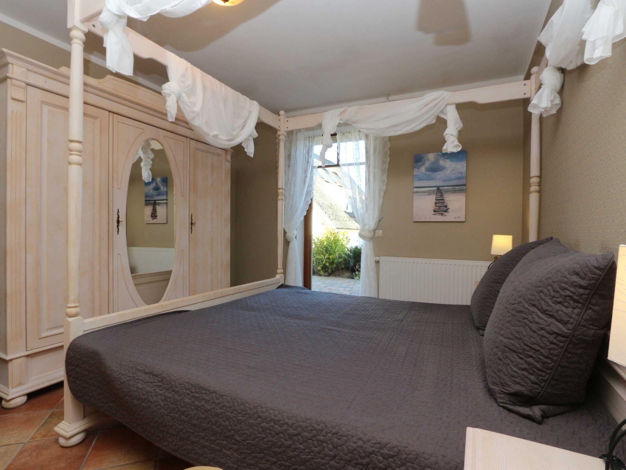 Wir bieten Ihnen hier eine attraktive Ferienwohnung im Erdgeschoss unseres herrlichen Reetdachhauses für 2 bis 4 Personen. Zur Wohnung gehört 1 Bad, 1 Schlafzimmer, 1 Wohnzimmer mit Essecke, 1 Küche inkl. Einbauküche, 1 Flur mit Etagenbett hinter einem Raumteiler, 1 große überdachte Holzterrasse, 1 Terrasse und 1 KFZ-Stellplatz.