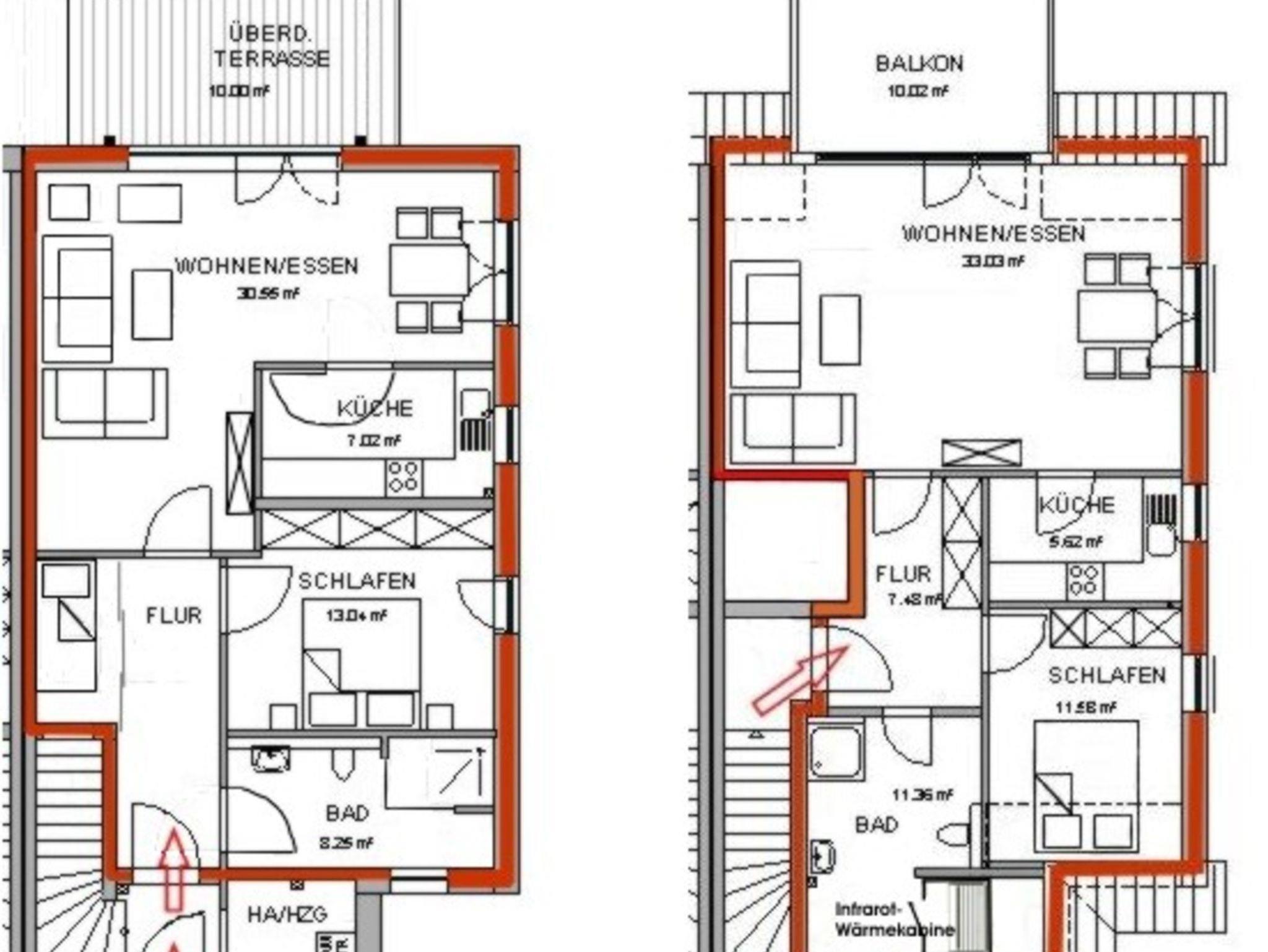 • Die Erdgeschosswohnung verfügt über 2 Terassen, die nach Süden und Westen ausgerichtet sind. Die Holzterrasse ist überwiegend überdacht.