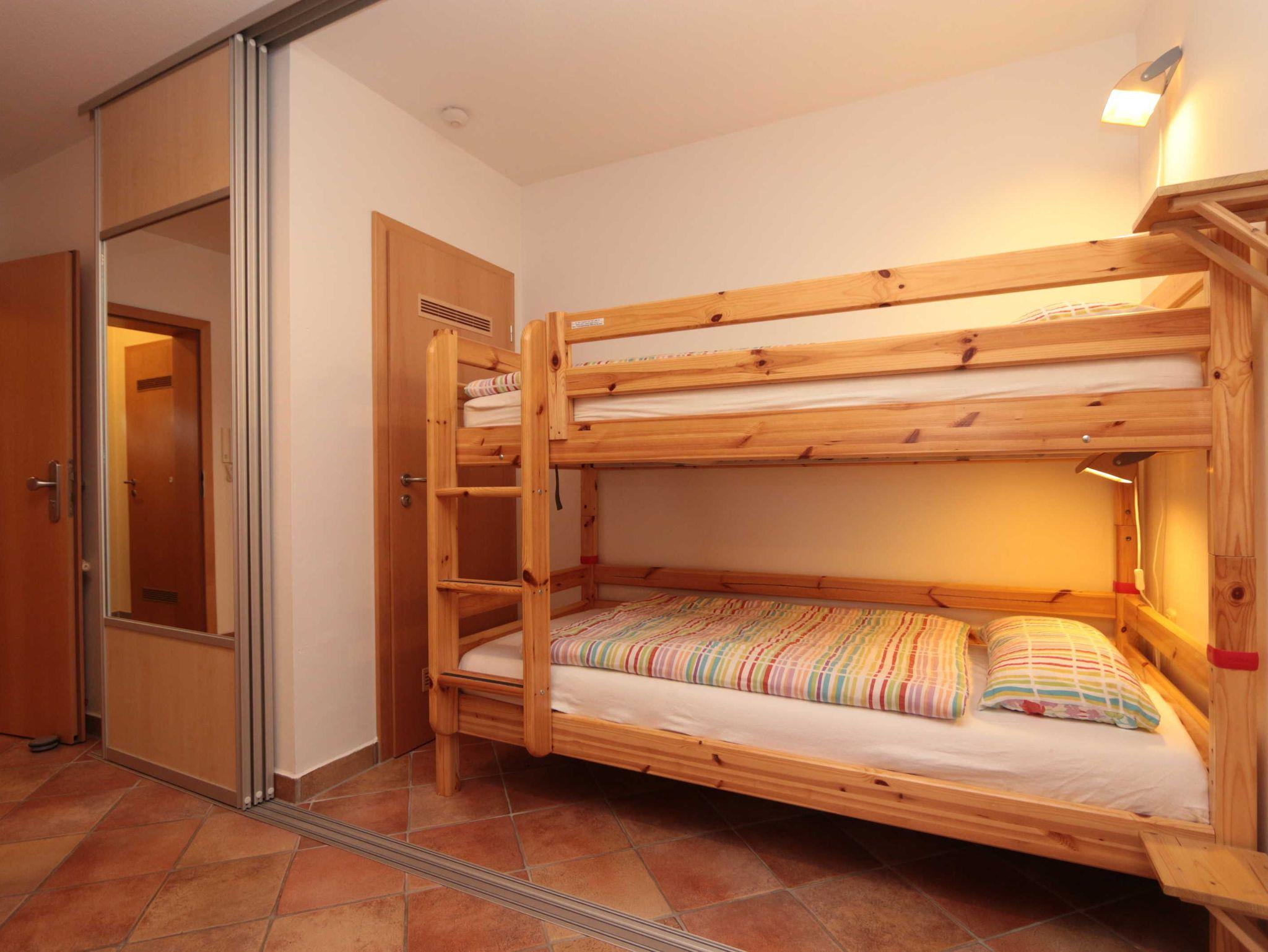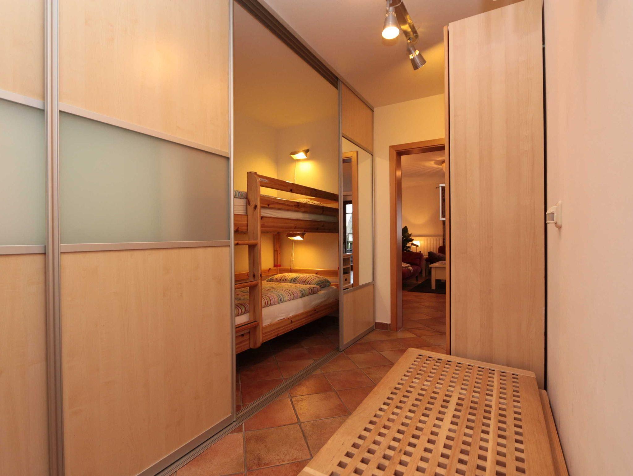 - Flur mit Garderobe und hinter eine dreiteiligen Schiebewand steht eine Etagenbett;