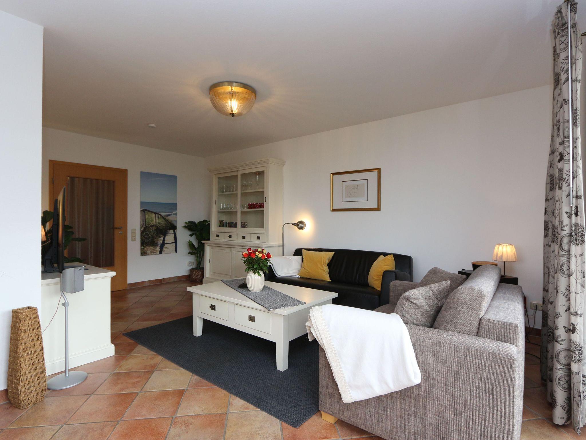 - Wohnzimmer mit einem Sofa, Couchtisch, Fernseher, Anrichte, einem Sessel der auch als zusätzliches Bett genutzt werden kann. Dieser Bettsessel hat eine Liegefläche von 85 x 195 cm und ist mit einer normalen Matratze ausgestattet;