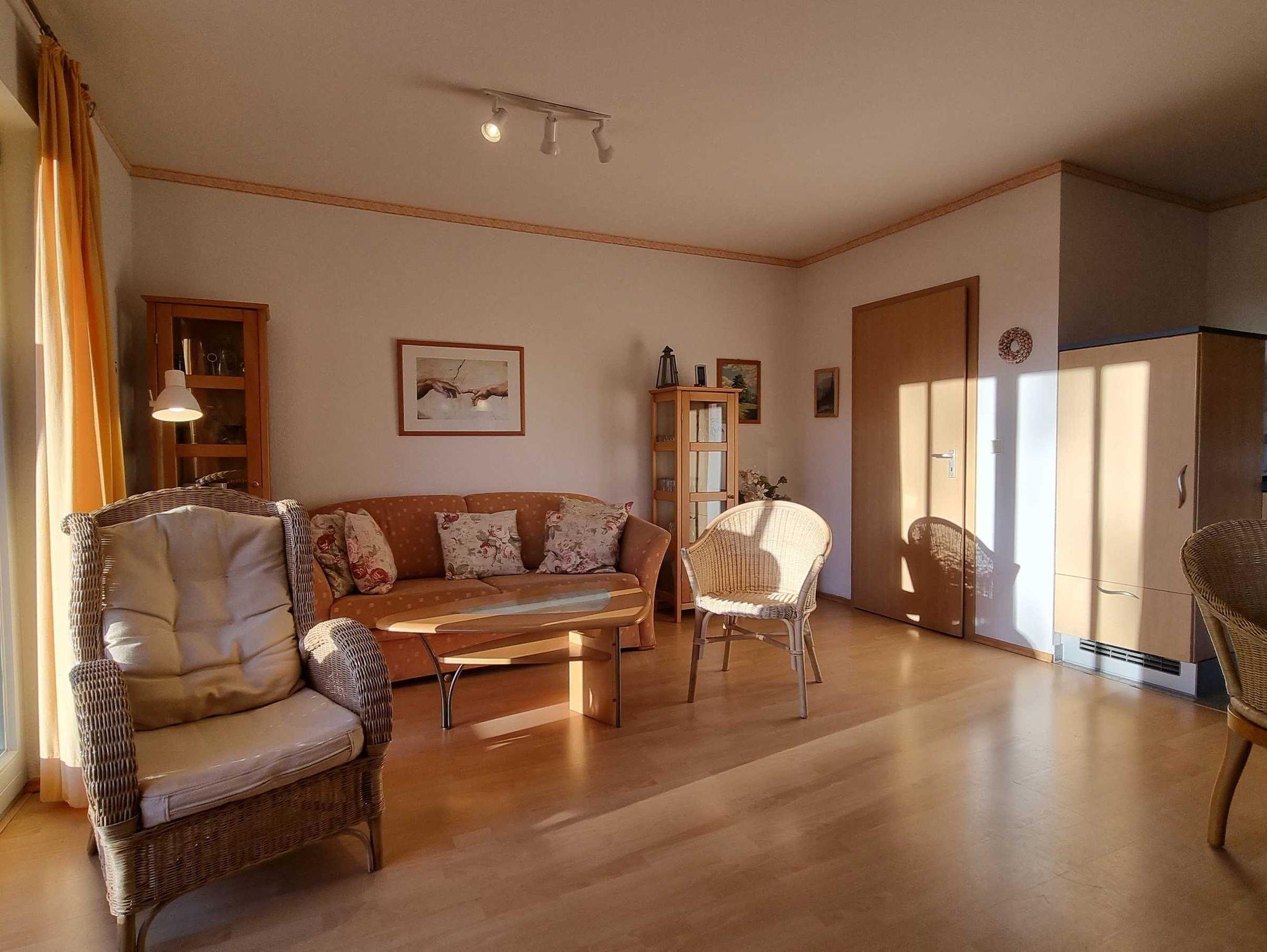 • Das helle Wohnzimmer ist mit einer Essecke für 4 Personen, einem Sofa und zwei Sessel ausgestattet. Ein Flachbild-Fernseher ist vorhanden.