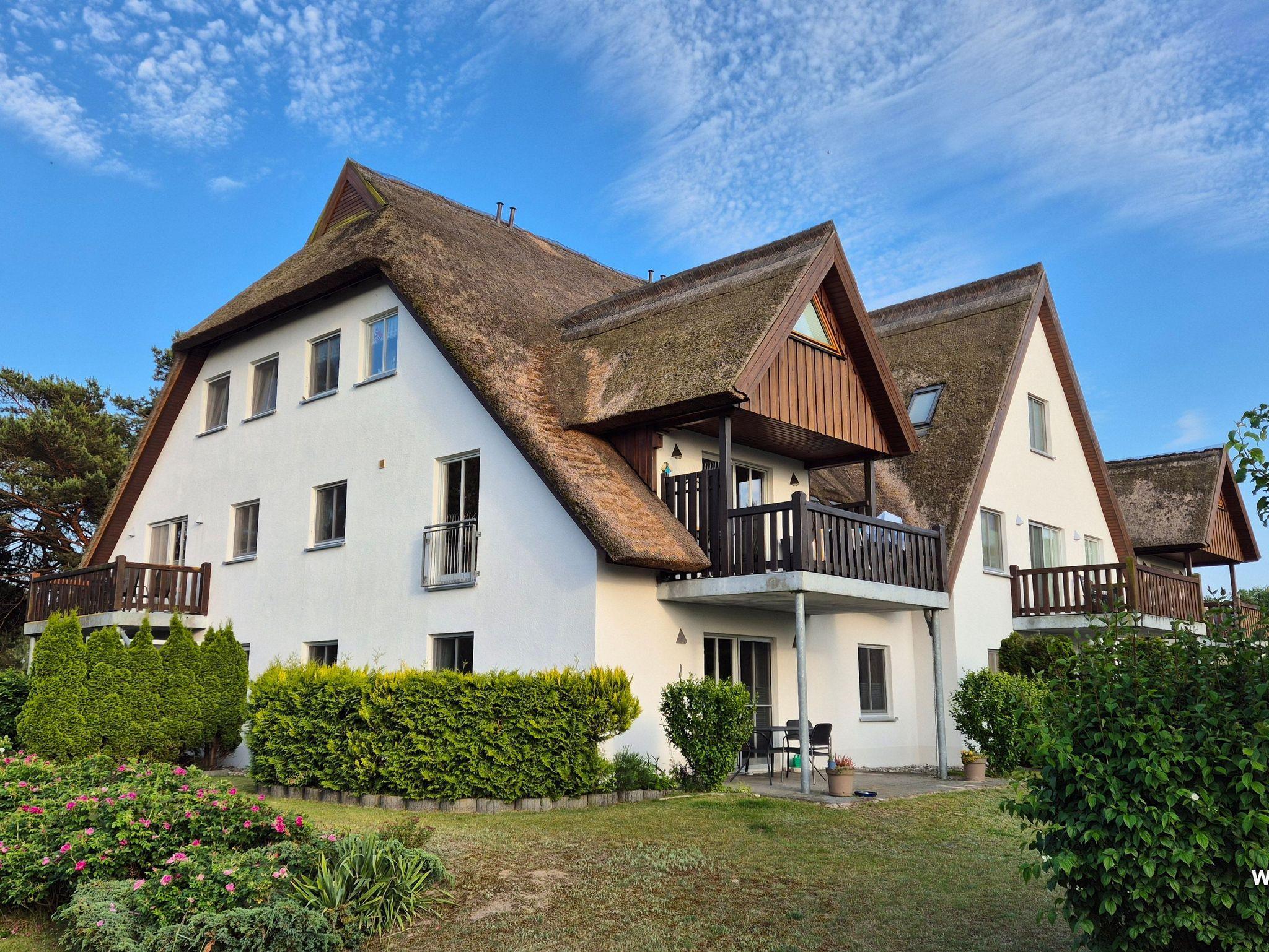 In schöner Lage in einem Reetdachhaus in 17459 Loddin, Diplomatenweg 1 bieten wir eine 3-Zimmer-Ferienwohnung für 2 bis 4 Personen an. Die Ferienwohnung befindet sich in einem wunderschönen neuen Reetdachmehrfamilienhaus, welches eingebettet in eine herrliche Landschaft und umgeben von weiteren hübschen reetgedeckten Häusern in der Nähe zum Achterwasser steht.