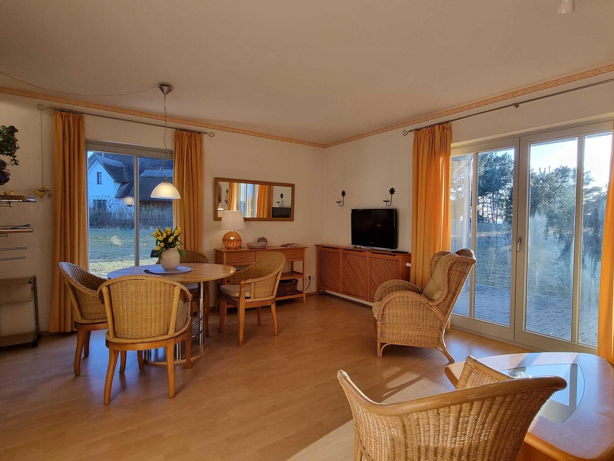 Die 3-Zimmer Ferienwohnungen befindet sich im Erdgeschoß eines Reetdachhauses und verfügt über ein Wohnzimmer mit Essecke und eine offenen Küche, ein Schlafzimmer, ein Kinderzimmer, ein Bad, einen Flur und 2 Terassen. Die eine Terrasse ist nach Süden und die anderen nach Osten mit Blick zum Achterwasser ausgerichtet .