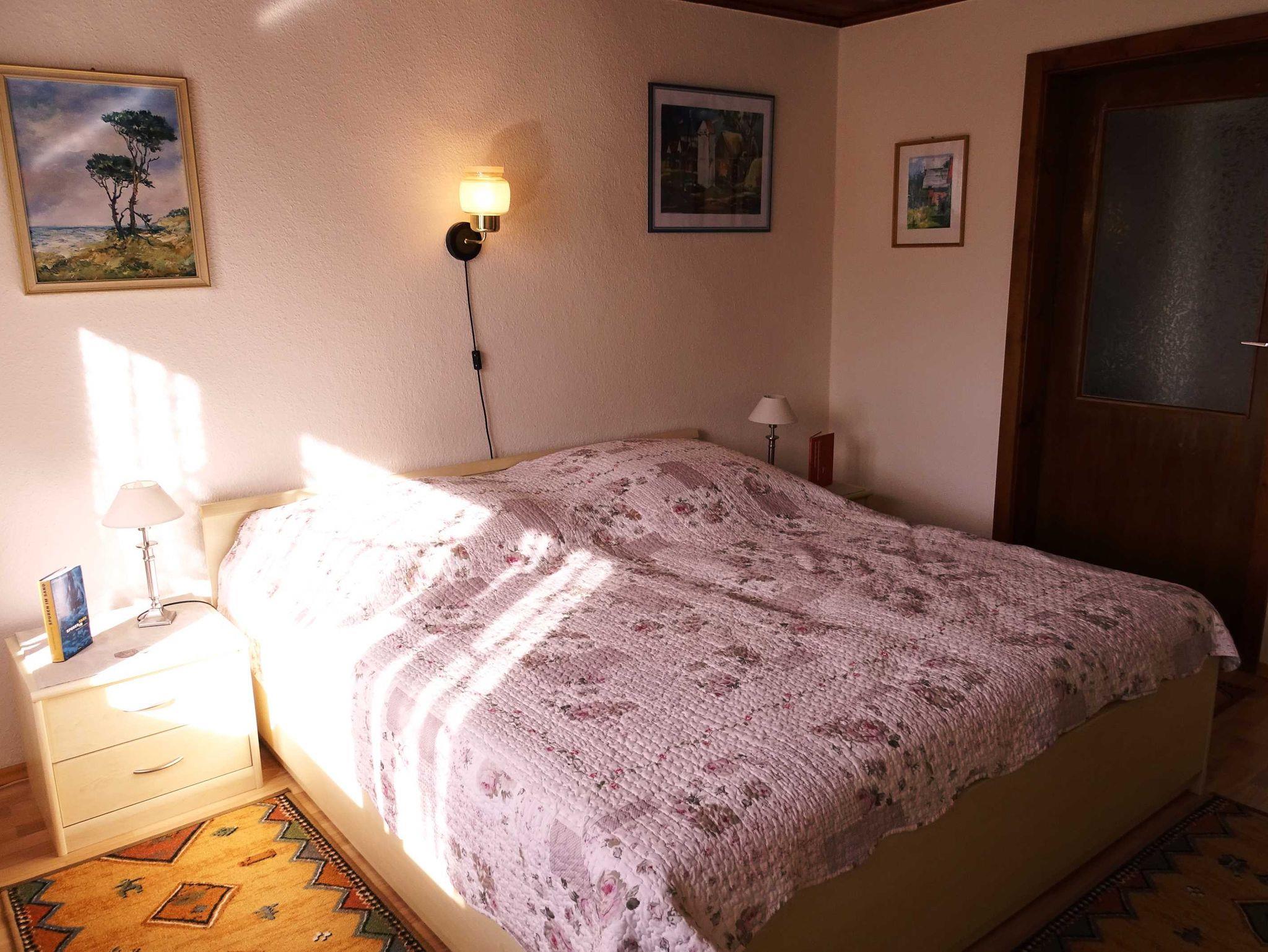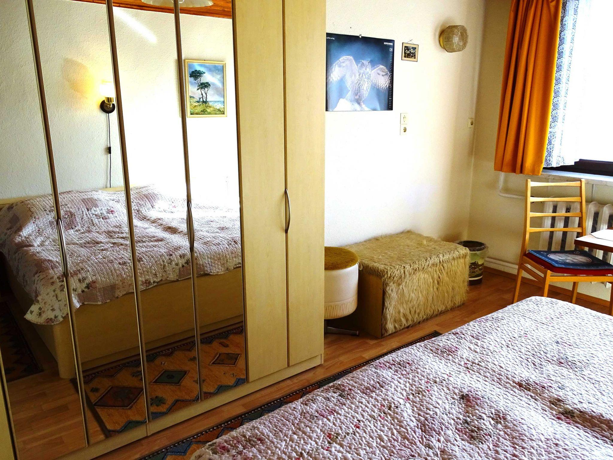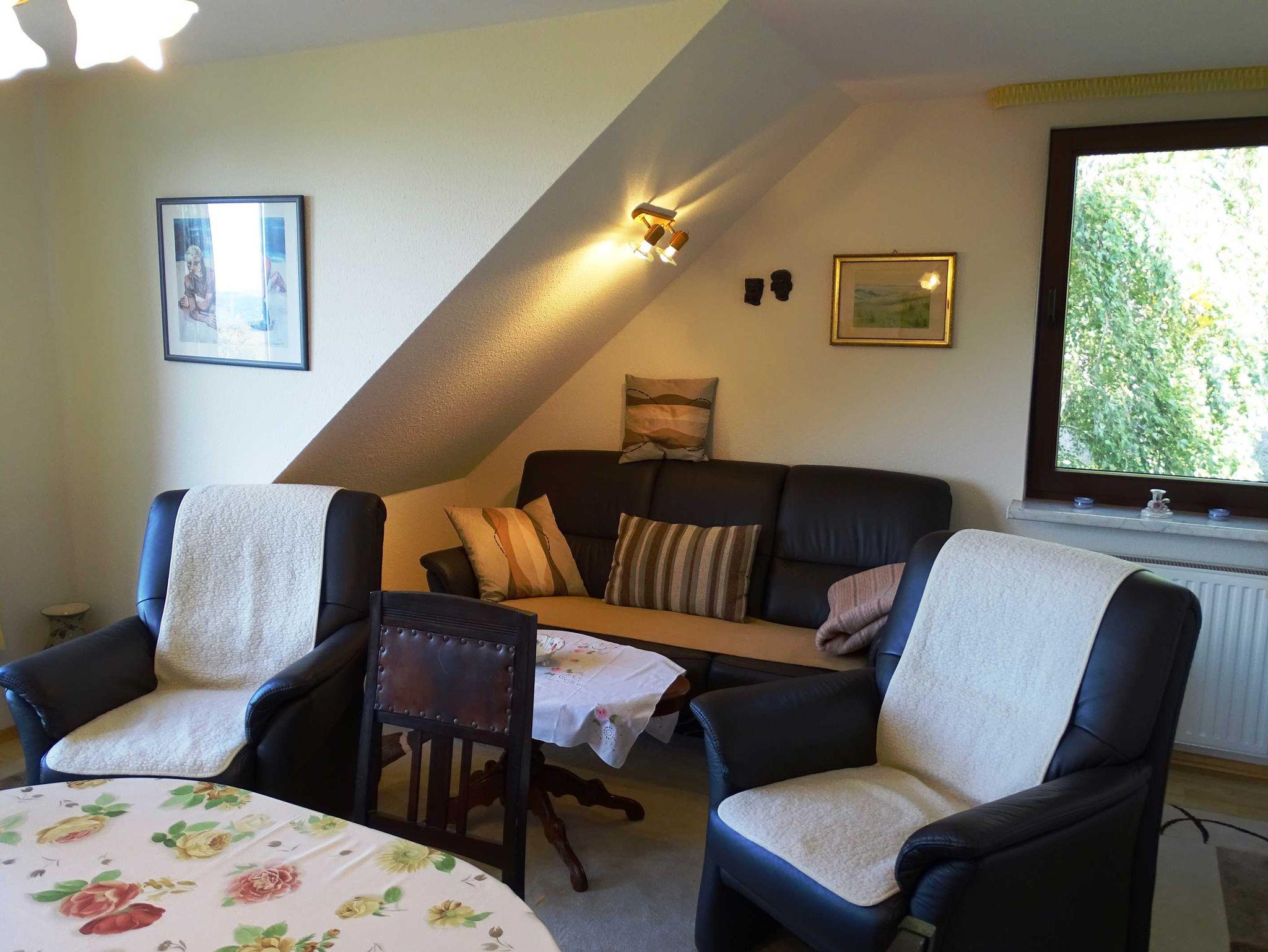 Die komfortabel ausgestattete 60 m² große Ferienwohnung für zwei Personen im Dachgeschoß besteht aus Küche, Wohnzimmer mit Essbereich, zwei Schlafzimmern und Bad mit WC. Die Küche ist komplett ausgestattet. In einem Schlafzimmer befindet sich ein Doppelbett und im anderen Schlafzimmer eine Einzelliege. Das Bad hat eine Badewanne mit Handdusche und WC.