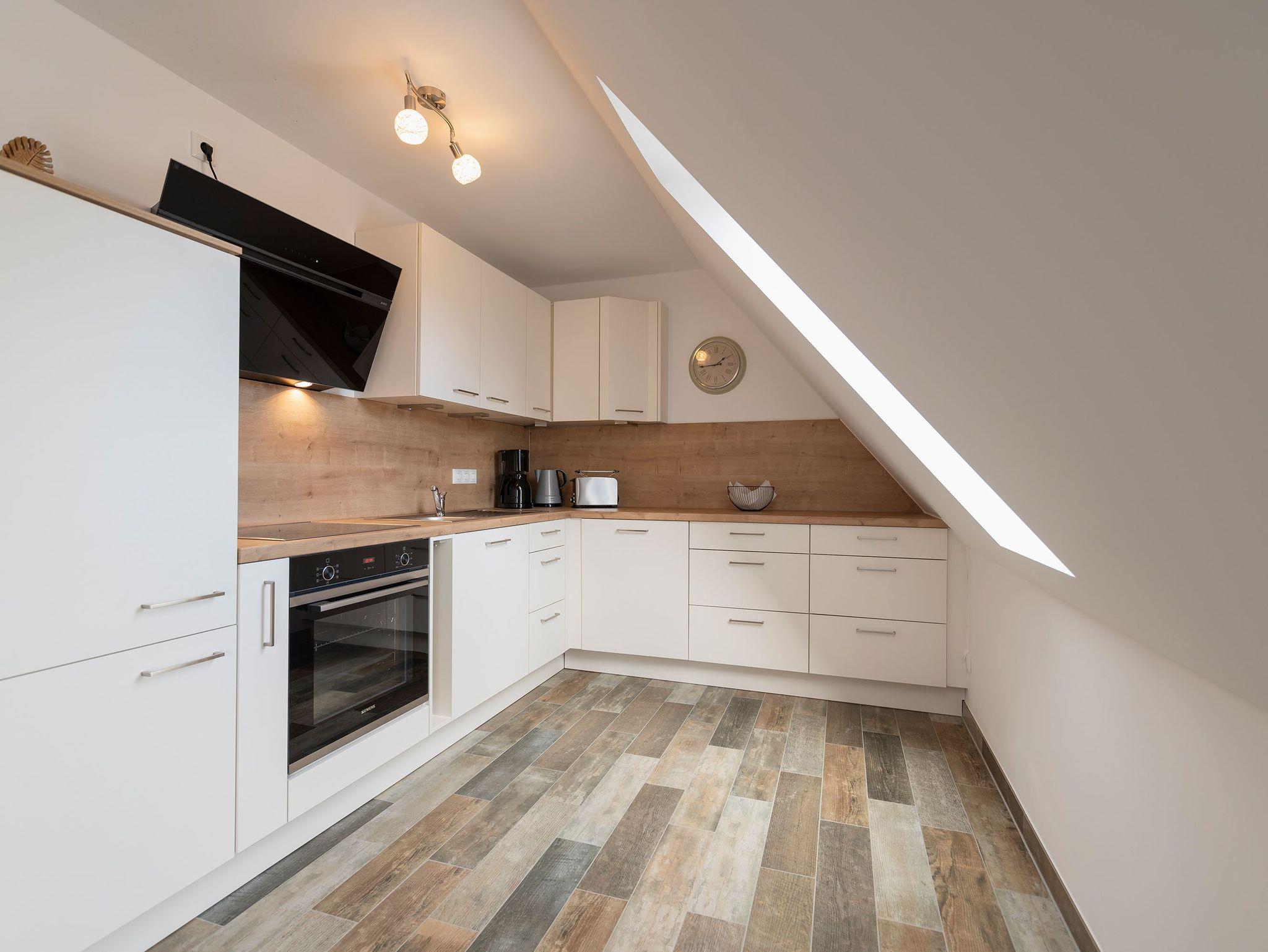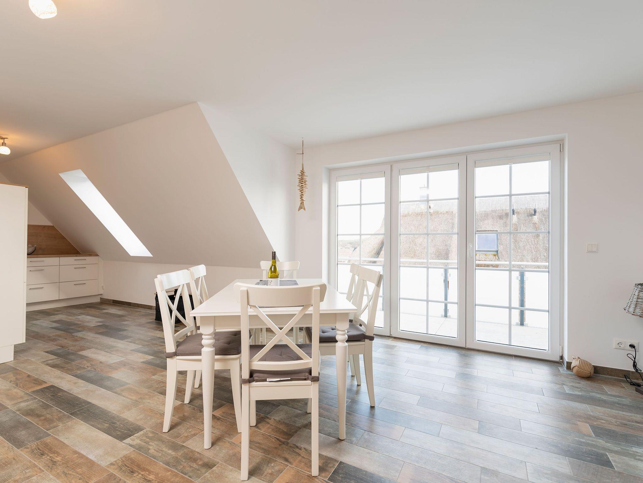 Die voll ausgestattete Küche und der angrenzende Essbereich mit Platz für sechs Personen laden zu gemeinsamen Mahlzeiten ein, während der Kamin gemütliche Stunden verspricht. Der Balkon, zugänglich vom Essbereich, ermöglicht entspannte Momente im Freien. Die obere Etage beherbergt ein geräumiges Wohnzimmer mit Flat-TV, bequemen Sitzmöglichkeiten und einem Schreibtisch, ideal für Erholung oder auch Homeoffice.
