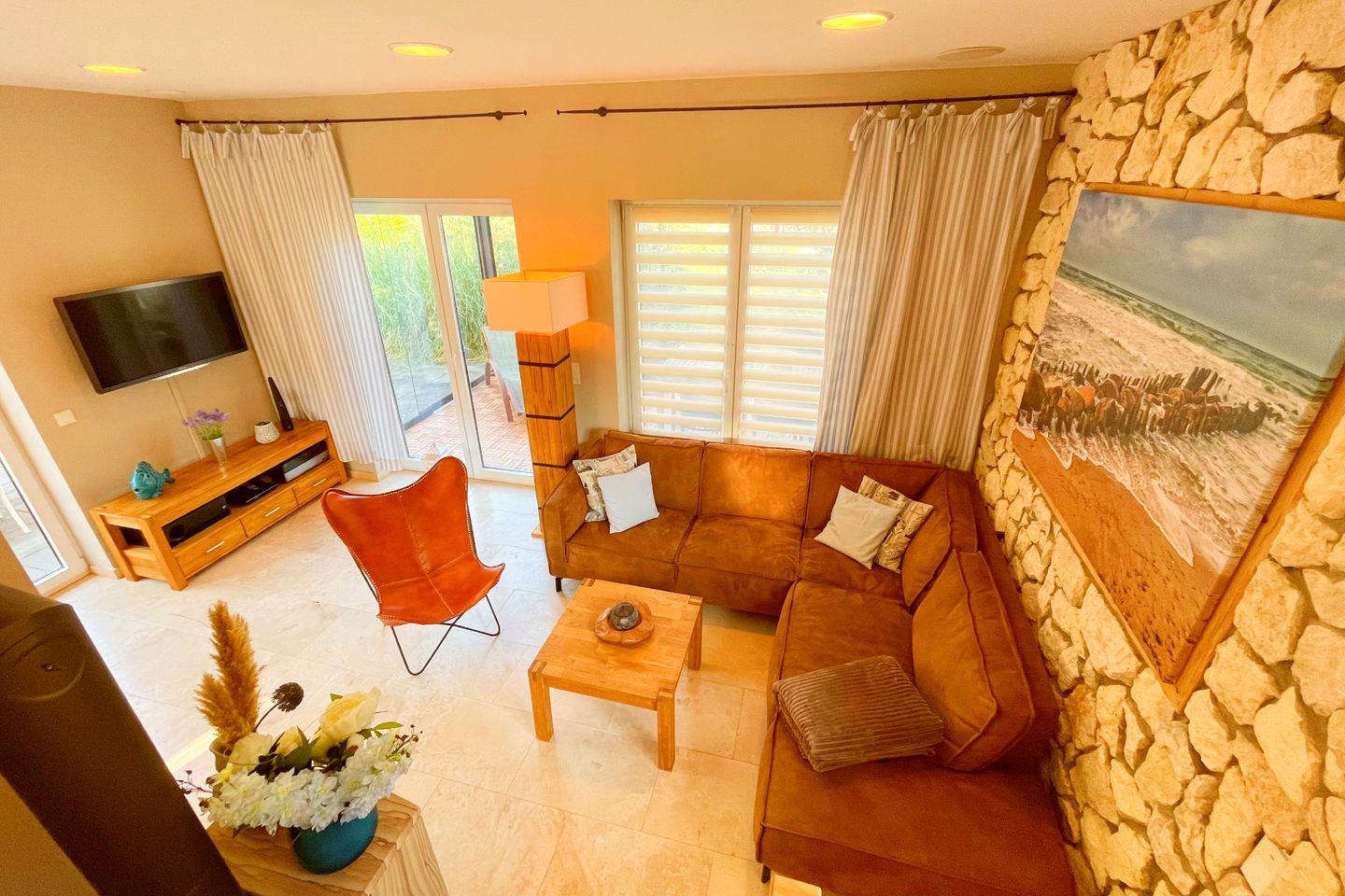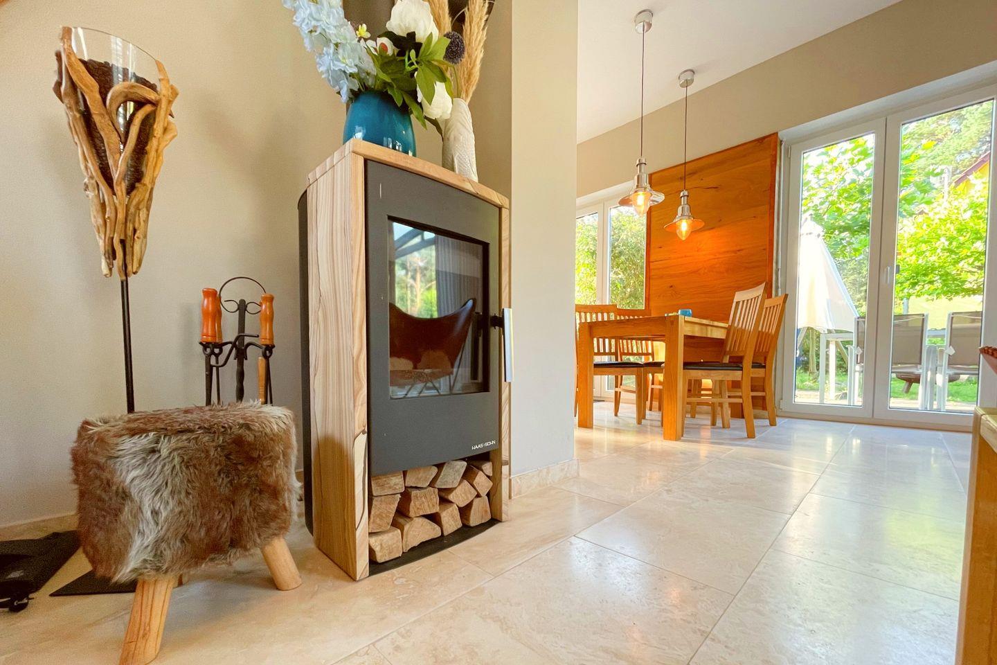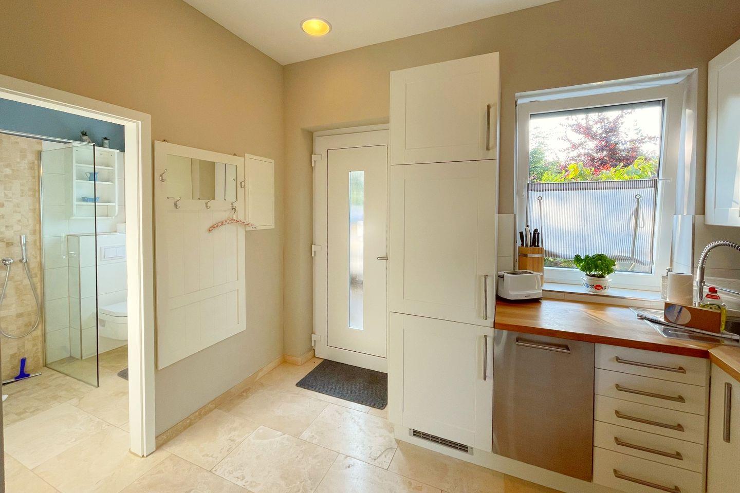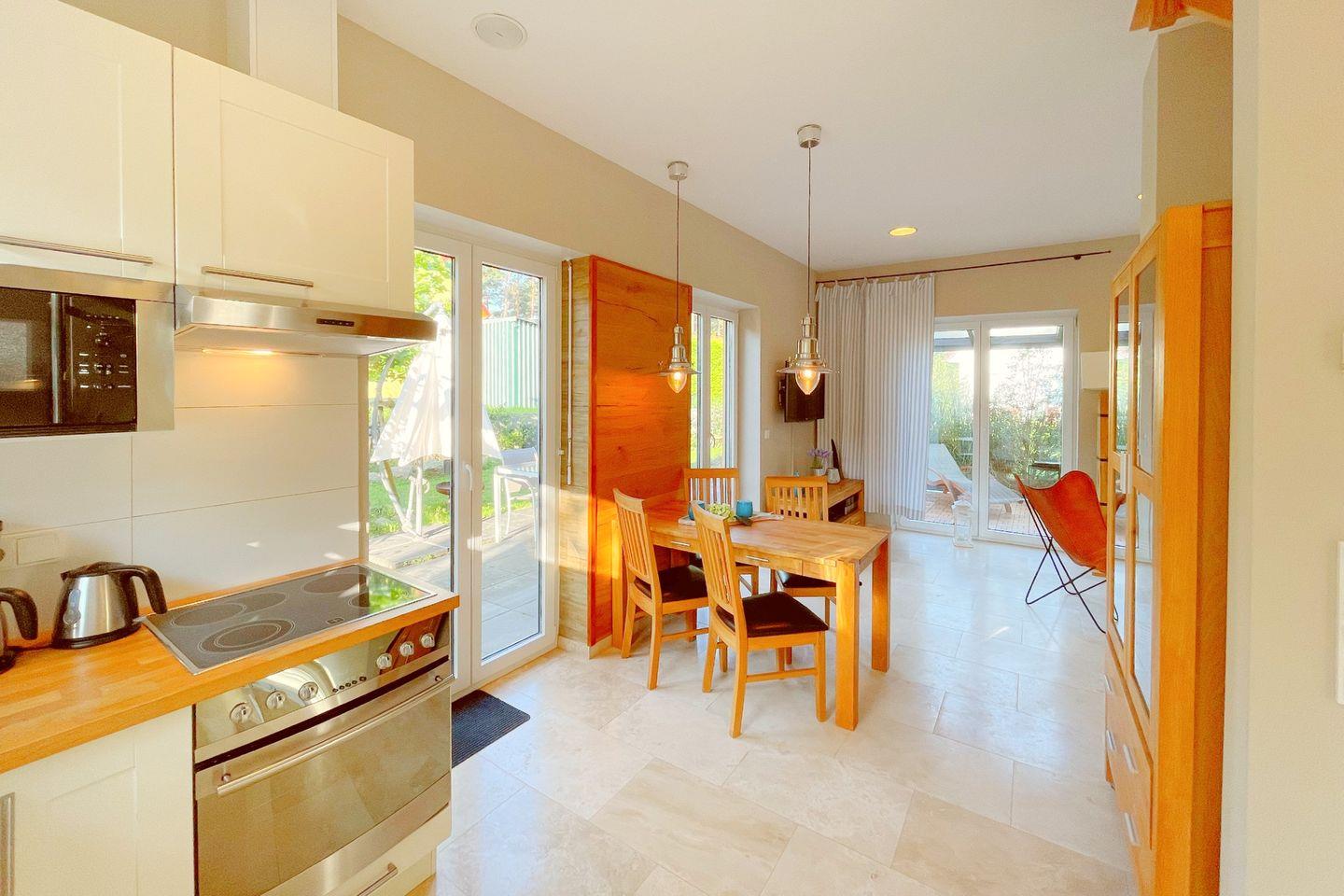 Genießen Sie die modernen Annehmlichkeiten, die diese Unterkunft zu bieten hat. Die Küche ist mit hochwertigen Geräten wie Herd, Backofen, Spülmaschine und Kühlschrank ausgestattet und bietet darüber hinaus alle erforderlichen Küchenutensilien. Der offene Wohnbereich mit digitalem Fernseher und Kaminofen sorgt für eine wohlige Atmosphäre und lädt zum Entspannen und Verweilen ein. Besondere Details wie die bodengleiche Dusche im Badezimmer und die gemütliche Terrasse mit Gartenblick runden das Angebot ab.