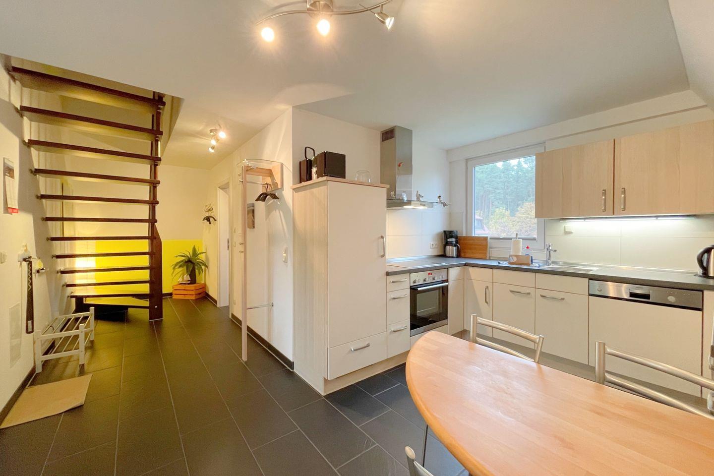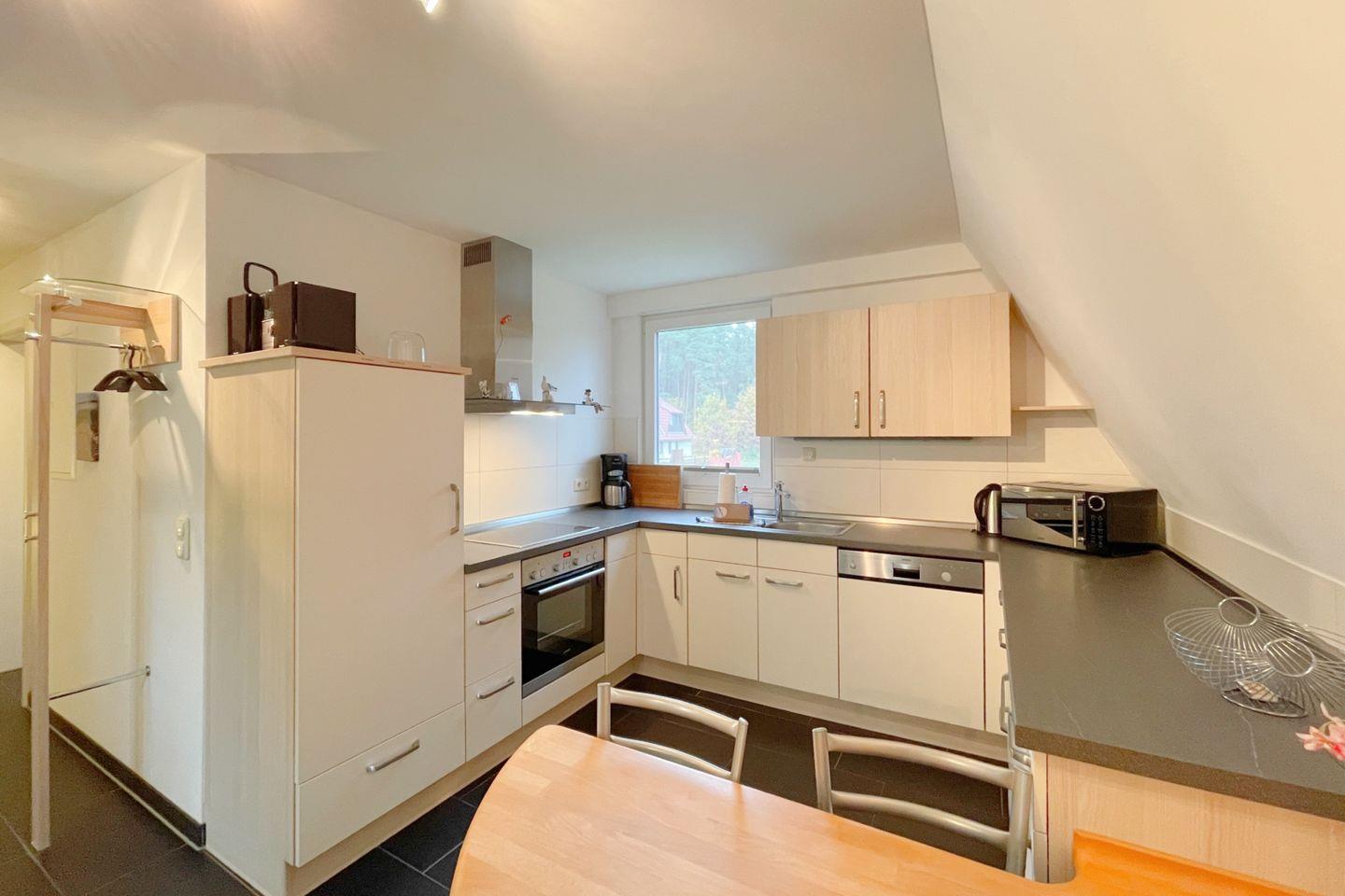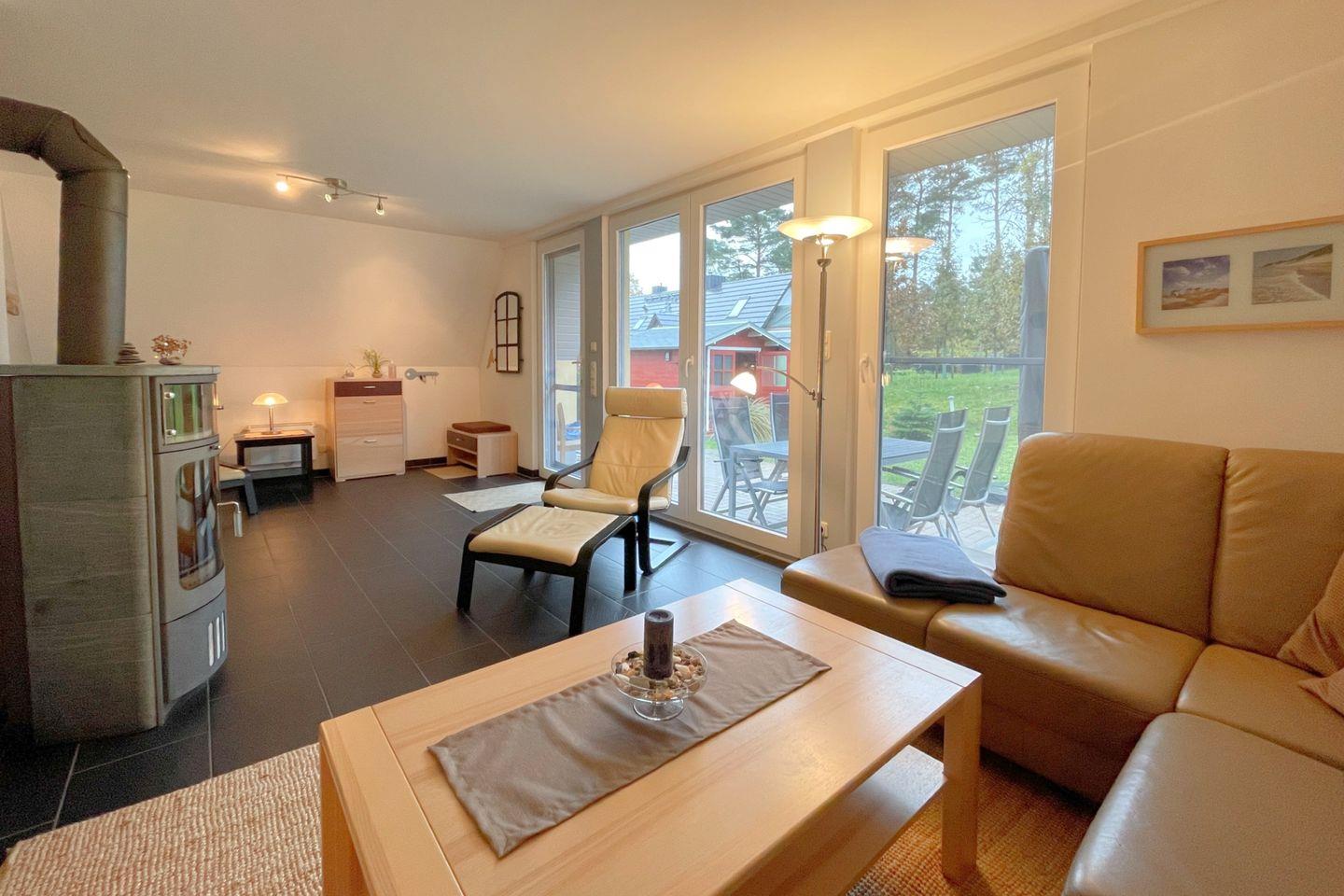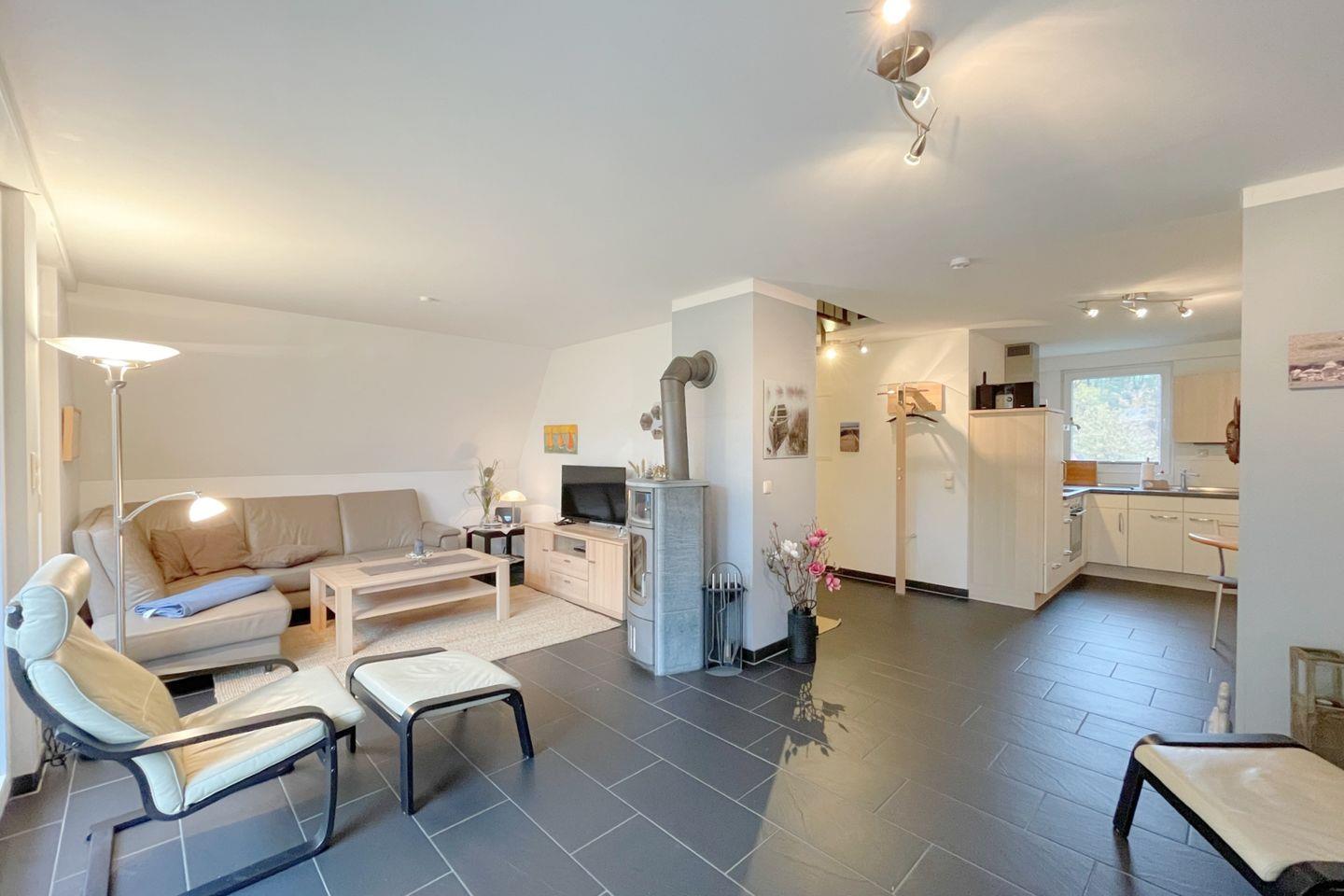 Die modern eingerichtete Küche, die offen zum Wohnzimmer gestaltet ist, lädt dazu ein, gemeinsam leckere Mahlzeiten zuzubereiten. Sie finden hier alle notwendigen Küchengeräte, darunter einen Herd, Kühlschrank, Spülmaschine und eine Mikrowelle. Ein Essbereich für gemütliche gemeinsame Mahlzeiten rundet das Angebot ab. Nach dem Genuss Ihrer selbstgekochten Delikatessen können Sie sich im stilvollen Wohnzimmer entspannen und den Blick auf den zum Verweilen einladenden Kaminofen genießen.