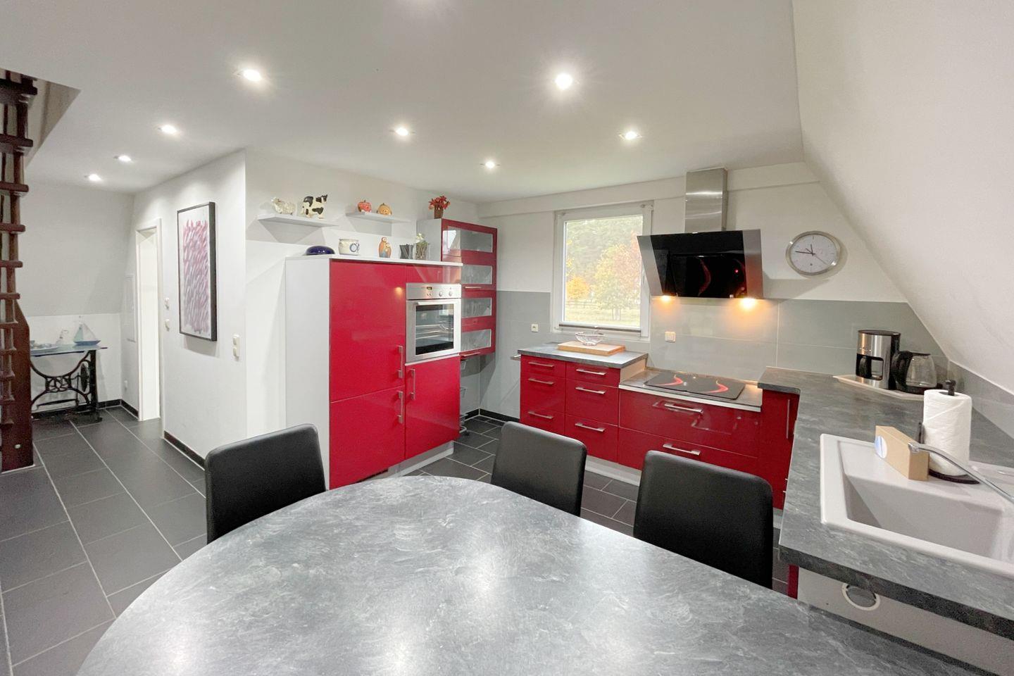 Das Ferienhaus verfügt über insgesamt drei Zimmer, darunter ein geräumiges Wohnzimmer mit einer offenen Küche, die den perfekten Rahmen für gesellige Abende mit Freunden oder Familie bietet. Die moderne Küche ist vollständig ausgestattet und lässt mit ihren hochwertigen Geräten wie einem Cerankochfeld, einem Backofen und einer Geschirrspülmaschine keine Wünsche offen. Hier können Sie kreative Mahlzeiten zubereiten und den Alltag hinter sich lassen. Im Essbereich können Sie gemeinsam speisen und den Tag mit einem leckeren Frühstück beginnen, während das einladende Sofa im Wohnzimmer für entspannte Stunden optimal geeignet ist.