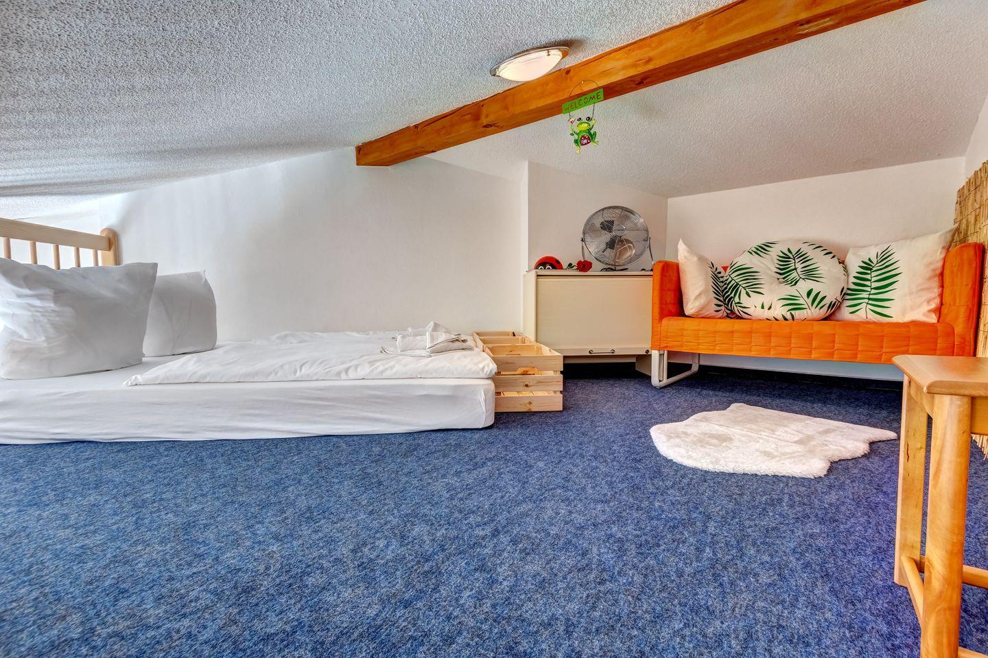 Die Wohnung befindet sich im Obergeschoss und ist gemütlich eingerichtet, mit sichtbaren Holzbalken und einer Galerie, die zwei Schlafmöglichkeiten bietet – ideal für abenteuerlustige Kinder (keine Stehhöhe).