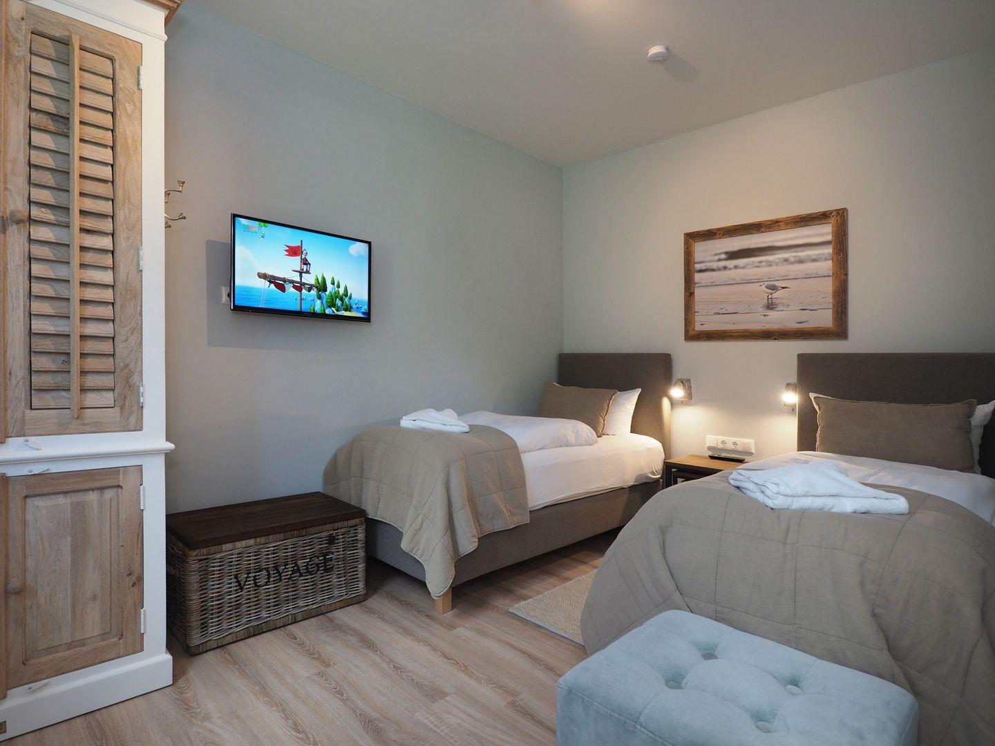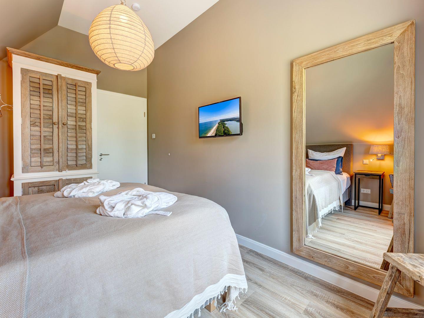 Zwei Schlafzimmer mit Doppelbetten im Obergeschoss und ein Schlafzimmer im Erdgeschoss mit zwei Einzelbetten lassen einen himmlisch schlafen auf Treca-Paris Boxspring Betten (französische Betten-Manufaktur). Auch alle Schlafzimmer sind mit Flatscreenbildschirm mit Sat-TV und Smartfunktion ausgestattet.