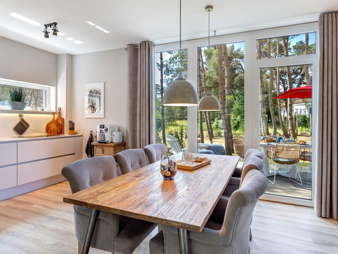 Großzügig öffnet sich die Küche in den Essbereich mit einem großen Holztisch und 6 bequemen Esszimmer-Sesseln. Von hieraus gewinnt man durch die bodentiefen Fenster einen entspannenden Blick in den Garten.